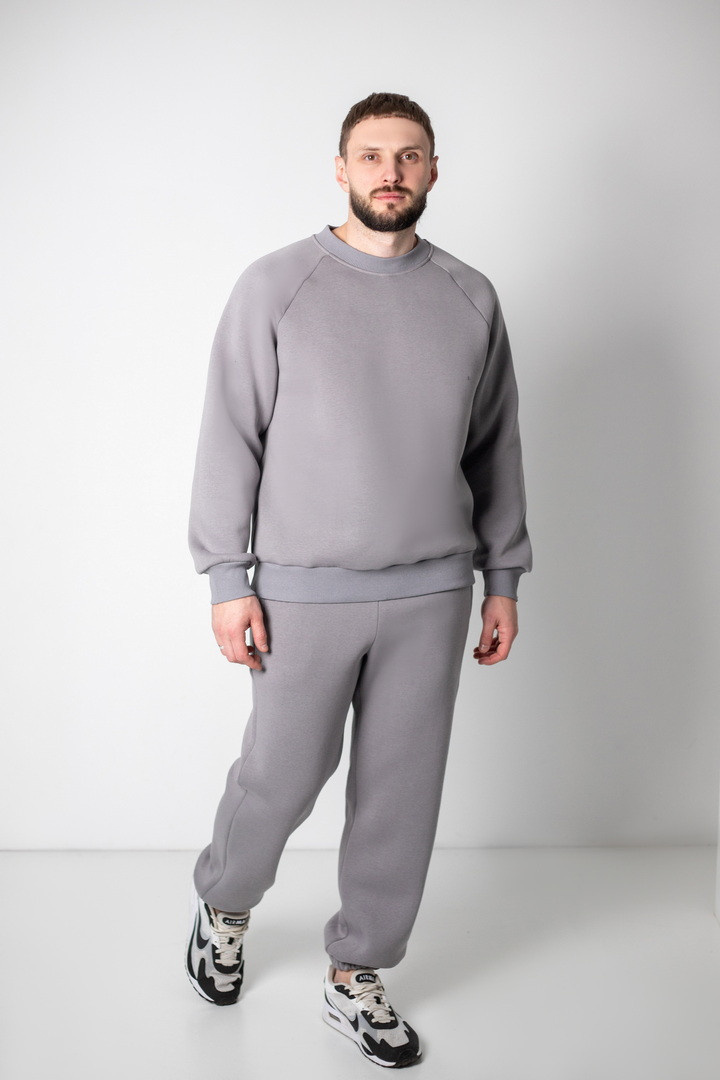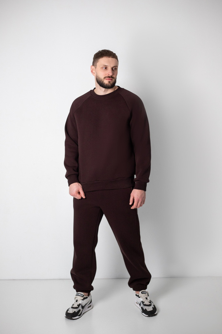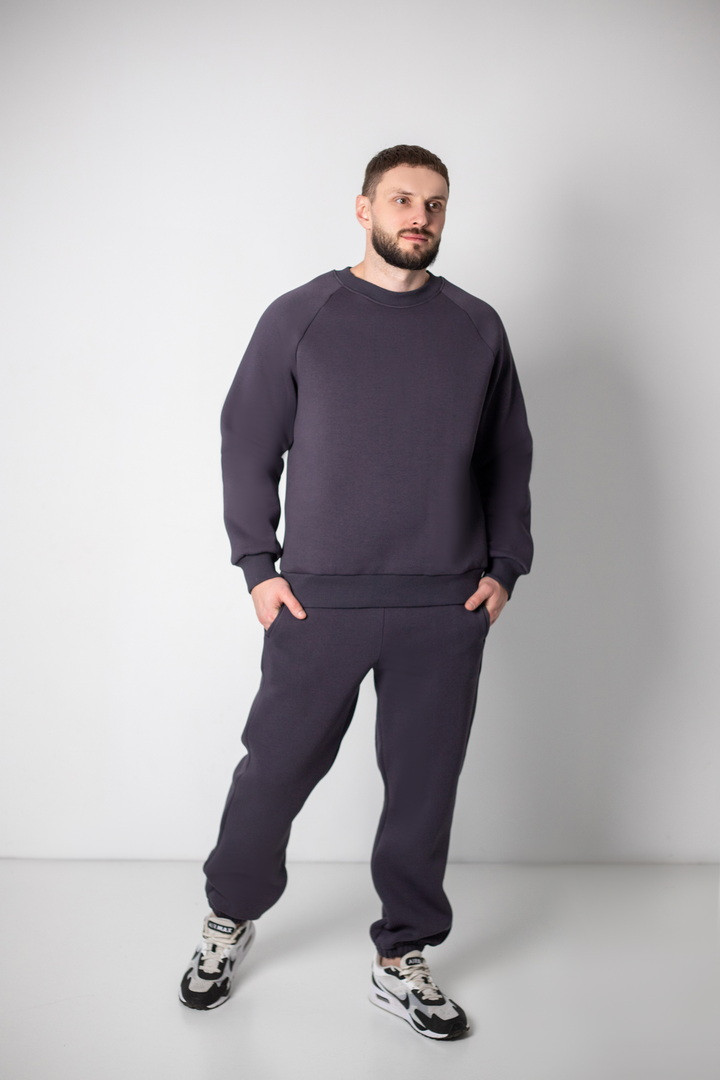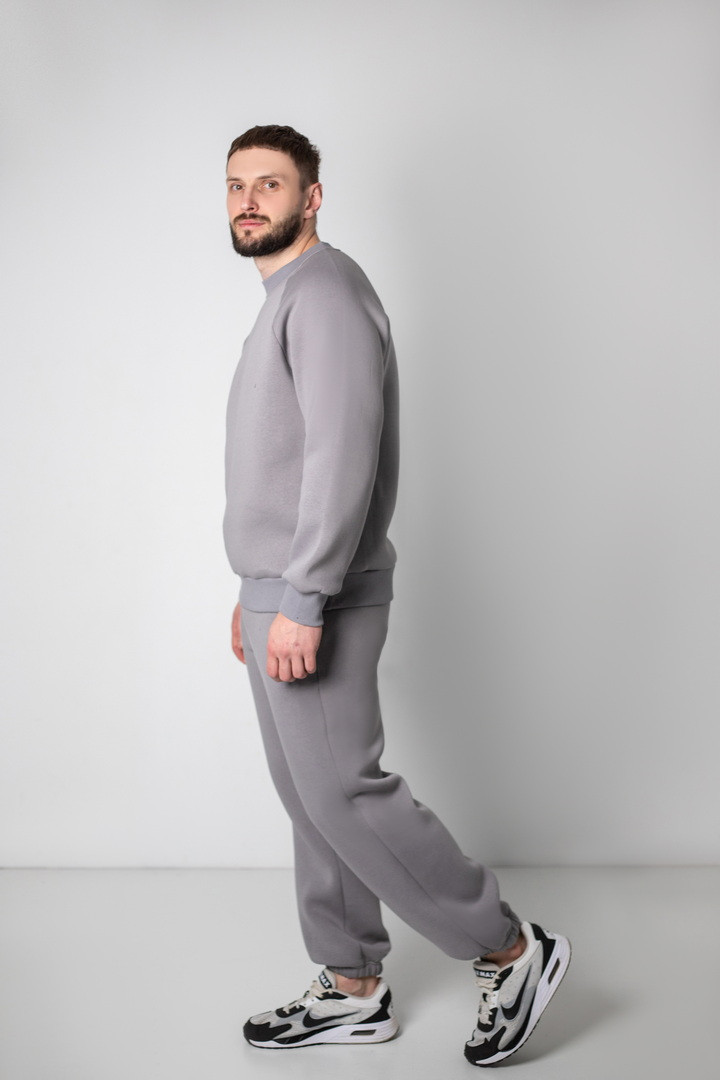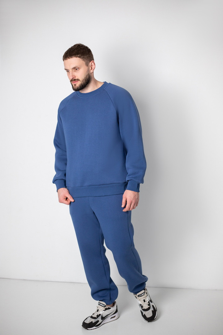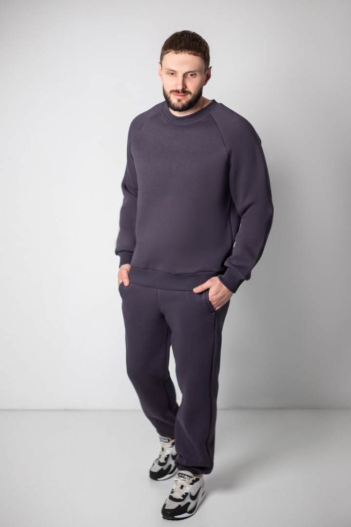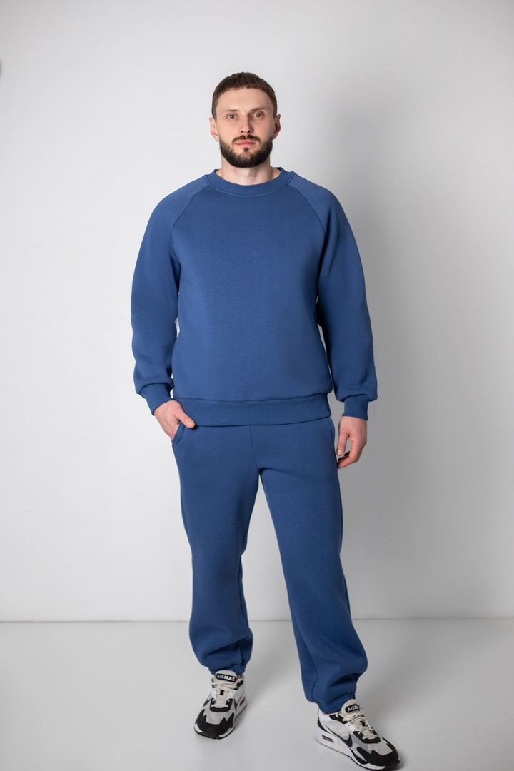 Базовий теплий костюм для чоловіків із триниткового футера з начосом. Костюм складається з світшота та штанів з пришивним поясом на еластичній тасьмі, еластична тасьма по низу виробу сприяє щільному приляганню по щиколотці, для зручності використання в пояс вставлено шнурок. Світшот модного зручного крою oversize, штани стандартного вільного ступеня прилягання. Полотно відмінної якості, не скачується, не линяє. Костюм дуже теплий, стане незамінним в гардеробі чоловіка прохолодної осені, навесні, а також в зимовий період під верхній одяг.
