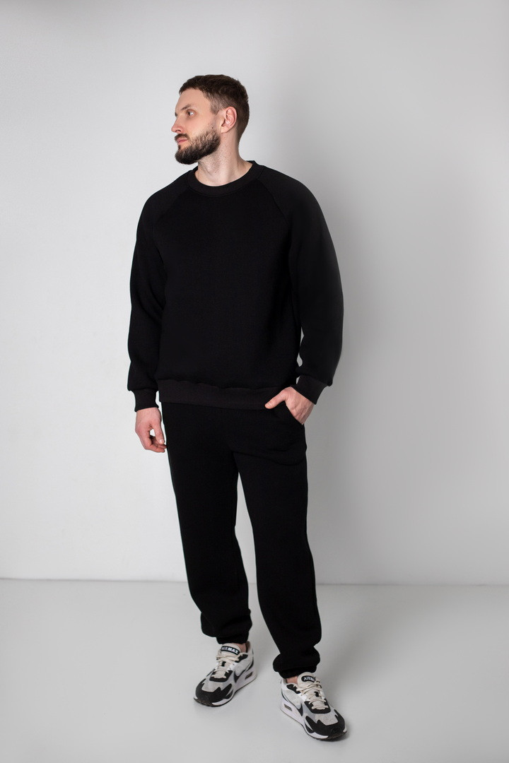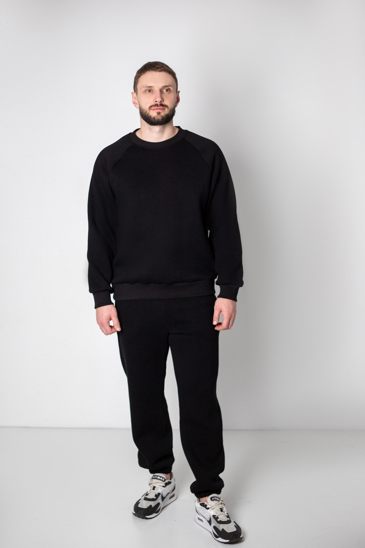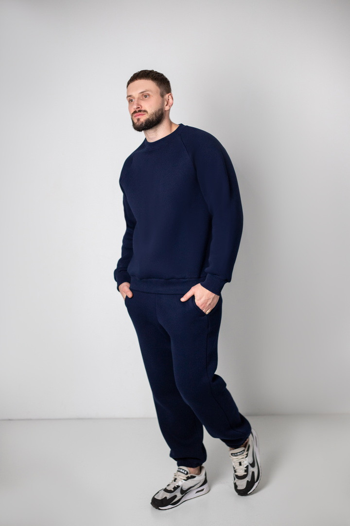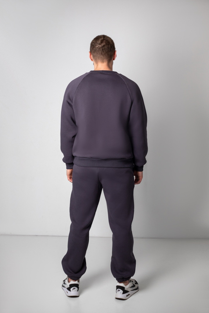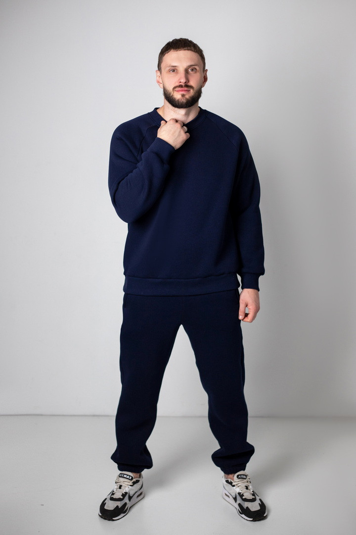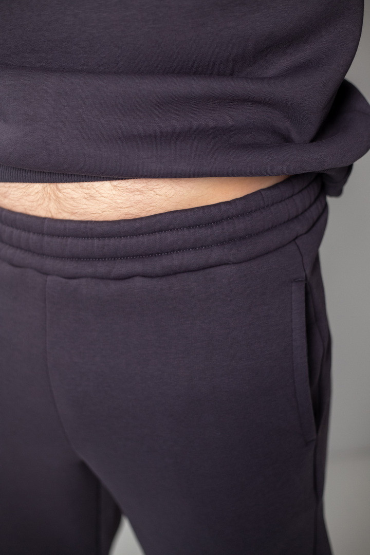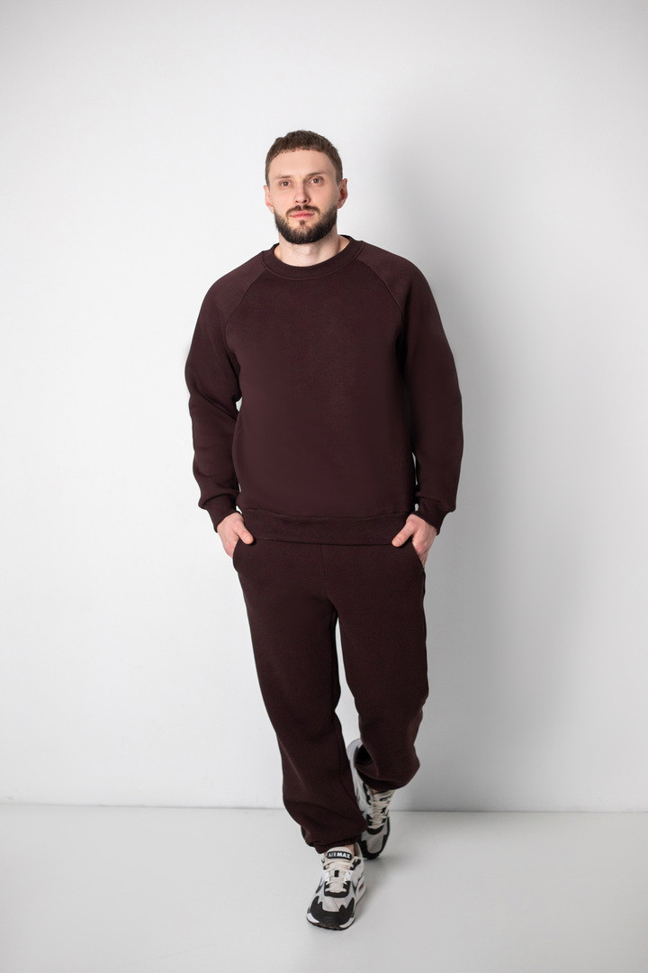 Базовий теплий костюм для чоловіків із триниткового футера з начосом. Костюм складається з світшота та штанів з пришивним поясом на еластичній тасьмі, еластична тасьма по низу виробу сприяє щільному приляганню по щиколотці, для зручності використання в пояс вставлено шнурок. Світшот модного зручного крою oversize, штани стандартного вільного ступеня прилягання. Полотно відмінної якості, не скачується, не линяє. Костюм дуже теплий, стане незамінним в гардеробі чоловіка прохолодної осені, навесні, а також в зимовий період під верхній одяг.