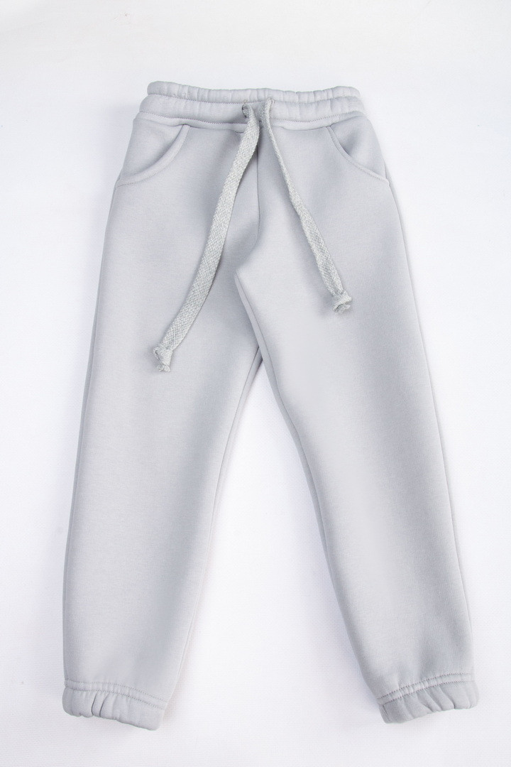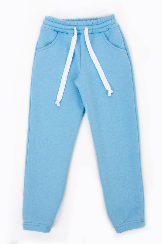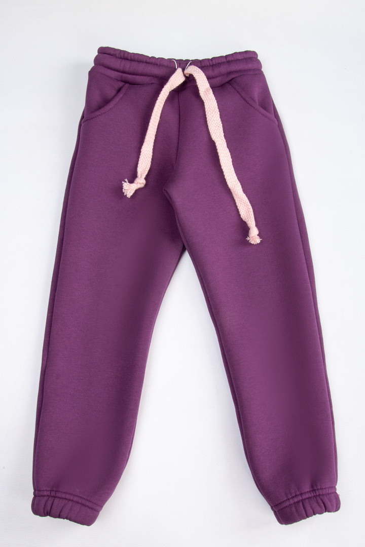 Базові штани для дівчаток з теплого триниткового футера з начосом. Модель з кишенями, на еластичній тасьмі по низу, з широким поясом з еластичною тасьмою, відстрочкою і шнурками. Штани виконані в різних кольорах на будь-який смак. Полотно щільне, має гарні теплоізоляційні властивості, при правильному догляді може давати незначну усадку після прання.
