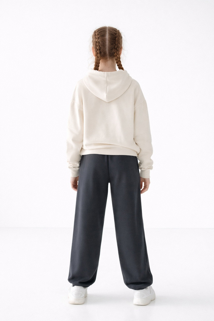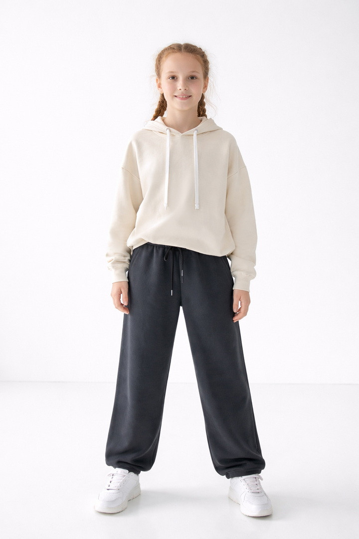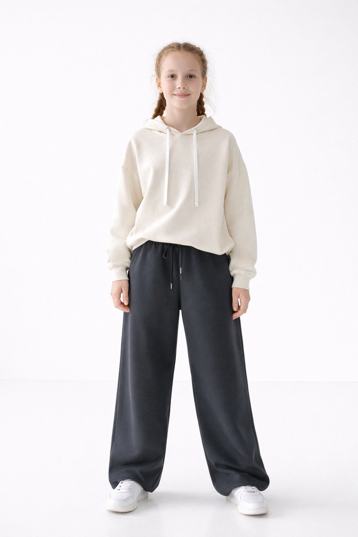 Ці штани — про свободу, комфорт і стиль, який відчувається з першого дотику. Створені з тринитки петлі пеньє, вони м’яко огортають тіло, дарують тепло та ідеально підходять для активних буднів дівчинки. Тканина дихає, не втрачає форму та залишається приємною до шкіри. Сучасний вільний крій виглядає трендово — у цих штанах зручно бігати, гуляти, подорожувати й просто насолоджуватися кожним днем. Пояс на м’якій резинці зі шнурком забезпечує комфортну посадку та легко підлаштовується під фігуру. Особливий акцент моделі — низ штанів із фіксаторами. Вони дозволяють змінювати настрій образу: залишити штани вільними або акуратно зібрати низ, додаючи спортивної динаміки та практичності. Це деталь, яка робить модель універсальною та по-справжньому сучасною.