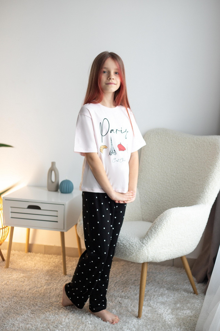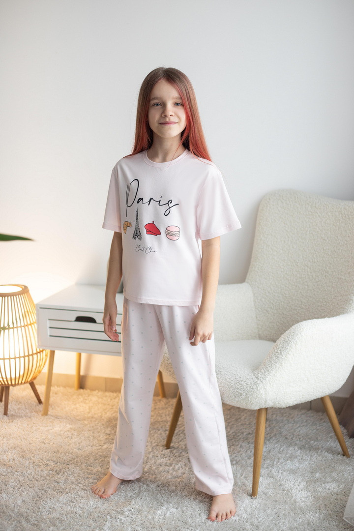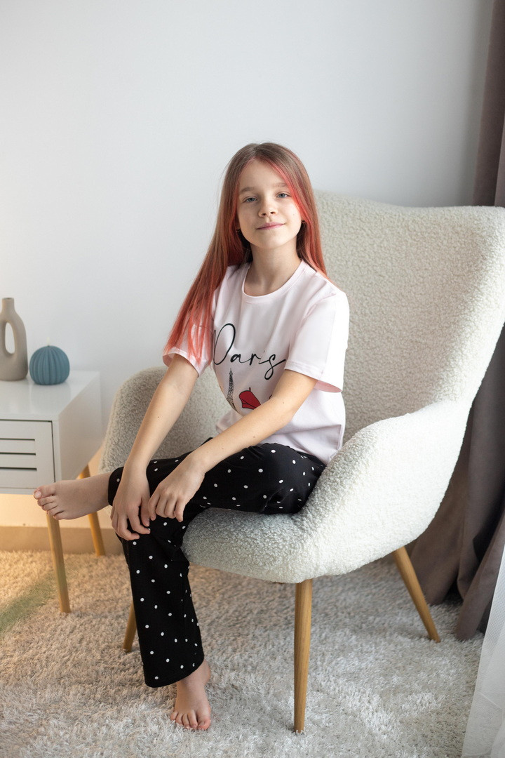 Домашній комплект для дівчат зі стрейч-кулір пеньє — це про комфорт, легкість та настрій. Ідеальний варіант для затишних днів вдома, активних ігор та солодких моментів відпочинку. Футболка має вільний крій та дарує відчуття повної свободи. М’яка тканина ніжно торкається шкіри, не викликає подразнень і забезпечує максимальний комфорт. Стильний принт додає образу грайливості та робить комплект яскравим і сучасним. Штани прямого крою зручно сідають по фігурі завдяки еластичному поясу. Вони не тиснуть, добре тримаються та дозволяють дитині залишатися активною протягом усього дня — від домашніх справ до веселих ігор. Стрейч-кулір пеньє — це високоякісна бавовняна тканина з додаванням еластичних волокон. Вона відзначається м’якістю, гладкою поверхнею та відмінною повітропроникністю. Цей комплект створений для комфорту — стильний, практичний і водночас дуже затишний. Ідеальний вибір для дому, сну або просто гарного настрою.