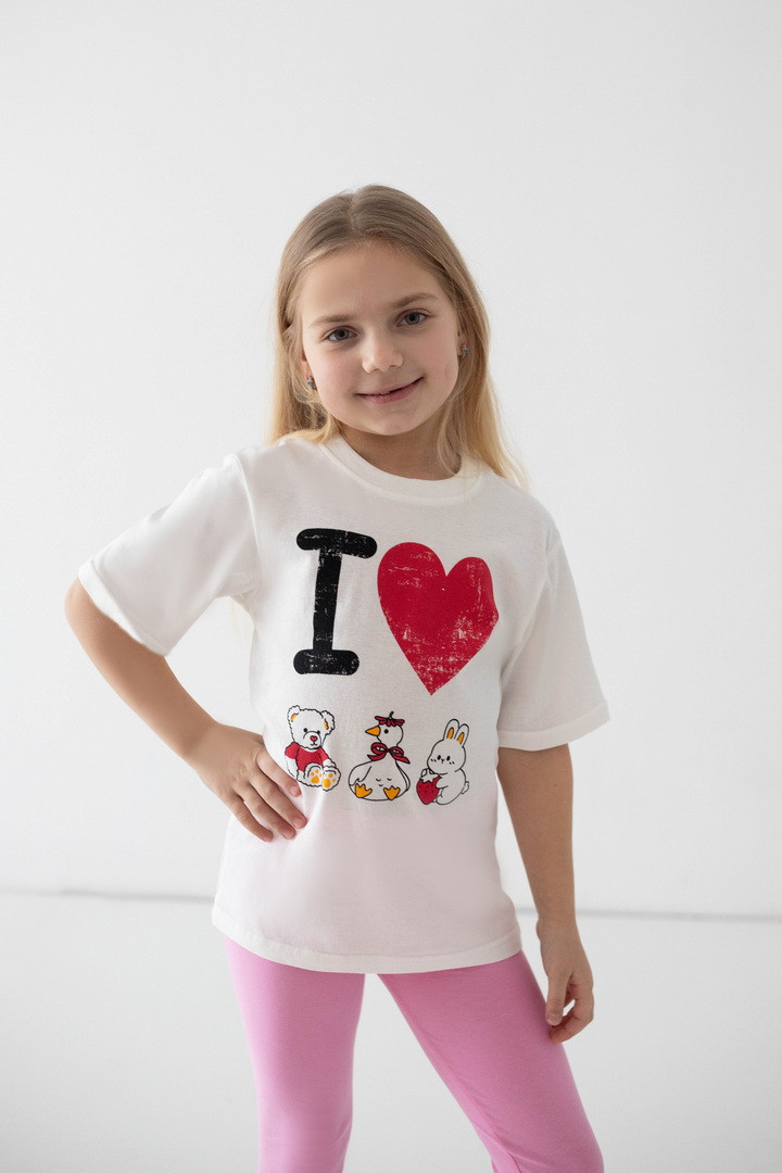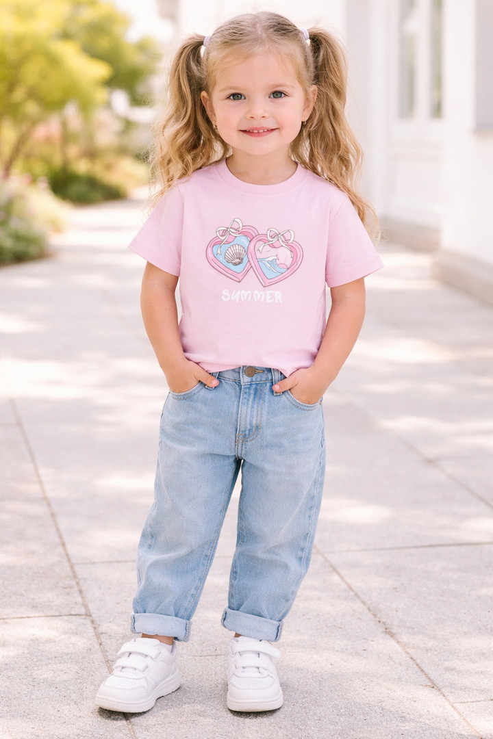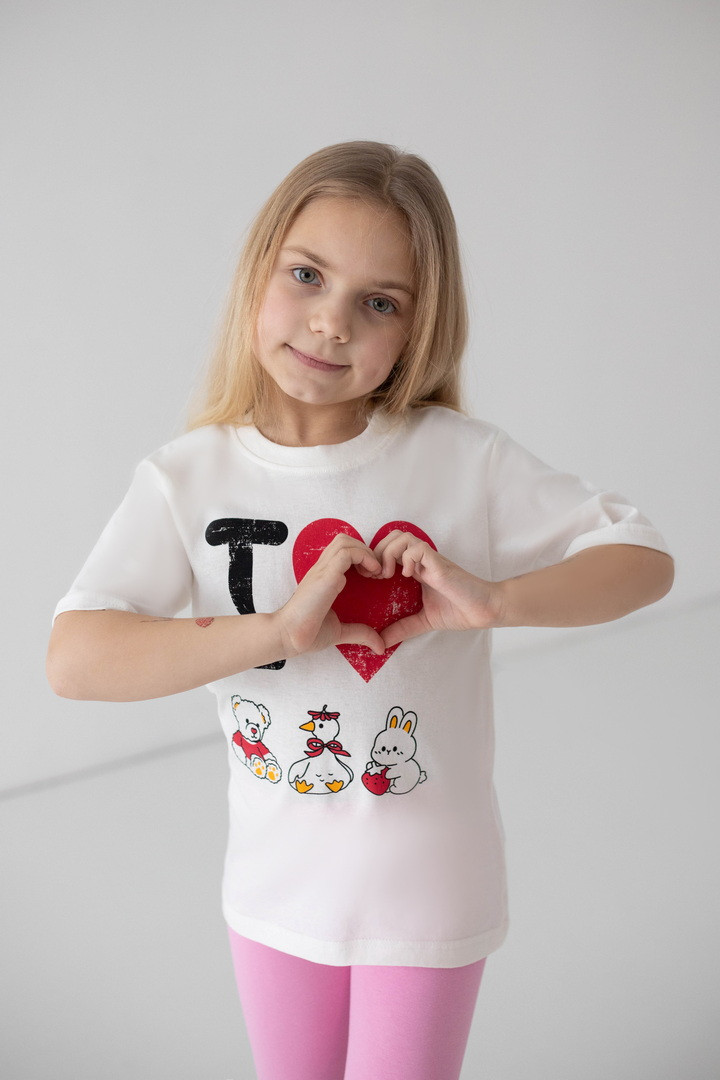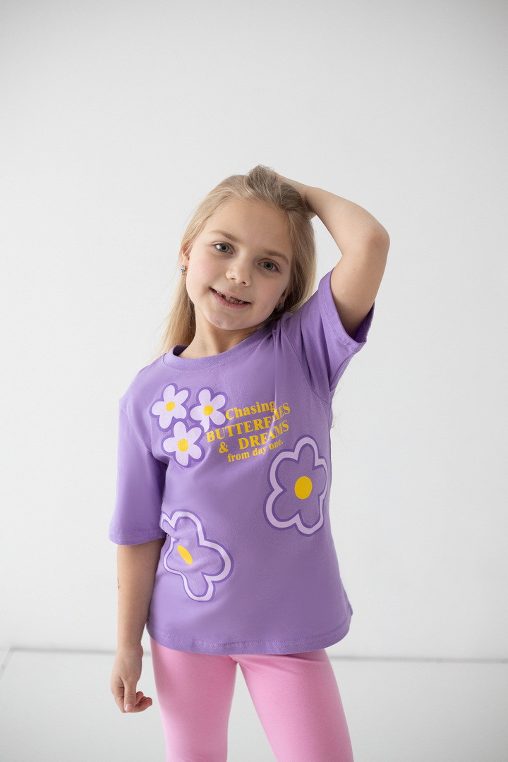 Ця футболка створена для маленьких мрійниць, які люблять комфорт і красу в кожній деталі. Виготовлена з м’якого натурального куліру, вона ніжно огортає тіло, дозволяючи шкірі дихати навіть у найтепліші дні. Тканина легка, приємна на дотик та ідеально підходить для активного щоденного життя дитини. Модель має зручний прямий крій і дарує повну свободу під час ігор, прогулянок та веселих пригод. Короткі рукава та акуратна кругла горловина забезпечують максимальний комфорт, а милий яскравий принт додає образу чарівності й гарного настрою. Вона стане улюбленою річчю в гардеробі дівчинки та подарує відчуття легкості й затишку з першого дотику.