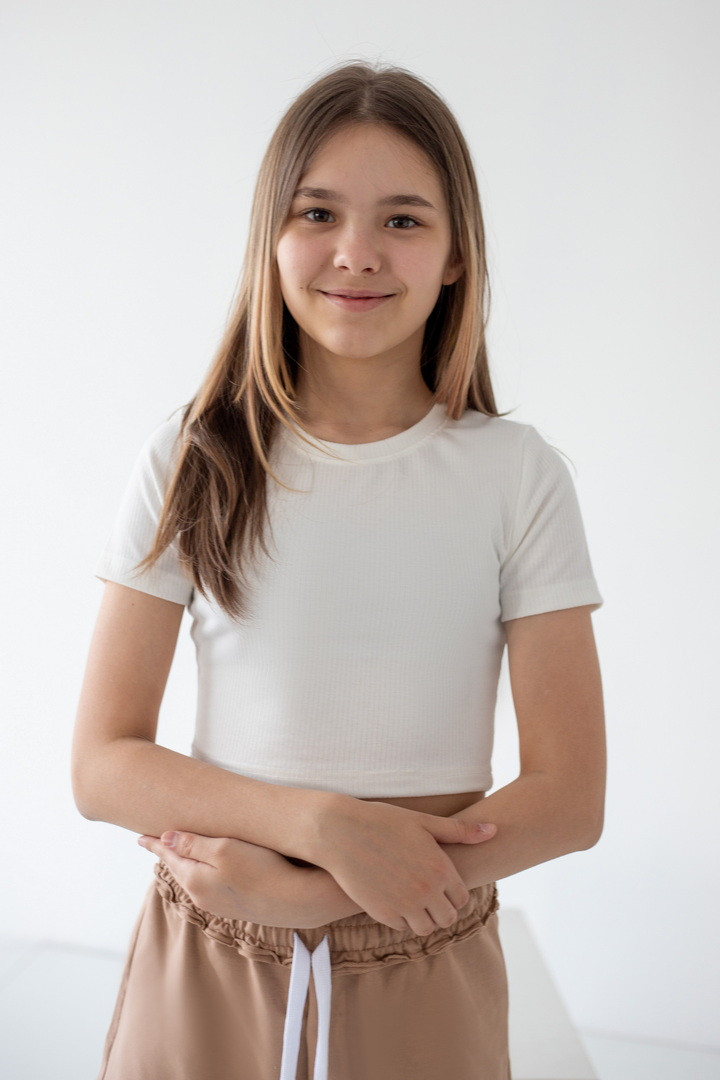 Базовий кроп-топ для дівчат-підлітків з легкого полівіскону. Модель прилеглого силуету з короткими рукавами, округлим вирізом, виконана в декількох кольорах - як світлих, так і темних. Топ відмінно доповнюється будь-якими джинсами з високою посадкою, штанами, шортами і спідницями. Полотно високої якості, завдяки фактурі "рубчик" досить еластичне, добре облягає фігуру.