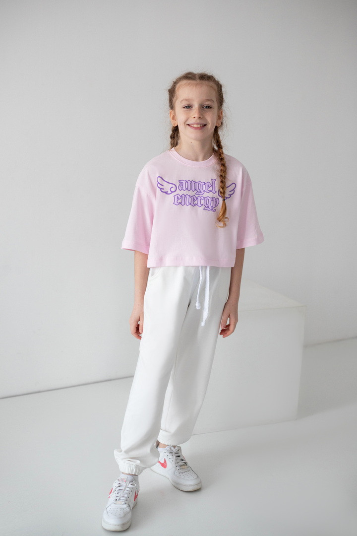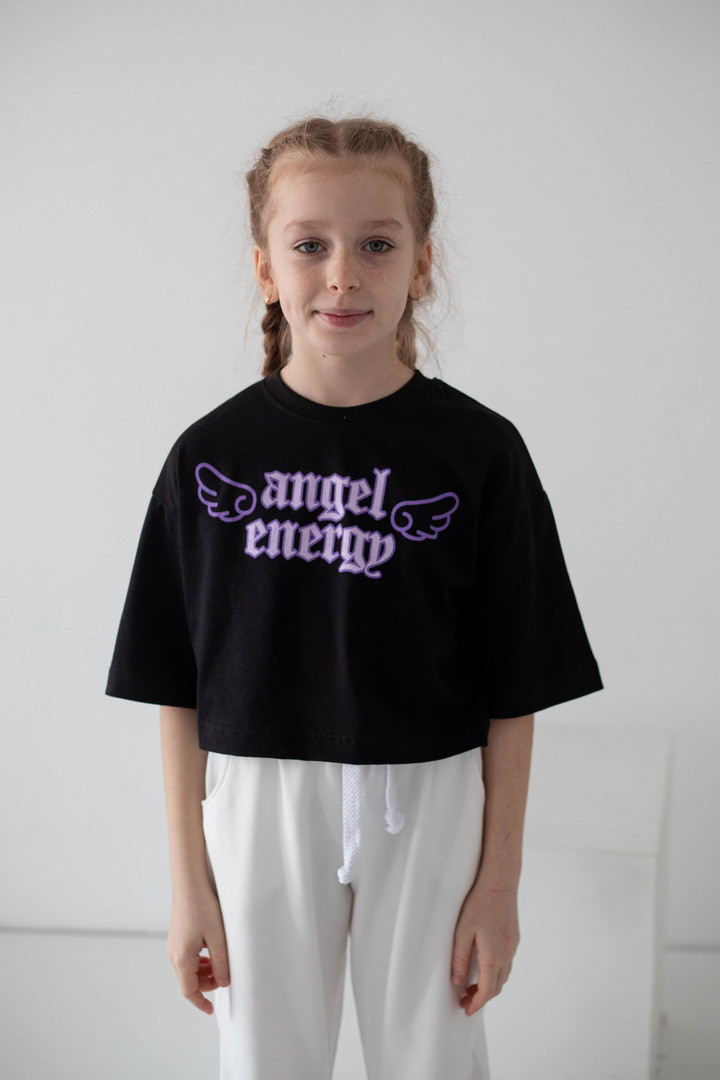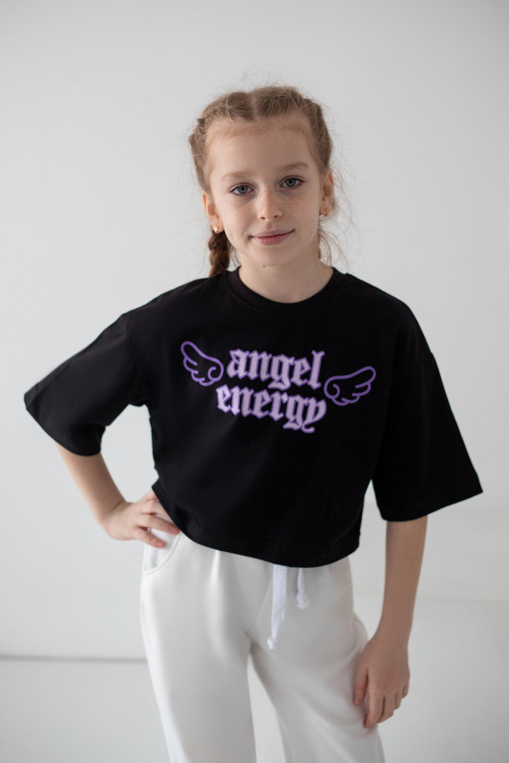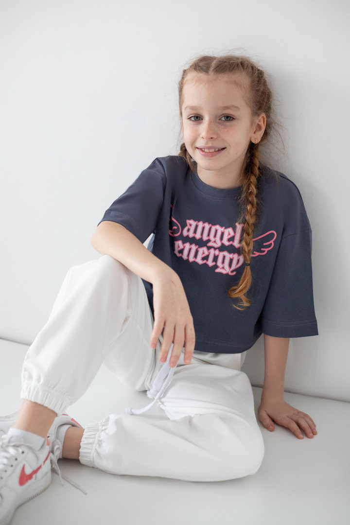 Ця футболка для дівчат — справжній вибух стилю та комфорту, який одразу закохує в себе з першого погляду. Вона створена для тих, хто любить виглядати модно, почуватися вільно та випромінювати впевненість щодня. Модель виконана з натурального куліру — легкої, м’якої та дихаючої тканини. Футболка ніжно прилягає до тіла, не парить та дарує відчуття максимального комфорту навіть у найактивніший день. Особлива “родзинка” цієї моделі — стильний принт “Angel Energy” з крилами, який виглядає ефектно та дуже трендово. Це не просто напис — це настрій, емоція, характер. Така футболка додає образу легкості, яскравості й того самого модного вайбу, який зараз обожнюють дівчатка та підлітки. Крій футболки сучасний та вільний — вона красиво сідає по фігурі, виглядає стильно в будь-якому поєднанні та створює модний силует. Це той випадок, коли річ не просто “на сезон”, а стає улюбленою — бо вона зручна, стильна та універсальна.