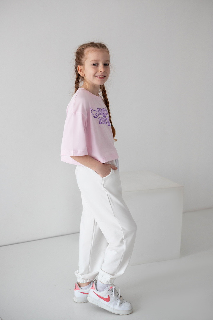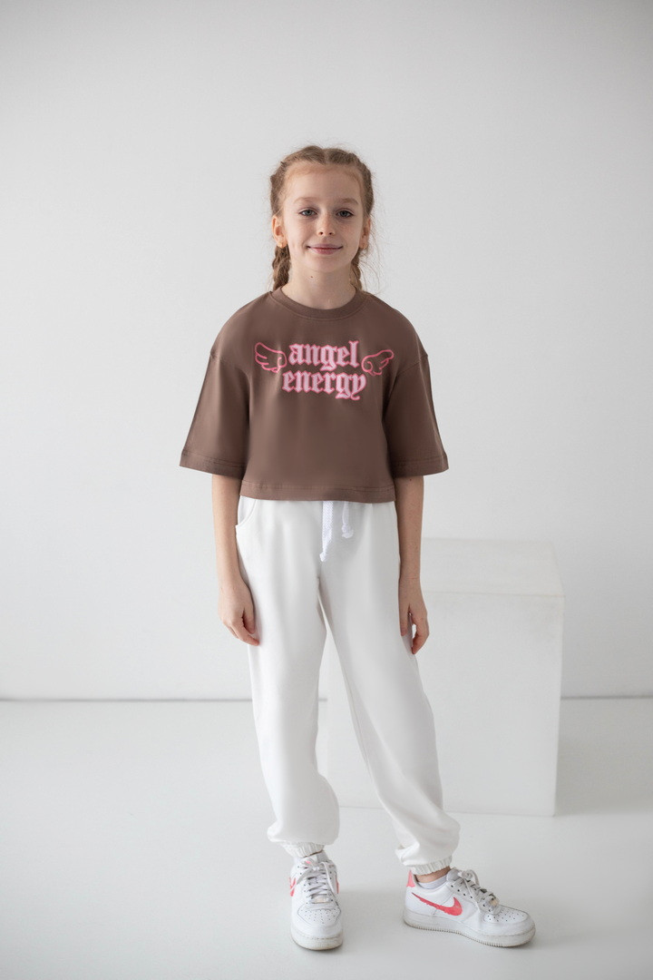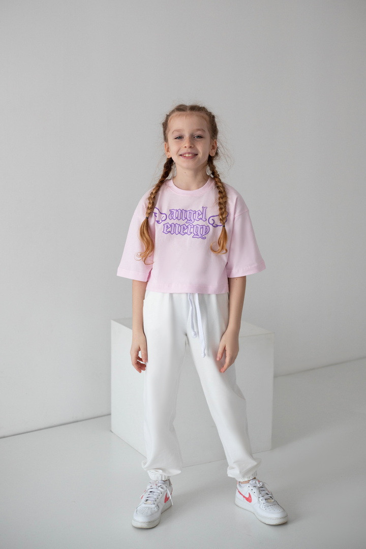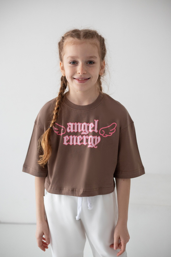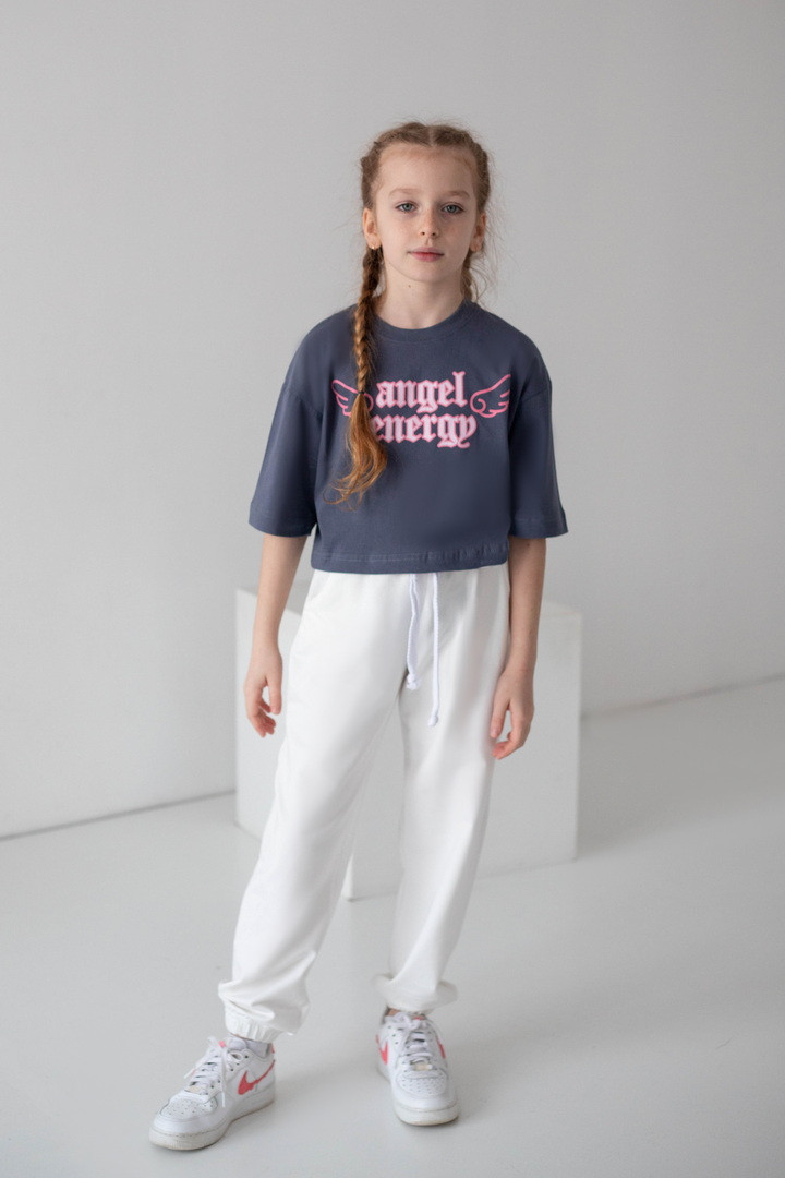 Ця футболка для дівчат — справжній вибух стилю та комфорту, який одразу закохує в себе з першого погляду. Вона створена для тих, хто любить виглядати модно, почуватися вільно та випромінювати впевненість щодня. Модель виконана з натурального куліру — легкої, м’якої та дихаючої тканини. Футболка ніжно прилягає до тіла, не парить та дарує відчуття максимального комфорту навіть у найактивніший день. Особлива “родзинка” цієї моделі — стильний принт “Angel Energy” з крилами, який виглядає ефектно та дуже трендово. Це не просто напис — це настрій, емоція, характер. Така футболка додає образу легкості, яскравості й того самого модного вайбу, який зараз обожнюють дівчатка та підлітки. Крій футболки сучасний та вільний — вона красиво сідає по фігурі, виглядає стильно в будь-якому поєднанні та створює модний силует. Це той випадок, коли річ не просто “на сезон”, а стає улюбленою — бо вона зручна, стильна та універсальна.
