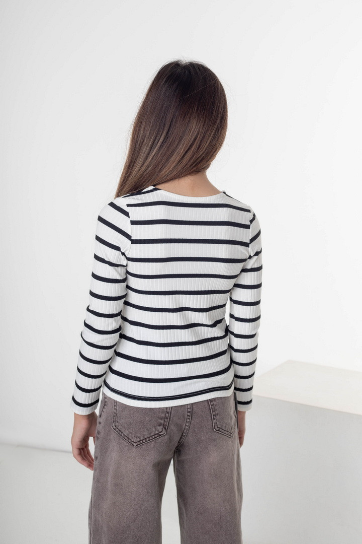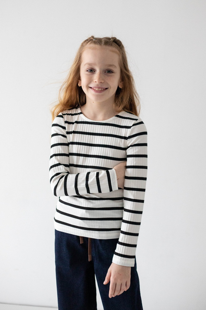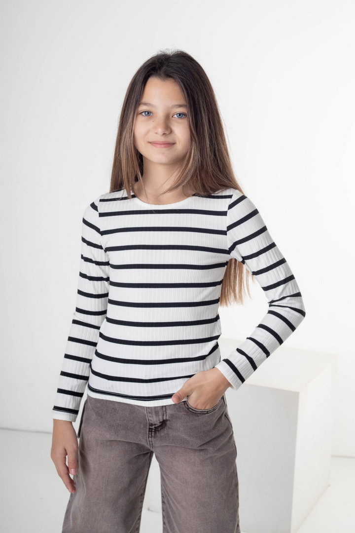 Стильний лонгслів для дівчат із трикотажу в рубчик — ідеальна річ, яка легко впишеться в будь-який гардероб. Завдяки еластичній структурі тканини, виріб м’яко прилягає до тіла, підкреслює силует та дарує максимальний комфорт. Матеріал приємний на дотик та добре пропускає повітря. Класичний крій і кругла горловина роблять модель універсальною, а довгі рукава забезпечують затишок у прохолодну погоду. Горизонтальна смужка додає лонгсліву модного акценту та візуально освіжає образ. Модель виглядає стильно як самостійний елемент, так і в поєднанні з жакетами, жилетами чи сарафанами. Практичний у догляді, не втрачає форму та колір після прання, зберігаючи охайний вигляд надовго.