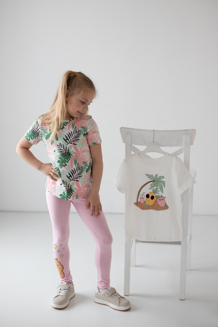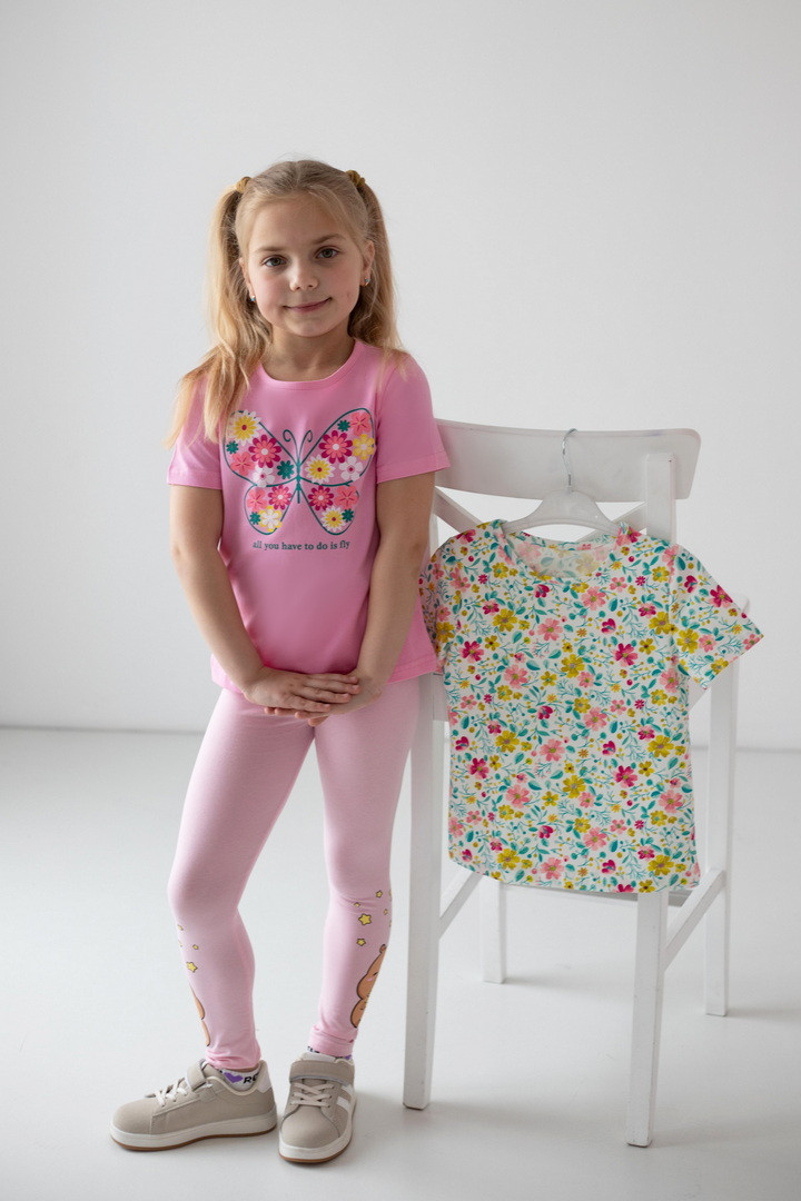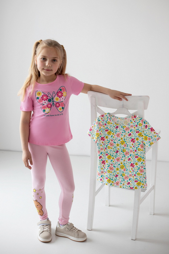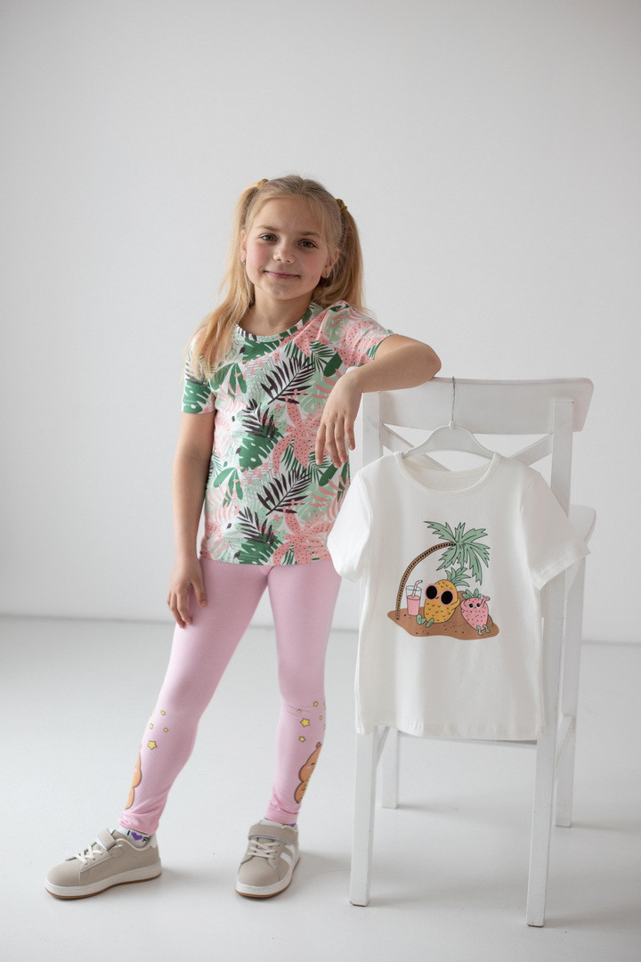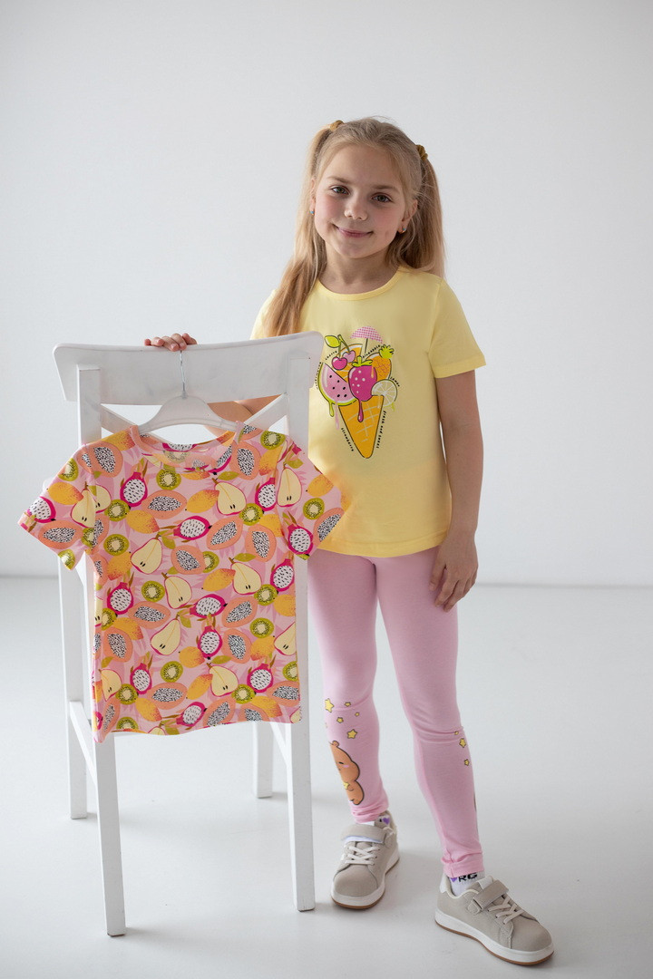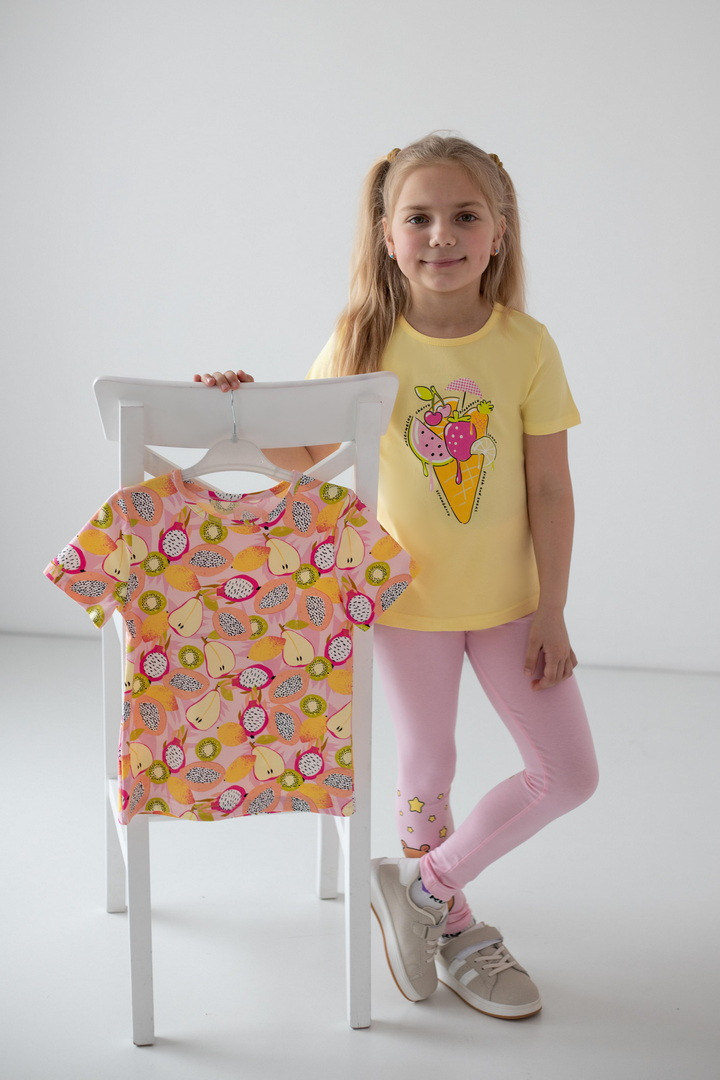 Яскравий, стильний і максимально комфортний комплект із двох футболок для дівчаток — ідеальне рішення для активного літа та щоденних пригод. Модель виконана зі стрейч-куліру пеньє — це трикотажна тканина, яка приємна до тіла, добре пропускає повітря та зберігає бездоганний вигляд. Футболки м’які, еластичні та не сковують, що особливо важливо для маленьких непосид.