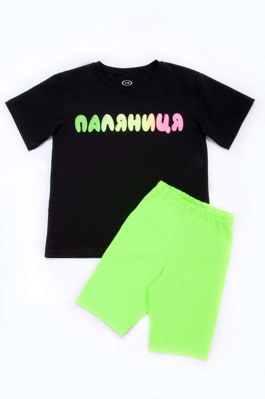Стильний базовий комплект для дівчаток зі стрейч-куліру, складається з подовженої футболки "oversize", виконаної у чорному кольорі з барвистим принтом, а також яскравих велосипедок. Полотно високої якості, не линяє, не дає усадку при правильному догляді, після прання не втрачає яскравості.