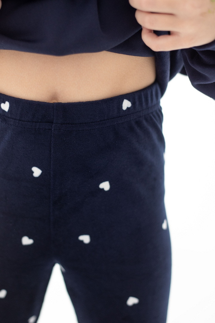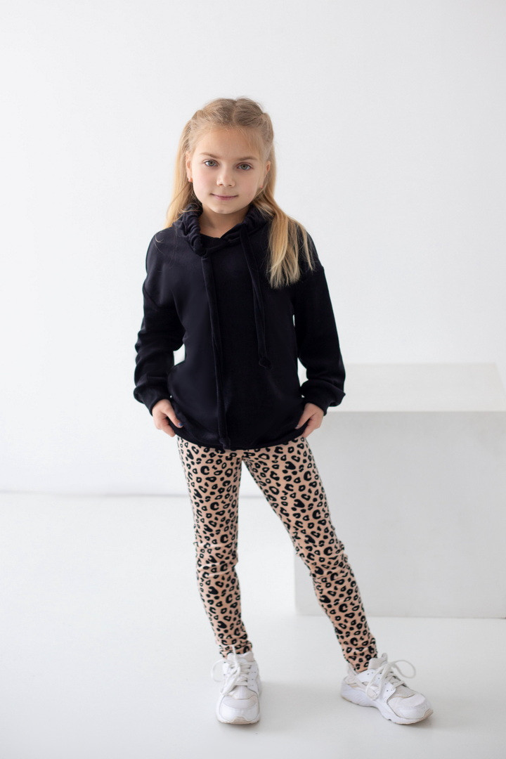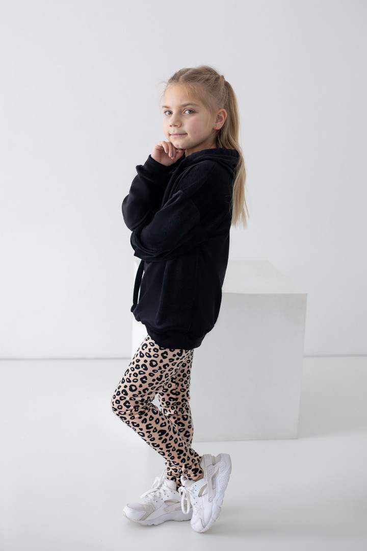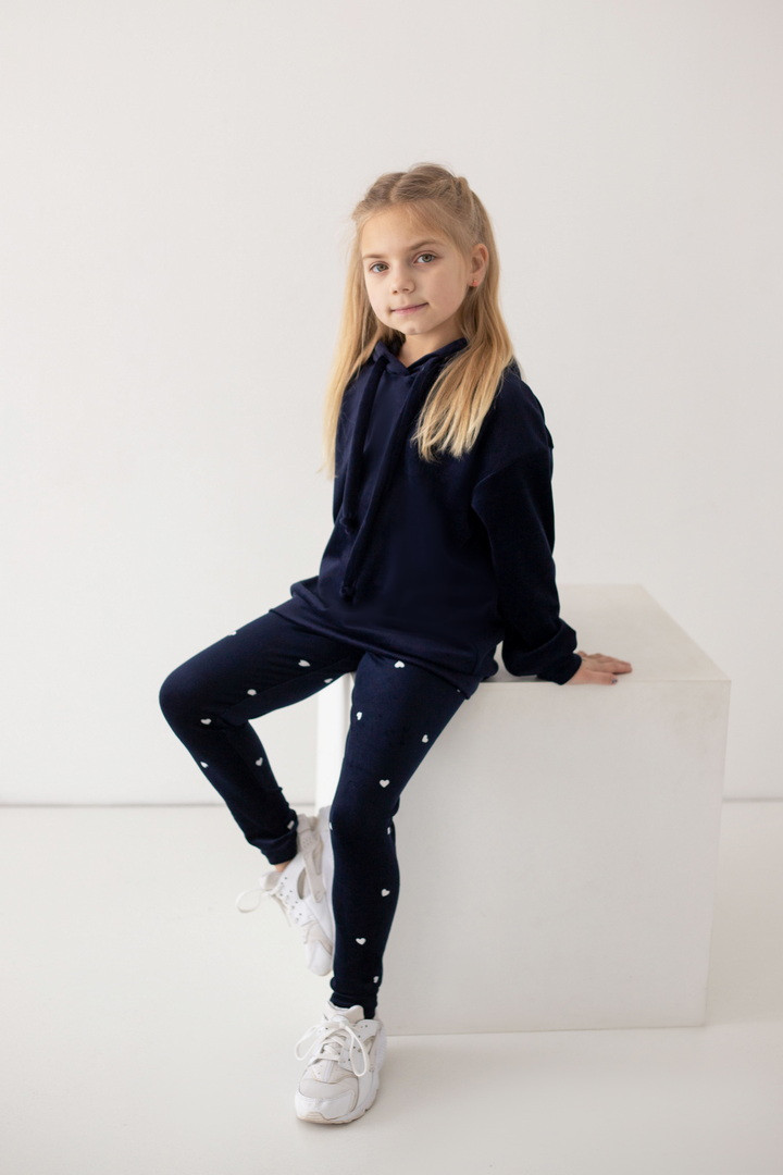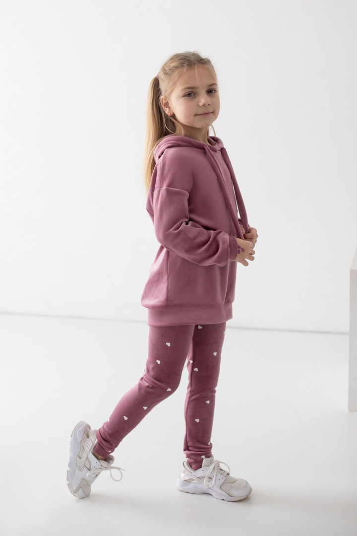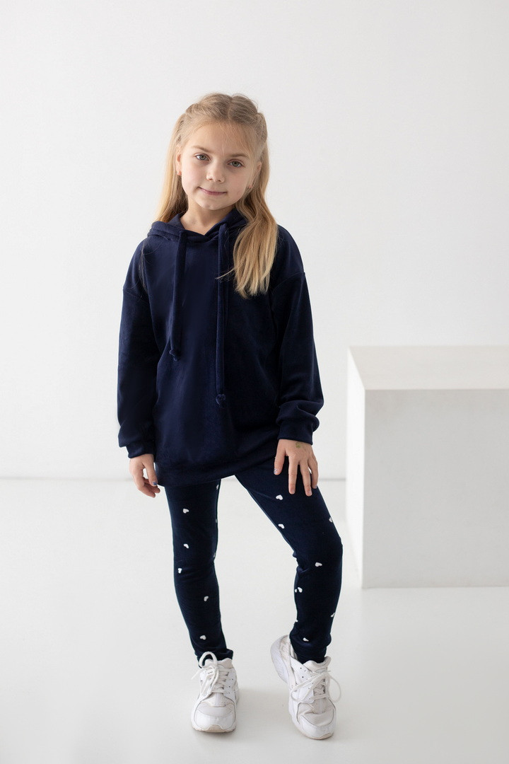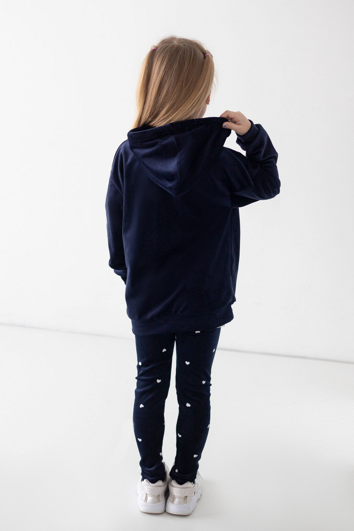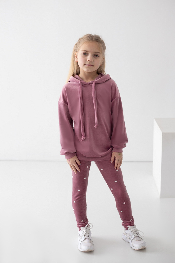 Надзвичайно комфортний комплект для дівчаток із велюру, поєднує стильний вигляд і максимальний комфорт, що робить його ідеальним вибором у будь-яку пору року. Худі має вільний, продуманий крій, який забезпечує зручність протягом усього дня. М’який капюшон додає комфорту та захищає від прохолоди. Довгі рукава з еластичними манжетами добре фіксуються, а низ виробу акуратно оформлений для комфортної посадки. Завдяки оксамитовій поверхні велюру, худі виглядає стильно та привабливо. Лосини виконані з еластичного велюру, приємного до тіла та ніжного на дотик. Еластичний пояс забезпечує комфортну посадку без здавлювання, а декоративний принт додає образу грайливості та індивідуальності. Велюр додає комплекту м’якості, легкого блиску та виразного зовнішнього вигляду.