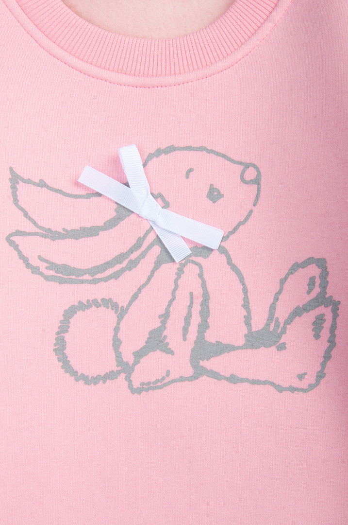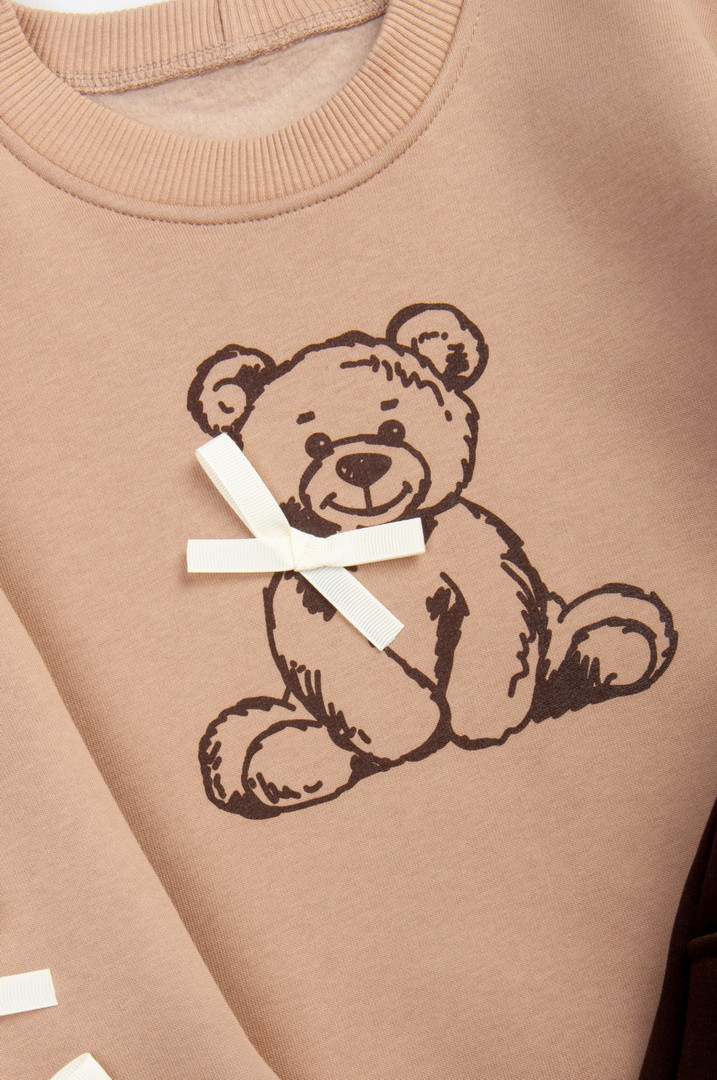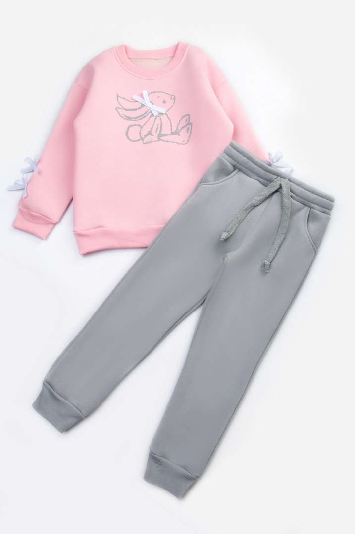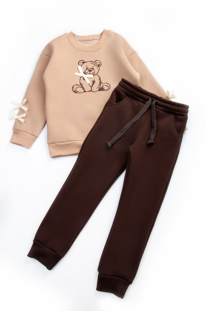 Стильний теплий костюм для дівчаток із триниткового футера з начосом. Модель складається з світшота з довгими рукавами на манжетах, а також штанів з бічними кишенями, на манжетах, для зручності всередині штанів вставлений шнурок. По переду світшота надруковано стильний накат. Полотно високої якості, з теплим начосом по вивороті, має хороші теплоізоляційні властивості.