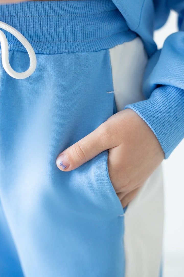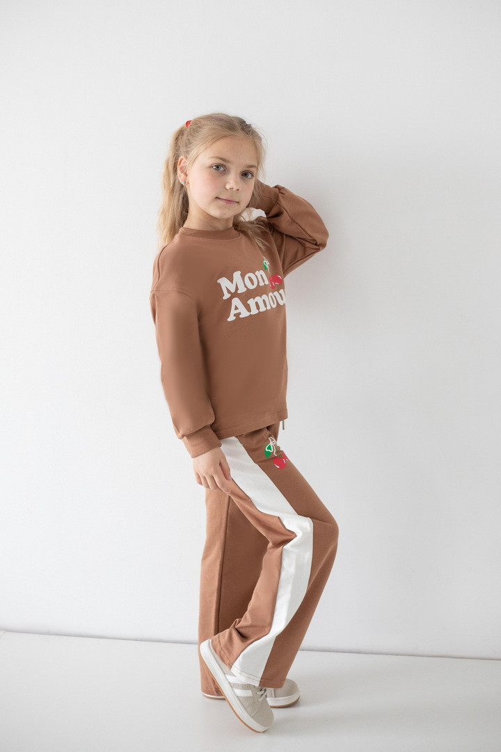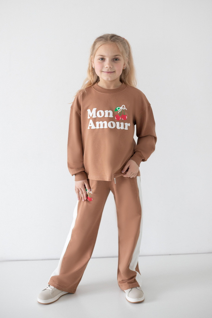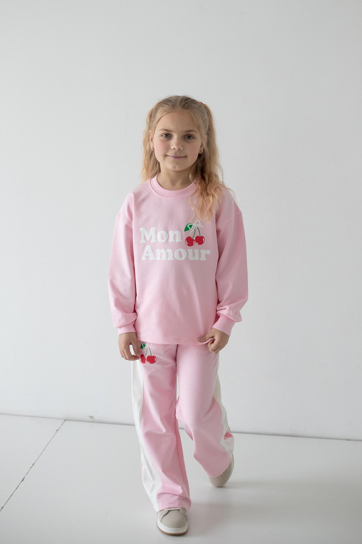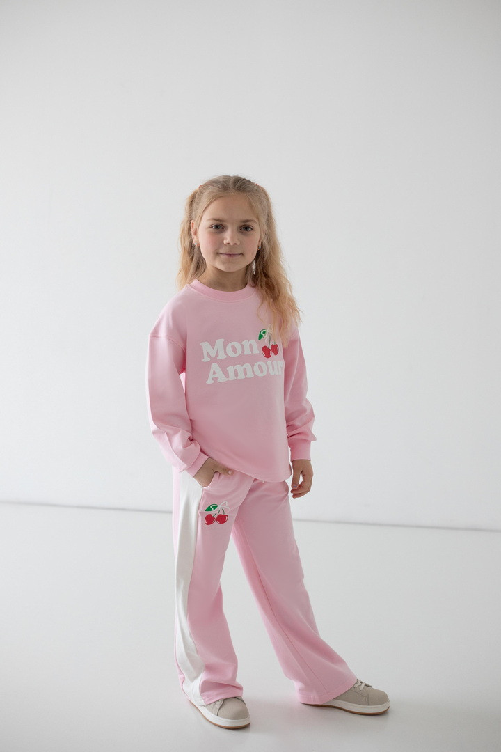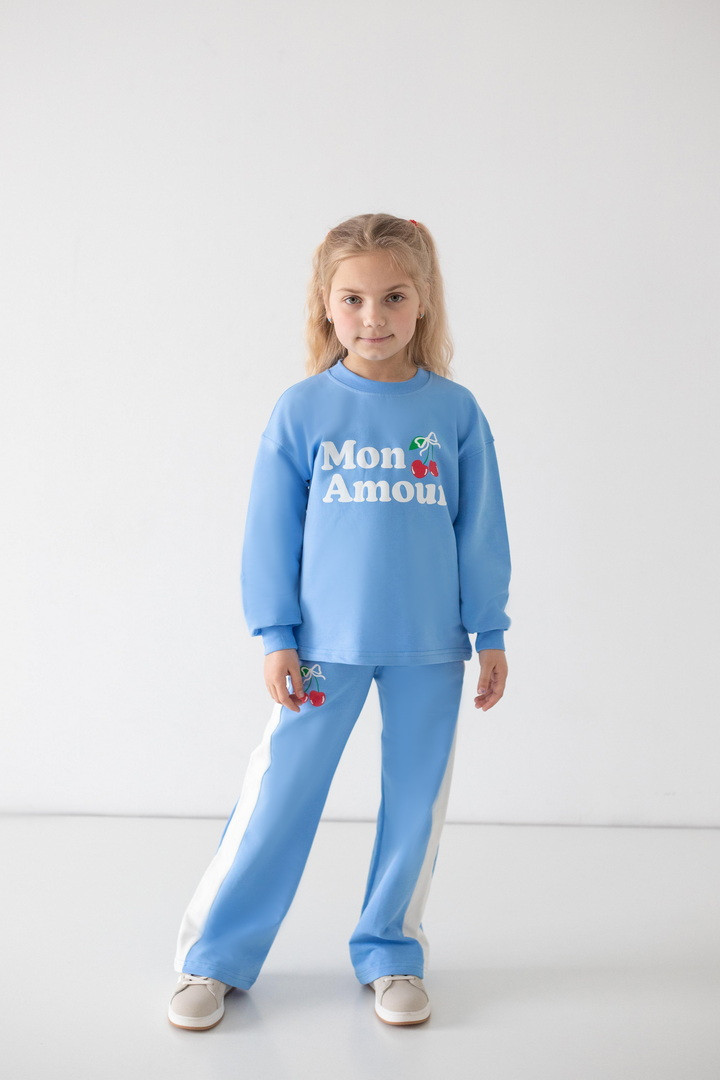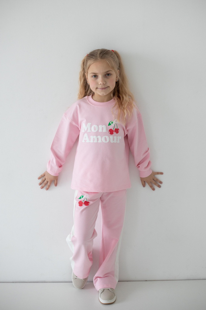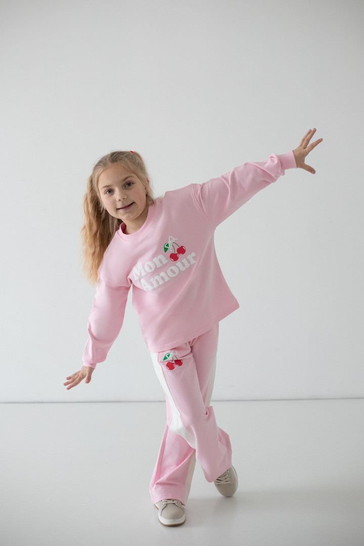 Цей костюм для дівчаток створений для активного, яскравого дитинства, де кожен рух — це радість, а кожен день наповнений пригодами. Він гармонійно поєднує в собі сучасний дизайн, продуманий крій та максимальний комфорт, який так важливий для дитини. Комплект складається зі світшота та штанів, виготовлених із якісного двониткового футера. Ця тканина відома своєю м’якістю, еластичністю та зносостійкістю. Вона приємна до тіла, добре пропускає повітря та допомагає підтримувати комфортну температуру, що робить костюм ідеальним. Світшот має вільний, трохи oversize крій, який забезпечує комфорт. Манжети на рукавах додають зручності та допомагають виробу добре тримати форму. Оригінальний принт на грудях робить образ яскравим і запам’ятовуваним, додаючи нотки грайливості та настрою. Штани виконані у сучасному стилі з прямим кроєм, що виглядає актуально та водночас дуже зручно. Еластичний пояс м’яко фіксується на талії, не тисне та забезпечує ідеальну посадку. Додаткові декоративні елементи та вставки підкреслюють стильність моделі, роблячи її не просто річчю, а справжнім fashion-образом для дитини. Цей костюм стане улюбленим у гардеробі вашої дівчинки — адже він не лише гарний, а й неймовірно комфортний.