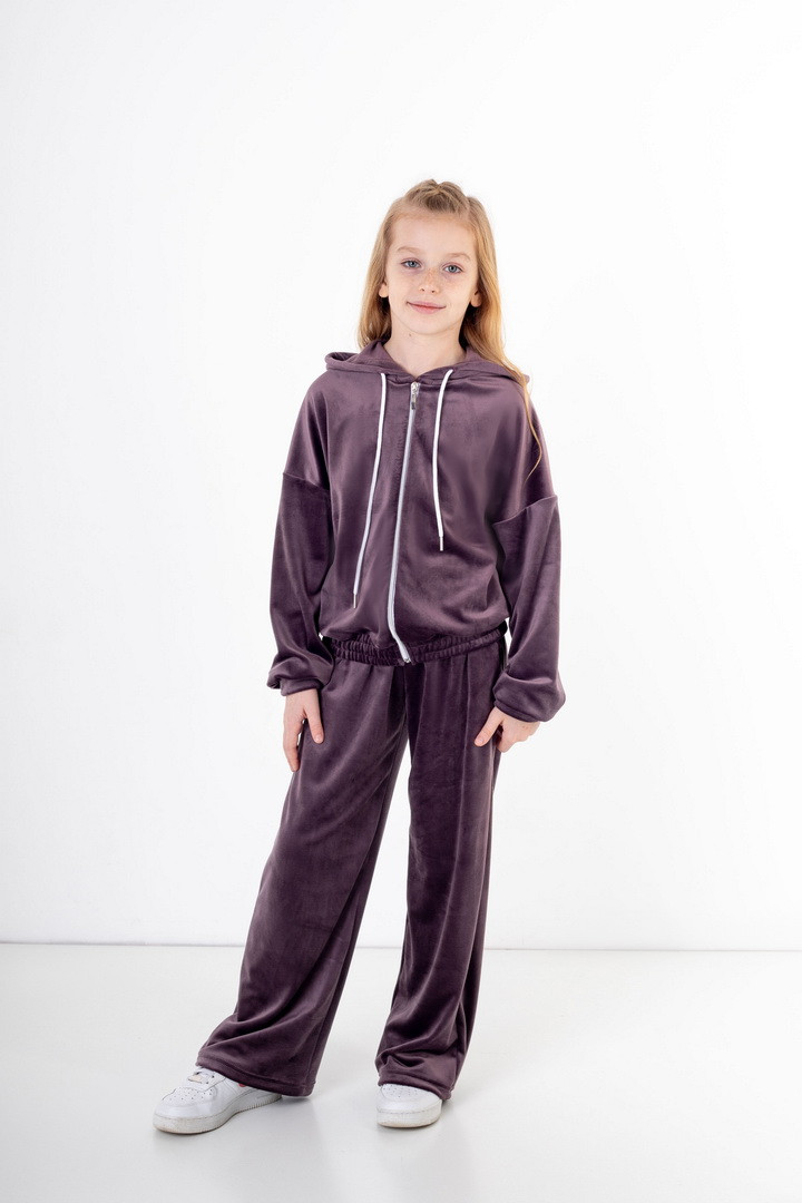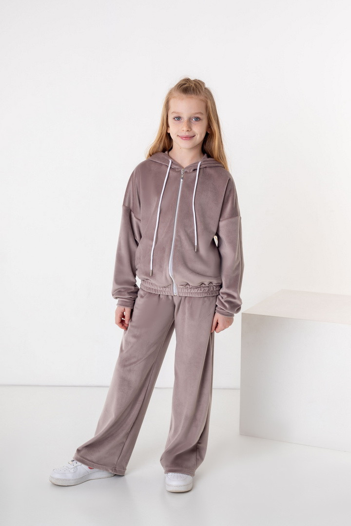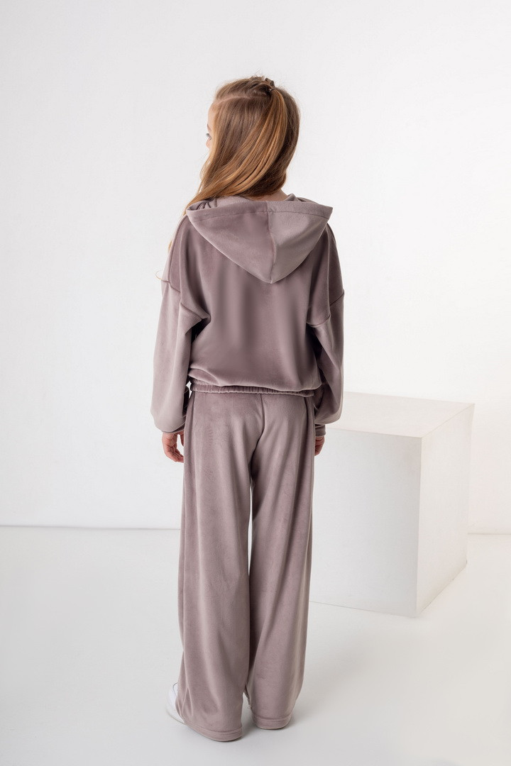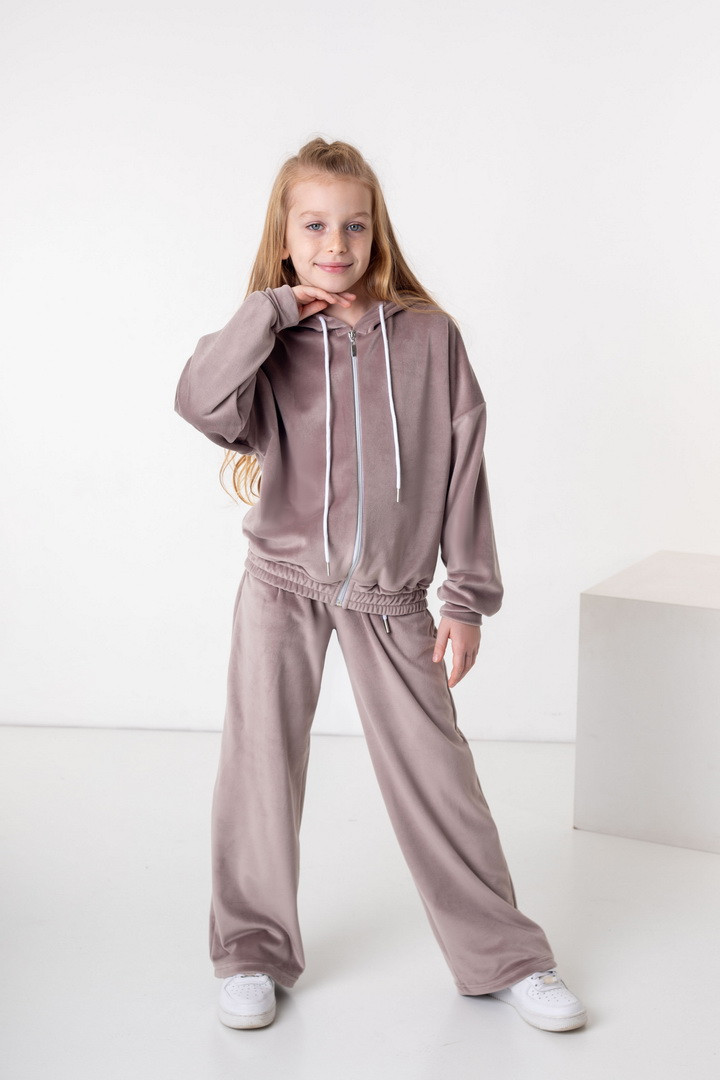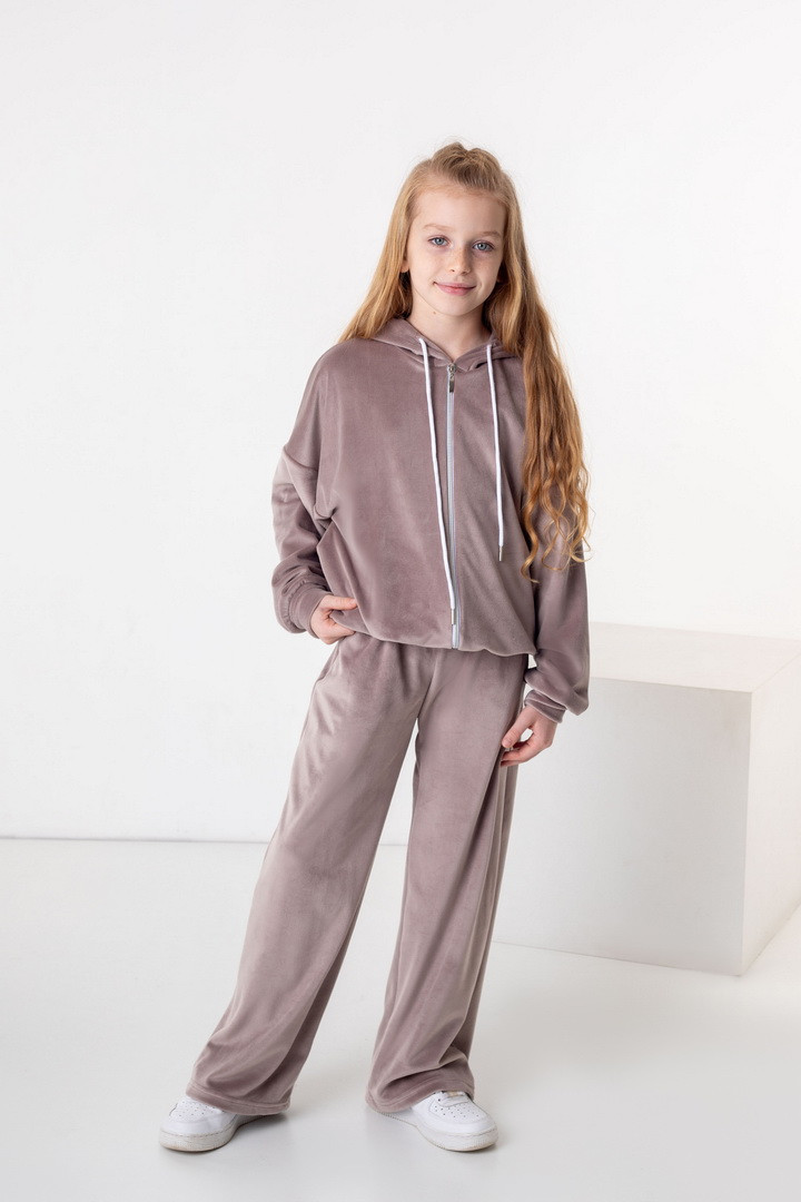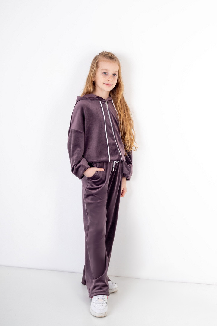 Базовий костюм для дівчаток із полотна "Велюр на флісі". Модель складається з худі вільного крою, з довгими рукавами на манжетах, капюшоном і місткою кишенею-кенгуру, а також брюк з бічними кишенями, на манжетах, з приточним поясом, всередині вставлений шнурок для зручності використання. Костюм підходить для прогулянок, занять спортом, активного відпочинку. Рекомендується доповнити образ модними кросівками, кедами. Полотно гарної якості, при правильному догляді не дає усадки, не линяє, не скочується.