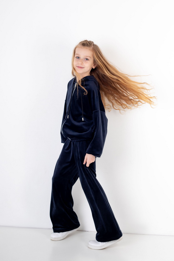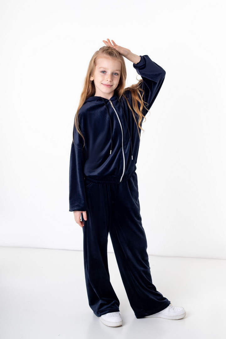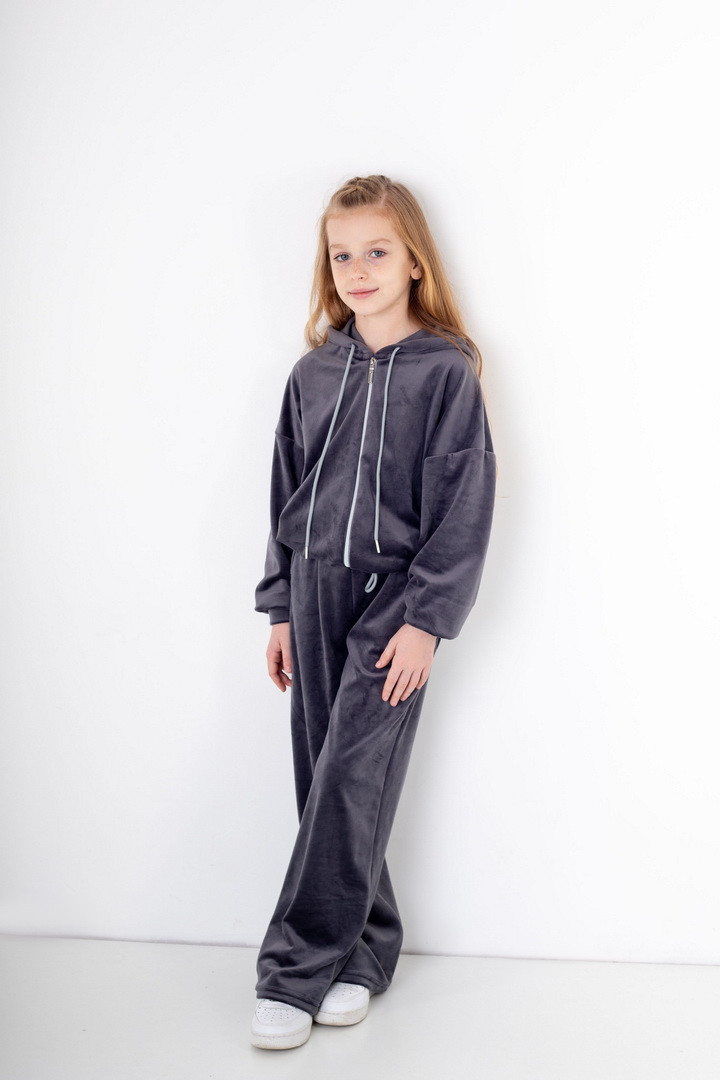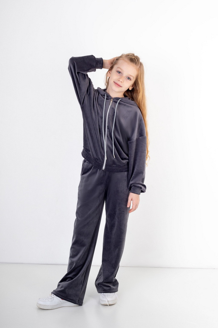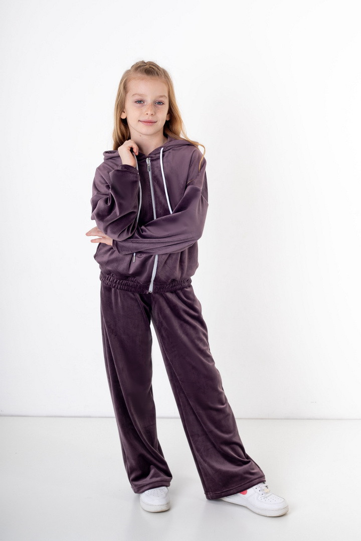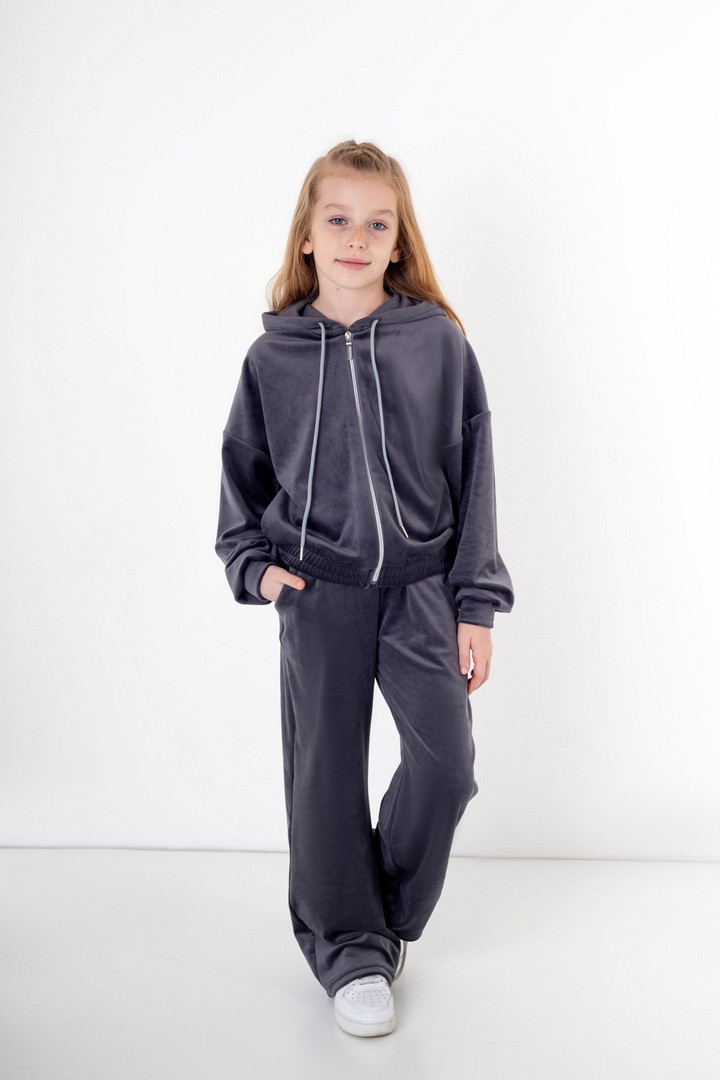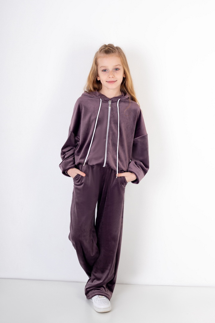 Базовий костюм для дівчаток із полотна "Велюр на флісі". Модель складається з худі вільного крою, з довгими рукавами на манжетах, капюшоном і місткою кишенею-кенгуру, а також брюк з бічними кишенями, на манжетах, з приточним поясом, всередині вставлений шнурок для зручності використання. Костюм підходить для прогулянок, занять спортом, активного відпочинку. Рекомендується доповнити образ модними кросівками, кедами. Полотно гарної якості, при правильному догляді не дає усадки, не линяє, не скочується.
