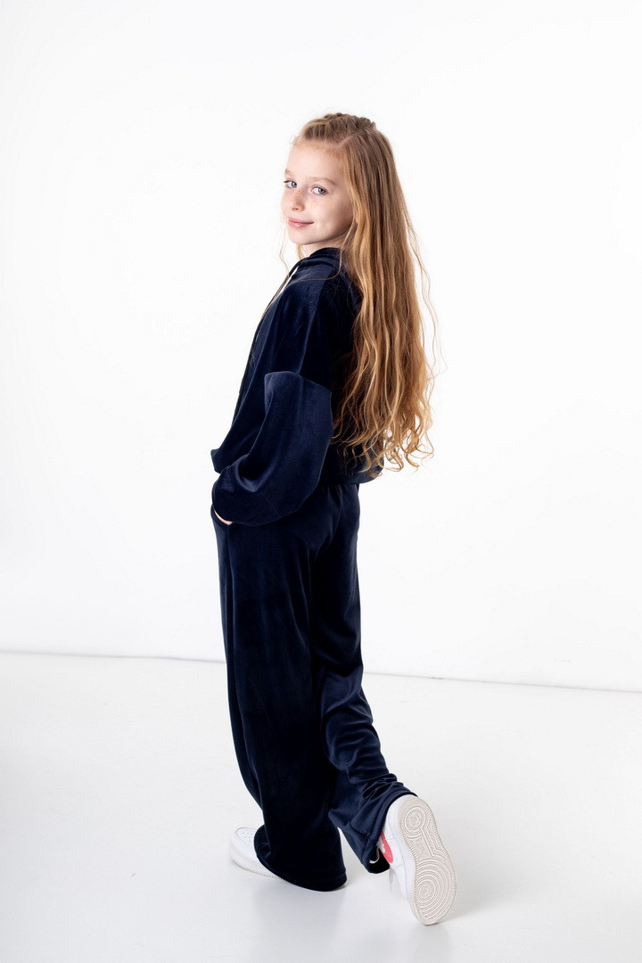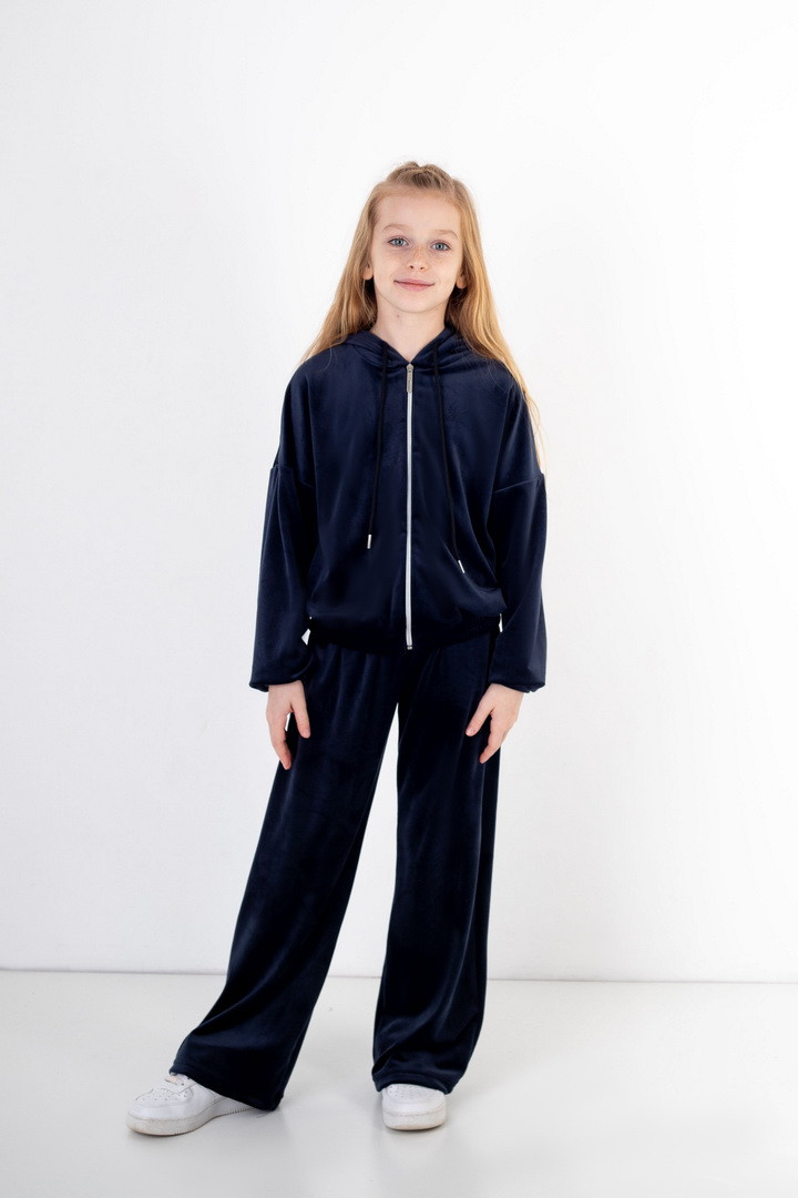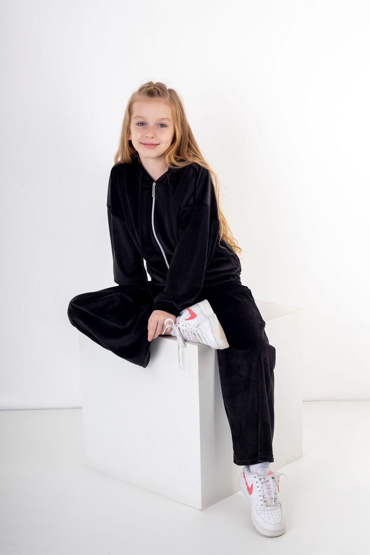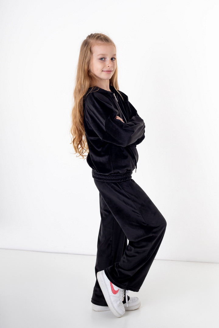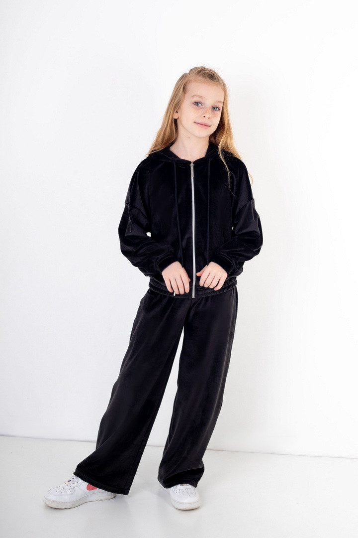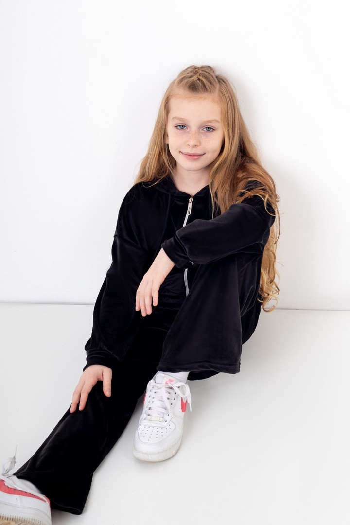 Базовий костюм для дівчаток із полотна "Велюр на флісі". Модель складається з худі вільного крою, з довгими рукавами на манжетах, капюшоном і місткою кишенею-кенгуру, а також брюк з бічними кишенями, на манжетах, з приточним поясом, всередині вставлений шнурок для зручності використання. Костюм підходить для прогулянок, занять спортом, активного відпочинку. Рекомендується доповнити образ модними кросівками, кедами. Полотно гарної якості, при правильному догляді не дає усадки, не линяє, не скочується.