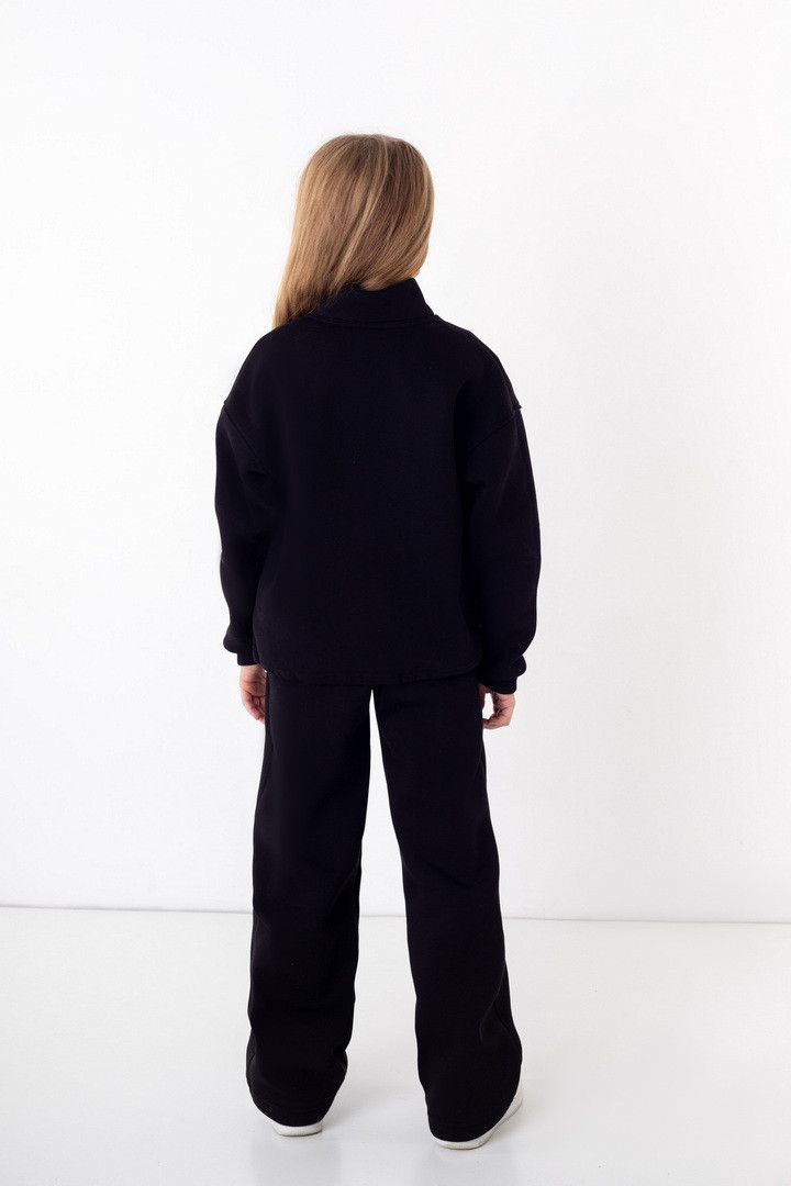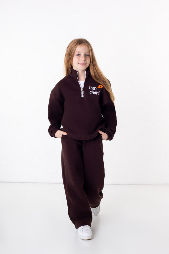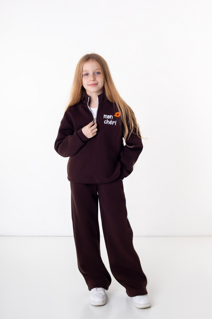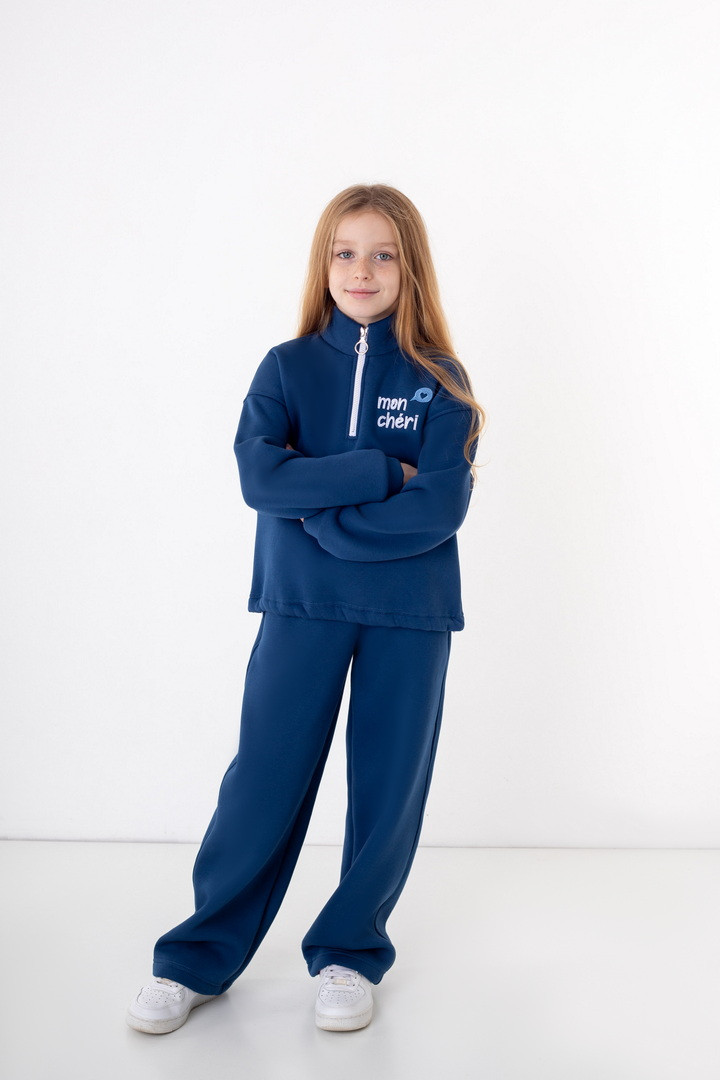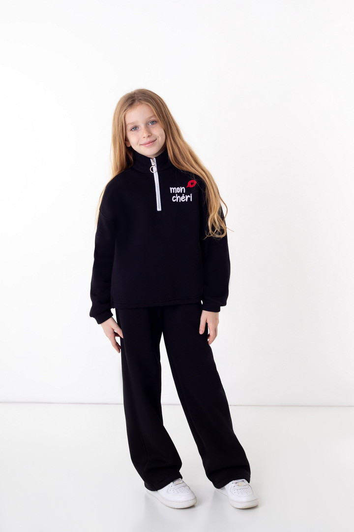 Стильний та зручний костюм із триниткового футера з начосом для дівчат, створений для комфорту. Комплект складається з теплого світшота прямого силуету та широких штанів. Світшот має комір-стійку з функціональною блискавкою до середини грудей, прикрашений декоративною вишивкою на грудях. Рукава – вільні, із комфортними манжетами. Низ виробу виконаний у прямому крої, але є і фіксатор, який можна затягнути (залежно від носіння) для максимального комфорту. Штани мають широкий вільний крій, що забезпечує зручність та стильний сучасний вигляд. Еластичний пояс м’яко фіксує модель, не здавлюючи талію.