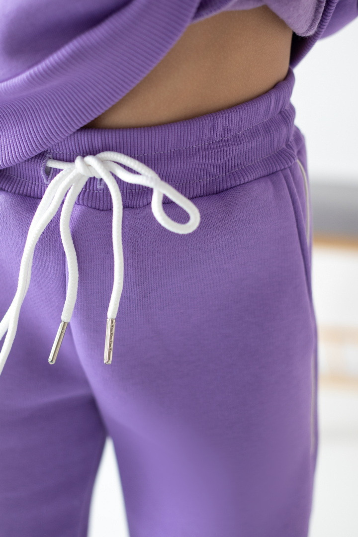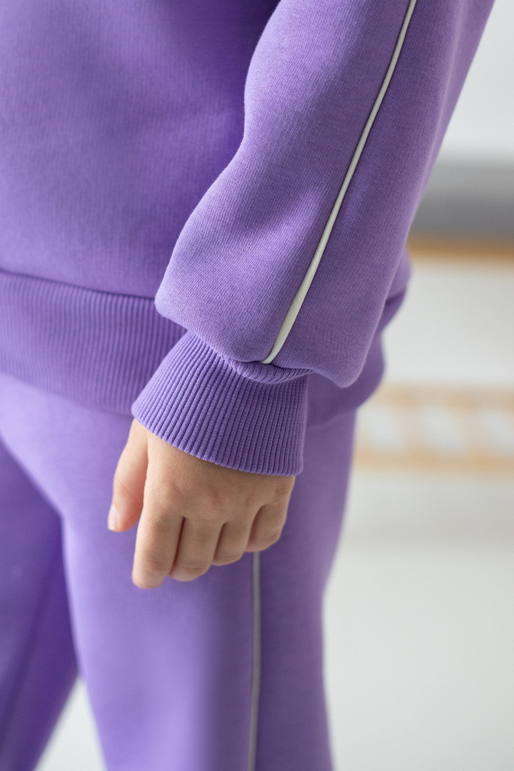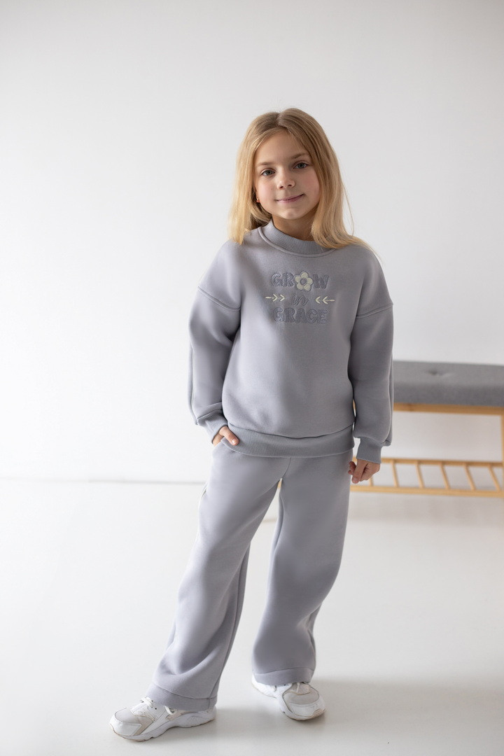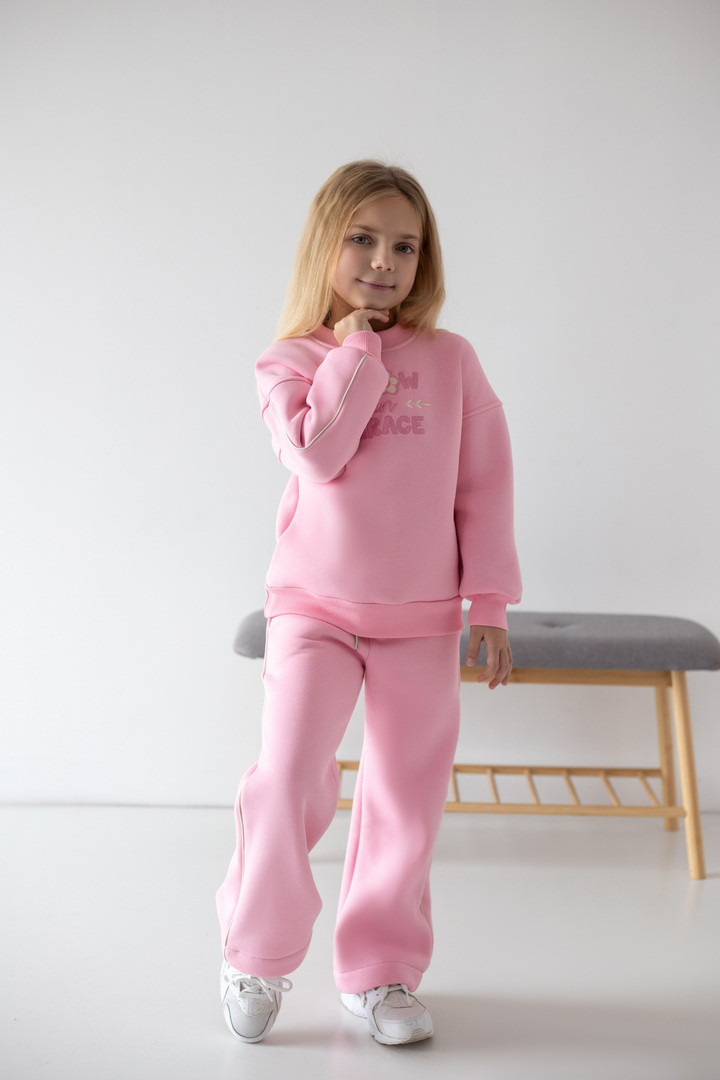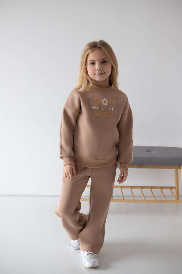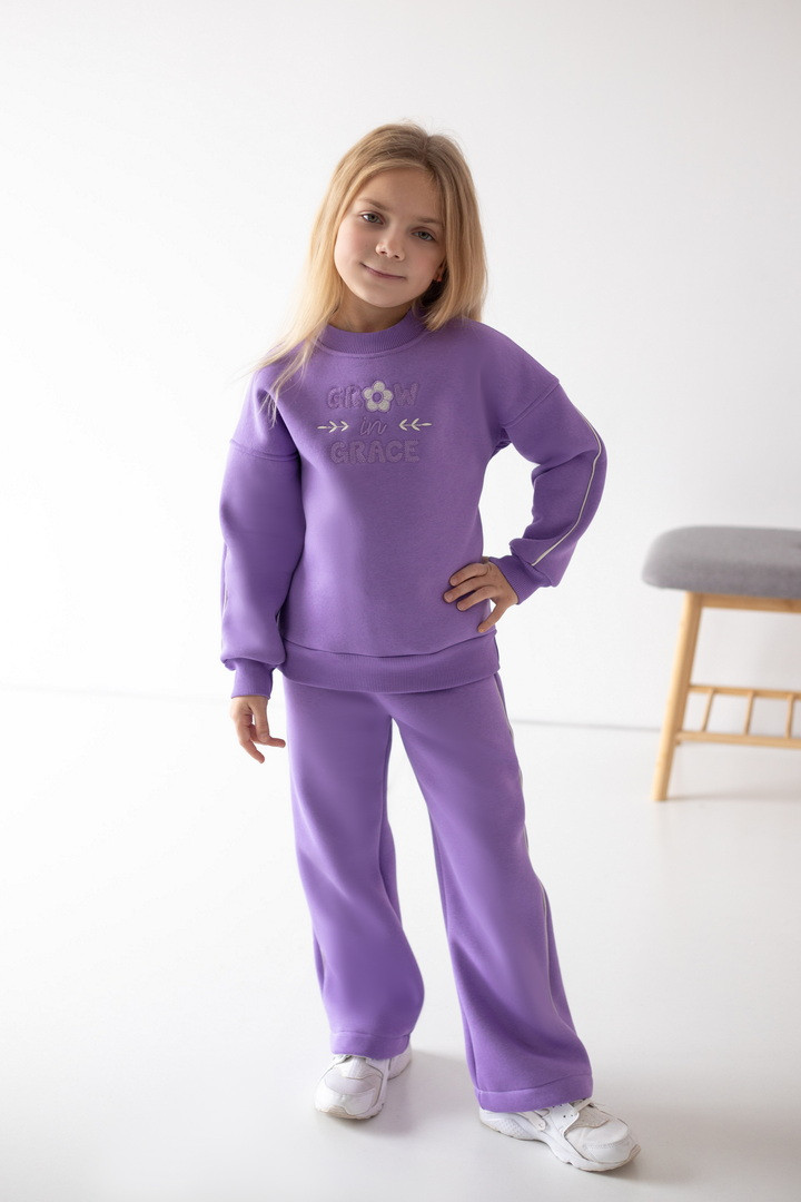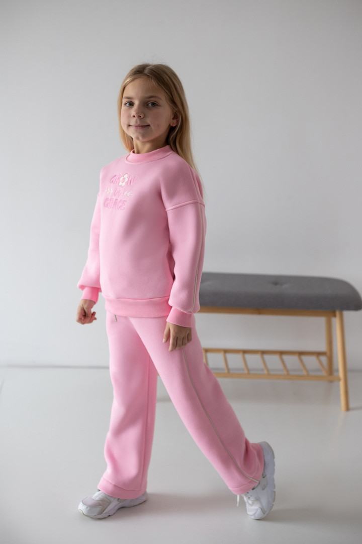 Стильний костюм "тринитковий футер з начосом" для дівчаток, створений для максимального комфорту. До комплекту входить м’який світшот вільного крою з опущеною лінією плеча та еластичними манжетами. На передній частині розміщена акуратна декоративна вишивка з ніжним елементом, що додає образу приємної виразності. Брюки мають прямий вільний фасон, забезпечують зручність рухів і комфорт протягом усього дня. Матеріал приємний на дотик, теплий та практичний — ідеальний варіант для прогулянок, школи чи домашнього затишку.