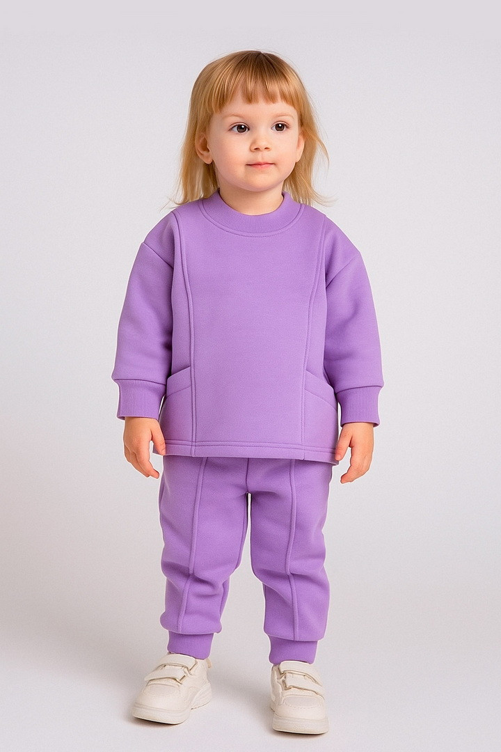 Дитячий костюм складається зі світшота та штанів. Світшот має зручний вільний крій, довгі рукави з манжетами та оригінальні декоративні шви спереду. Спинка трохи подовжена, що забезпечує комфорт під час руху. Штани з еластичним поясом і манжетами по низу добре тримають форму та дарують свободу рухів. Костюм виконаний із м’якої та приємної до тіла тканини, ідеально підходить для щоденного носіння, прогулянок та активного відпочинку.