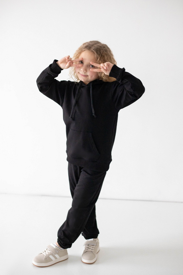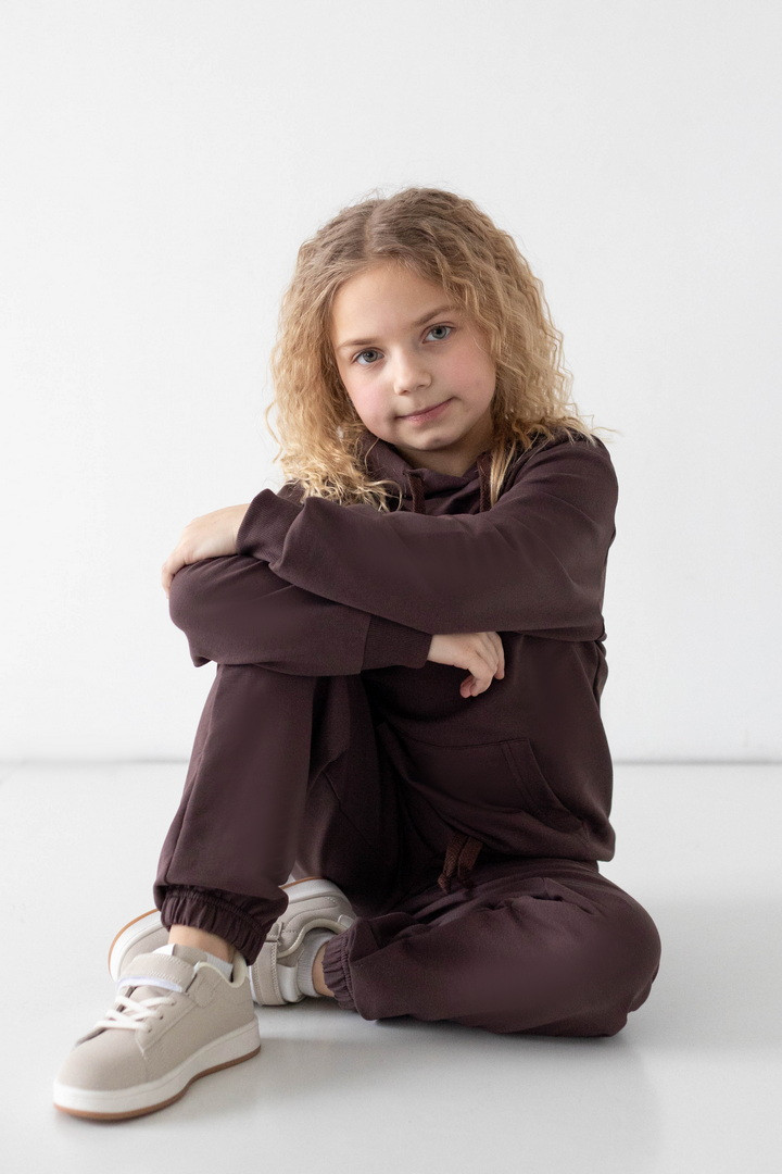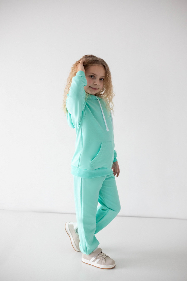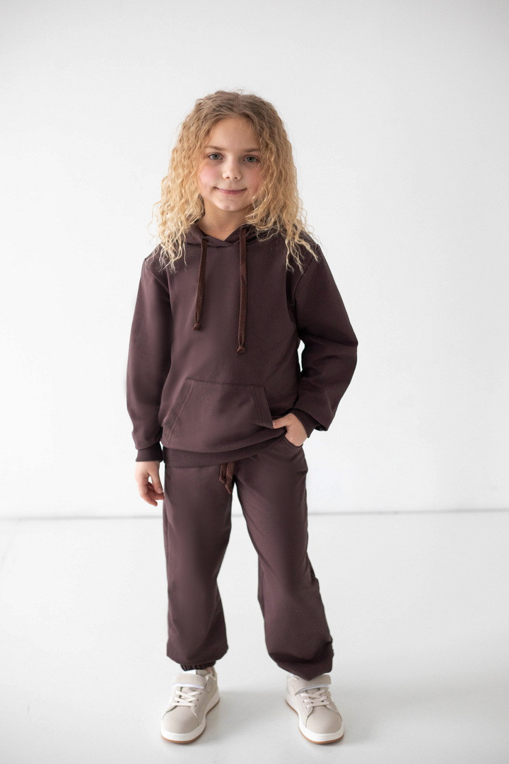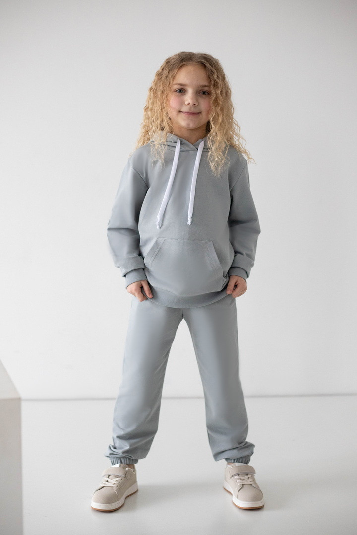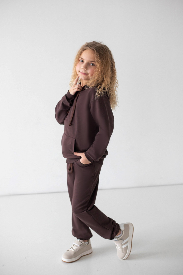 Цей костюм — про свободу, легкість і той самий комфорт. Він створений для дівчаток, які не сидять на місці, люблять рух, прогулянки та відчуття затишку. М’який двонитковий футер ніжно огортає тіло, не парить і дарує приємні тактильні відчуття протягом усього дня. Худі з капюшоном має зручну кенгуру-кишеню та акуратні манжети — нічого зайвого, лише продуманий комфорт і сучасний мінімалізм. Штани з еластичною резинкою, шнурком та манжетами ідеально сідають по фігурі, не сповзають і не сковують рухів. Костюм виглядає стильно, охайно та актуально, водночас залишаючись максимально практичним. Ідеальний вибір для дівчаток, які люблять комфорт, стиль і настрій.