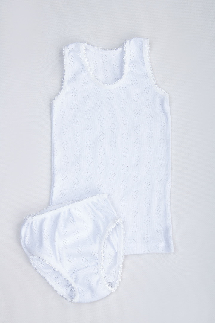 Комплект майка + трусы выполнены из мягкого приятного к телу трикотажного полотна. Трансфер представляет собой интерлок с выбитым на нём рисунком в виде дырочек. Комплект украшен кружевной резиной, которая хорошо сохраняет форму.