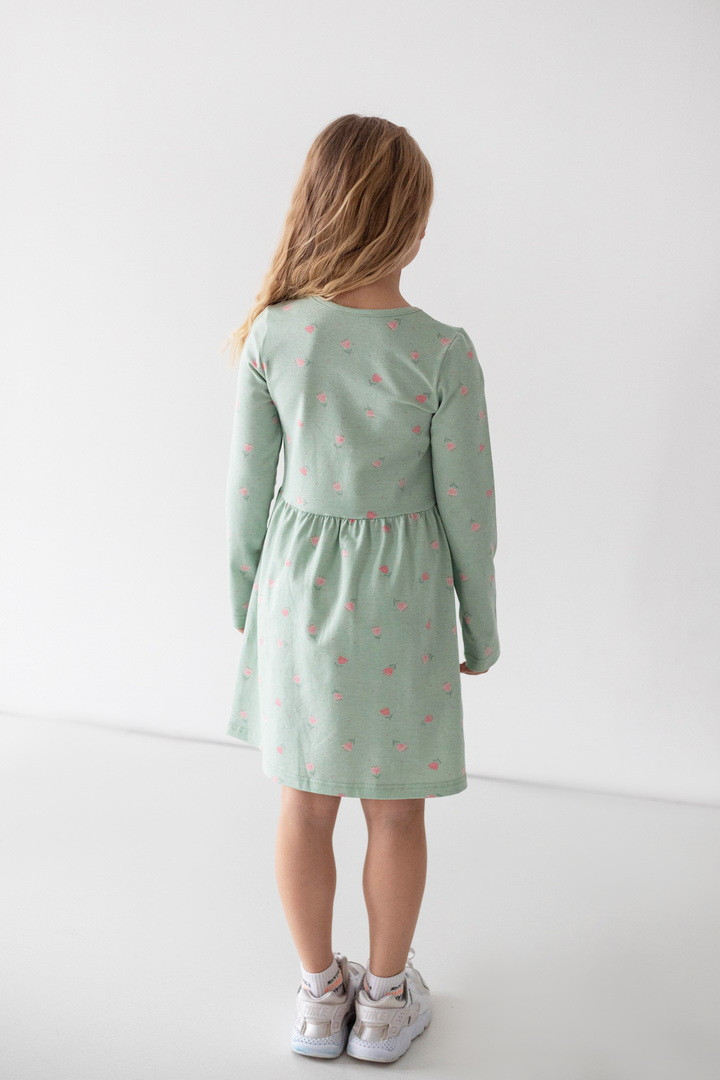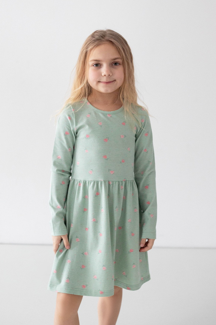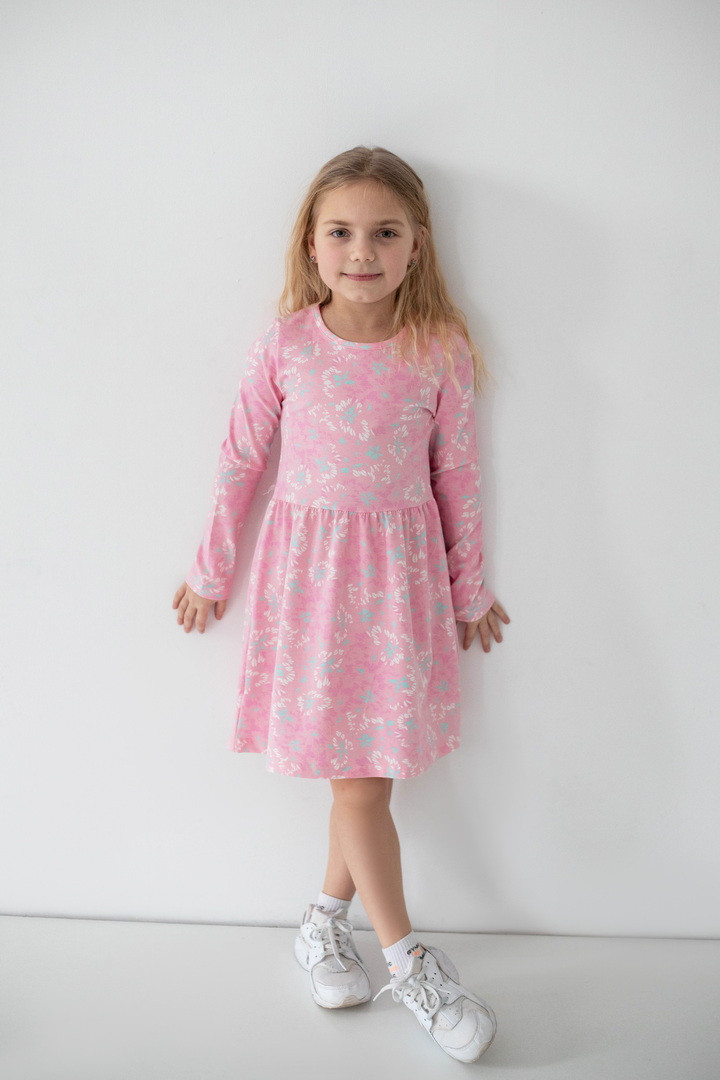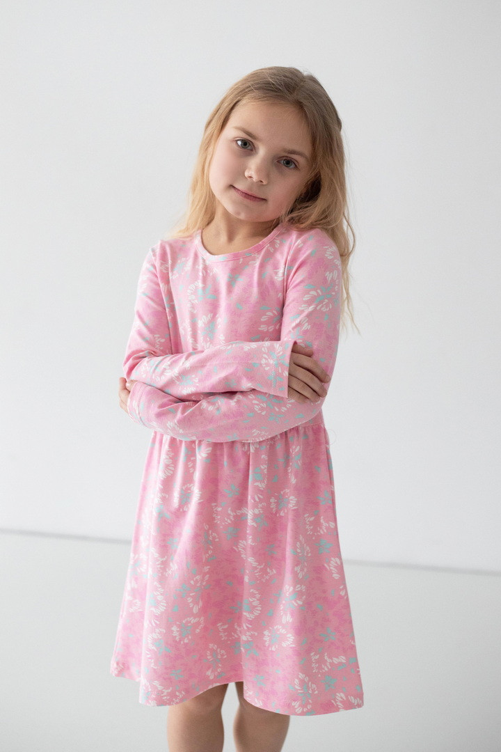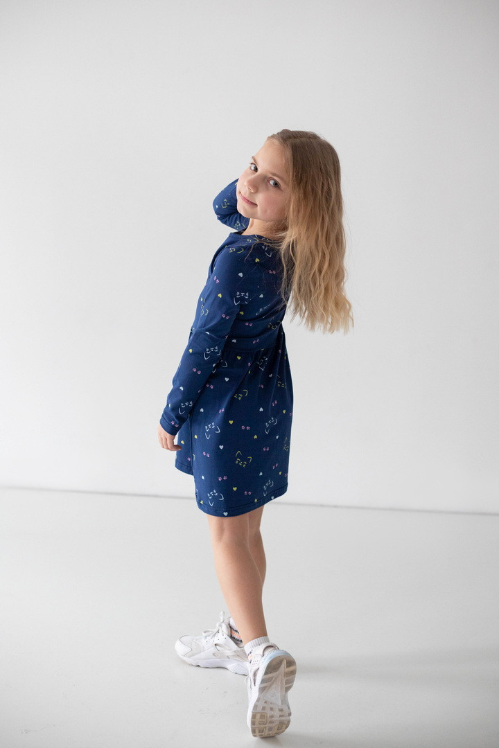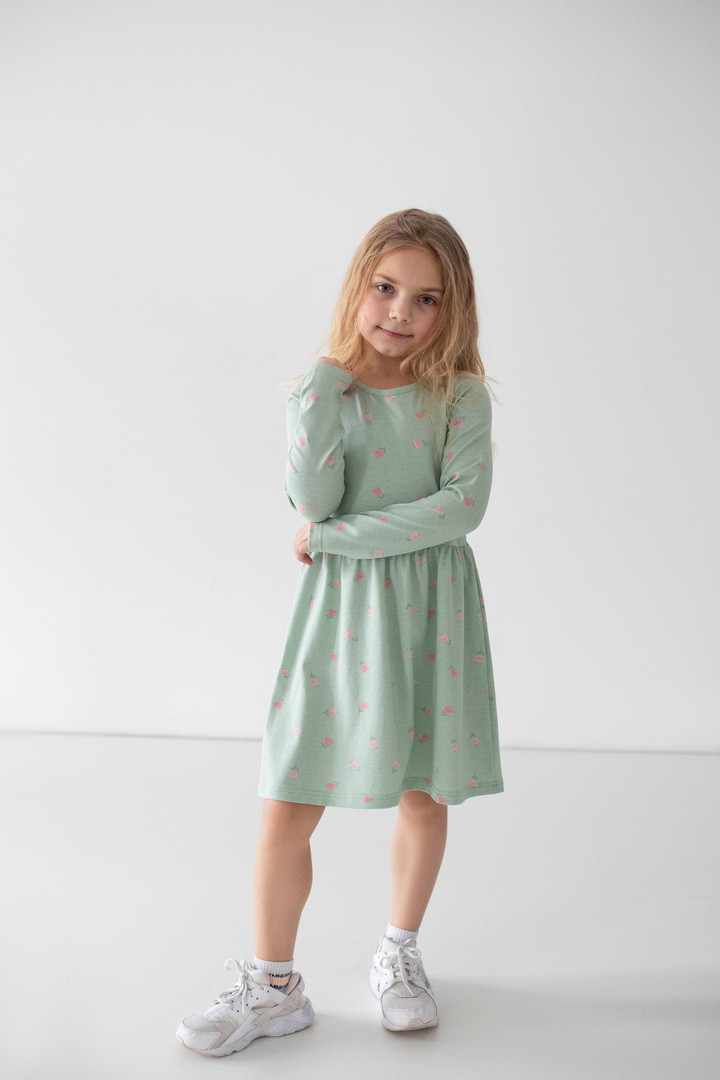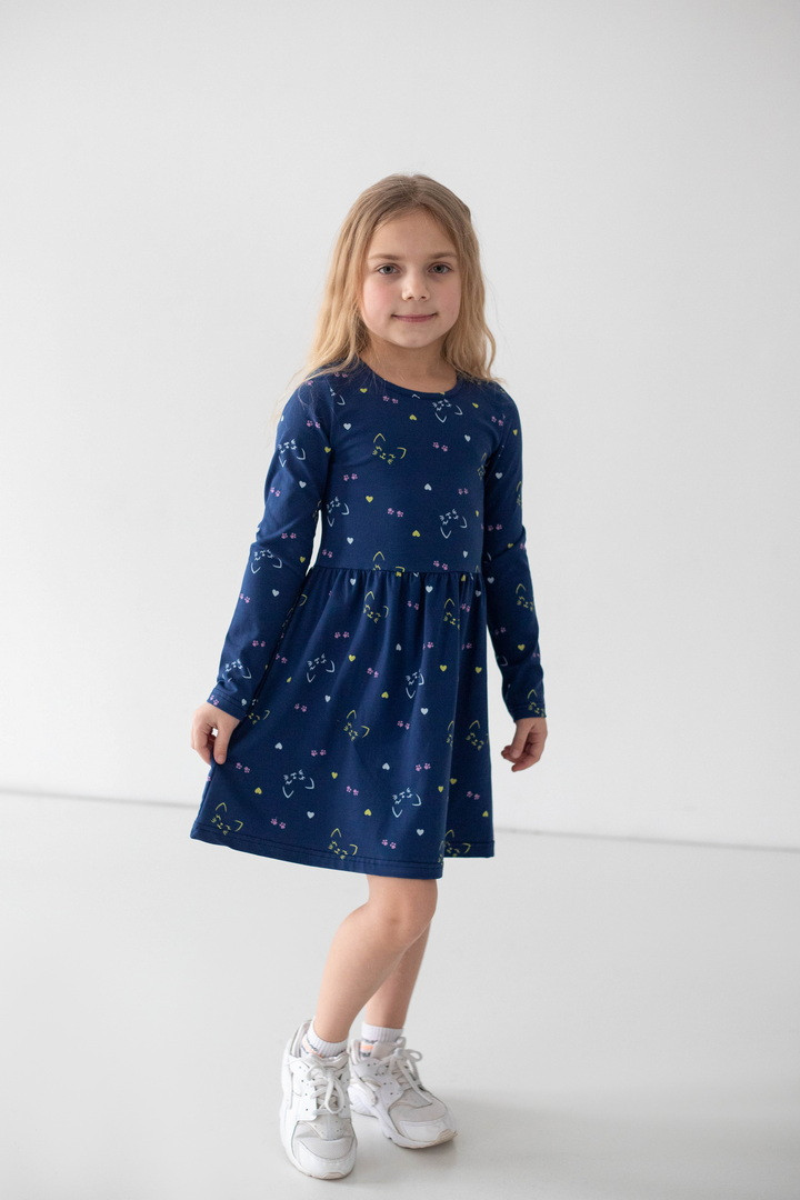 Ця сукня створена для маленьких мрійниць, які обожнюють яскраві деталі. Веселий принт одразу привертає увагу й додає образу грайливого настрою. Сукня виготовлена зі стрейч-куліру — м’якого, еластичного та дихаючого трикотажу, який ніжно прилягає до тіла й не сковує активну дитину. Продуманий крій із заниженою лінією талії та легкою спідницею забезпечує комфорт протягом усього дня. Довгий рукав робить модель практичною для міжсезоння та прохолодних днів, а натуральна основа тканини приємна навіть для чутливої шкіри. Ця сукня — ідеальне поєднання комфорту, якості та дитячої радості.