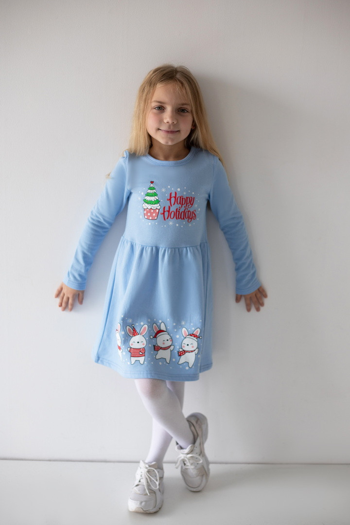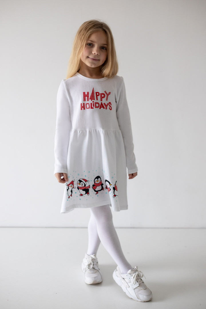Ніжна святкова сукня для дівчинки із довгим рукавом — ідеальний вибір для зимових урочистостей та новорічних фотосесій. Модель має комфортний прямий верх та злегка розкльошену спідницю, що забезпечує зручність у русі. На грудях розміщений яскравий святковий напис “Happy Holidays”, який додає образу святкового настрою. Має застібки у вигляді гудзиків по спинці. Низ спідниці прикрашений милим принтом із веселими звірятами у зимових аксесуарах, що робить сукню особливо привабливою для дівчаток. М’яка приємна до тіла тканина "футер з начосом" забезпечує комфорт протягом дня.