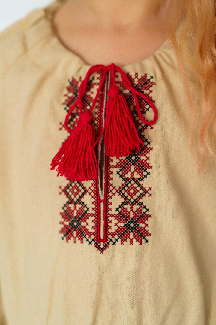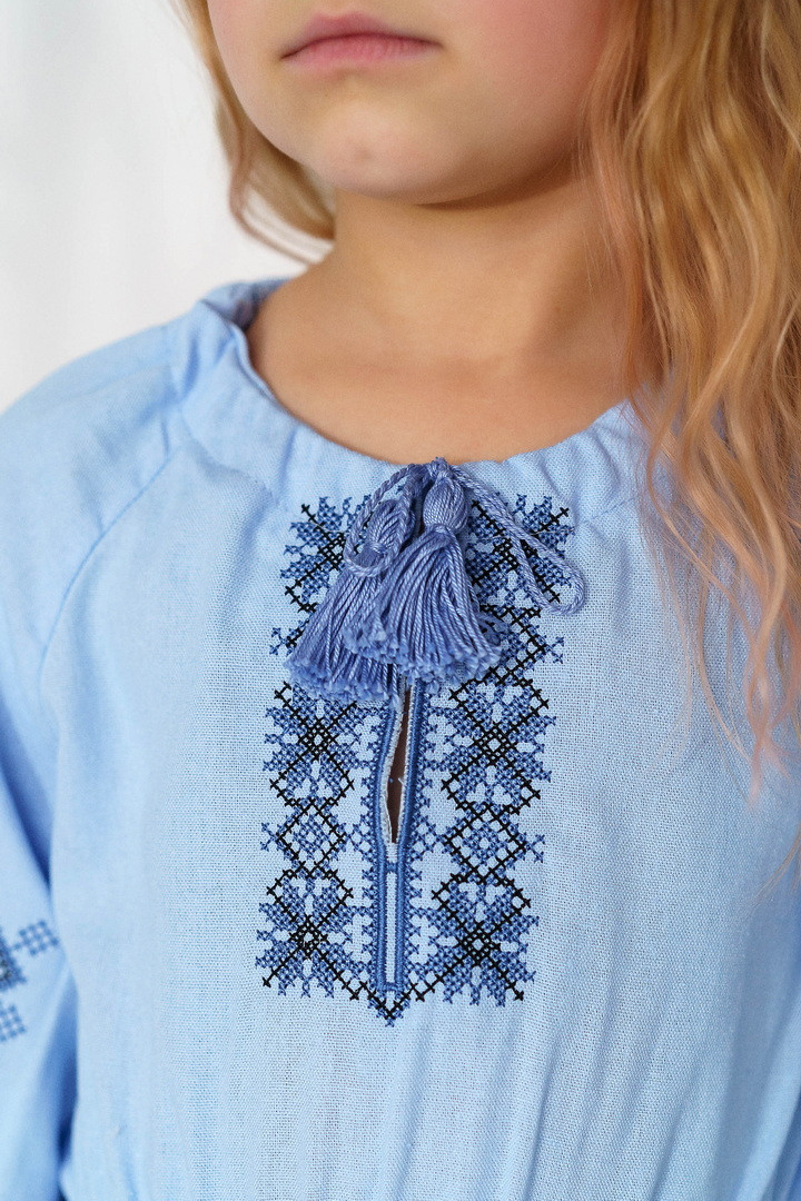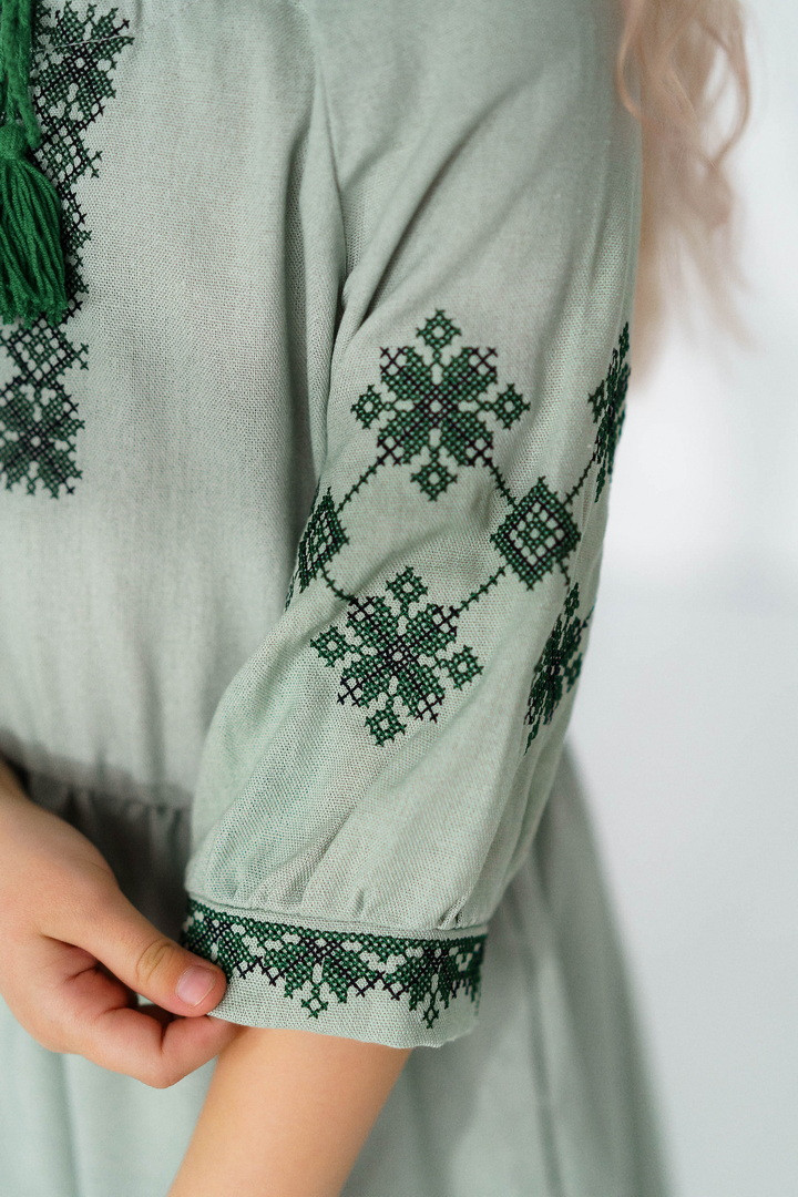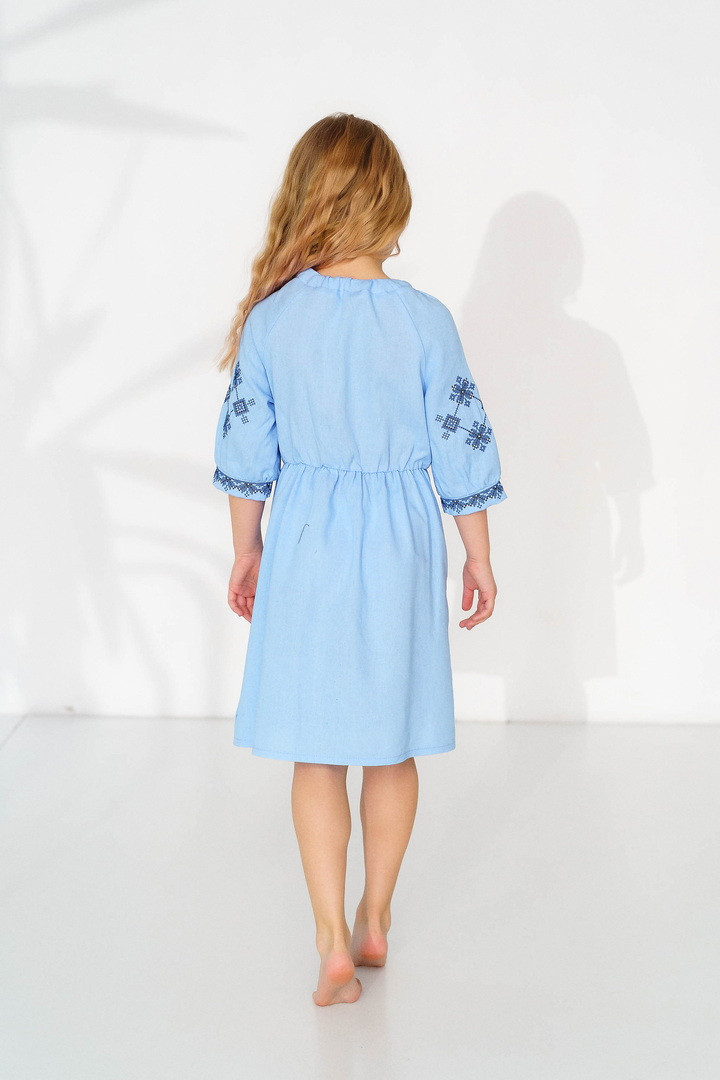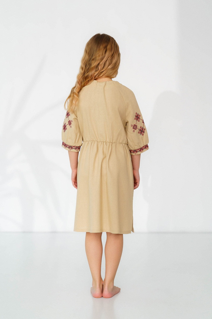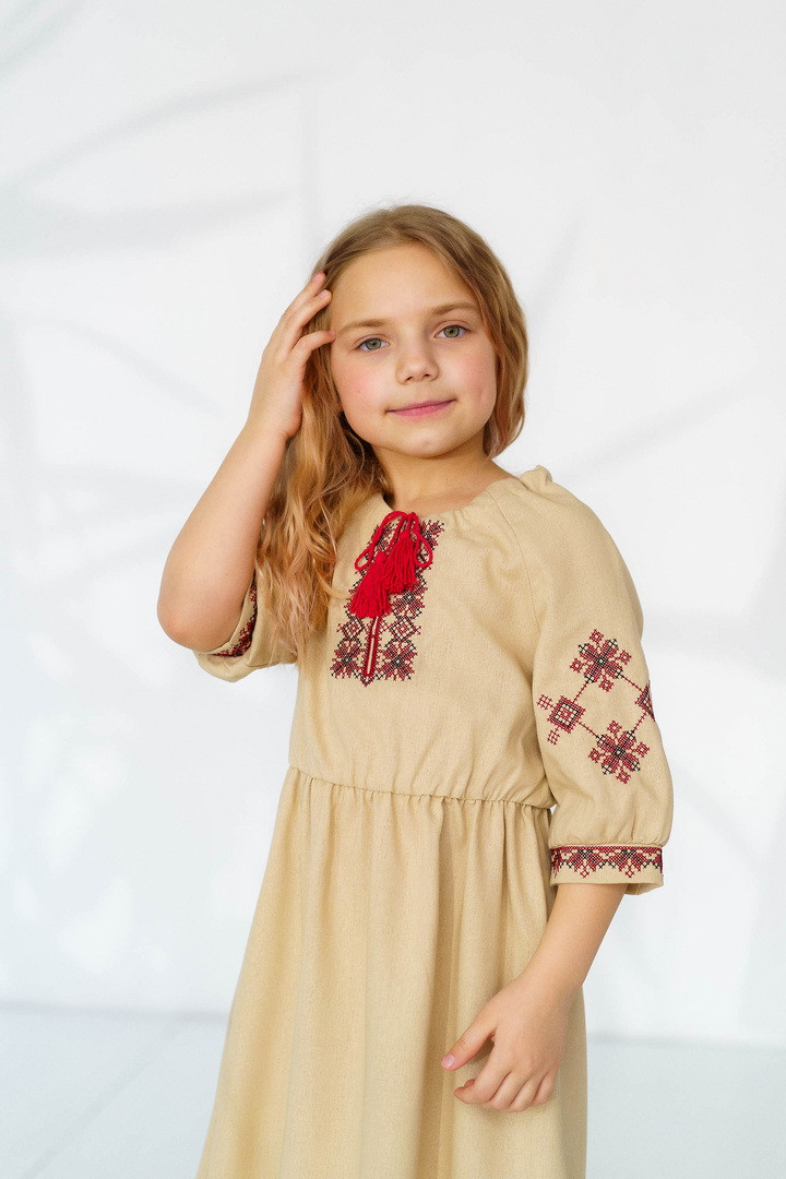 Ця сукня-вишиванка створена для маленьких красунь, які люблять виглядати чарівно та почуватися вільно. Натуральний льон дарує приємну прохолоду влітку, чудово дихає та підходить навіть для чутливої дитячої шкіри. Сукня виглядає дуже святково й водночас легко — ідеальний варіант для фотосесій, садочка, школи, сімейних свят або просто гарного настрою щодня. Особливу увагу привертає стильна вишивка в етнічному орнаменті на грудях і рукавах — вона додає образу українського характеру, робить сукню виразною та дуже милою. Вільний крій із зібраною талією не сковує рухів, тому дитині комфортно бігати, танцювати та гратися. А рукава ¾ виглядають акуратно та практично для будь-якої погоди. Це не просто сукня — це маленька історія про красу українських традицій у сучасному, зручному форматі.