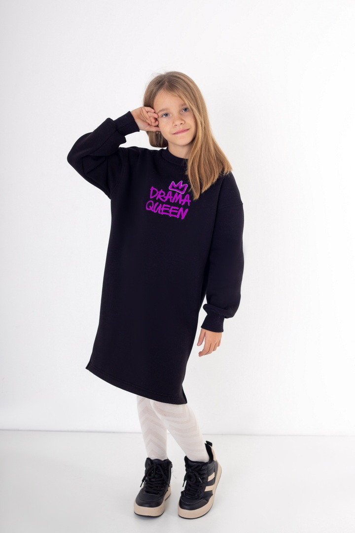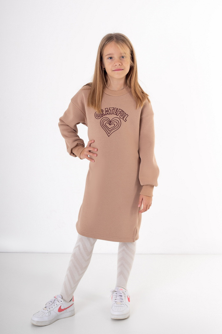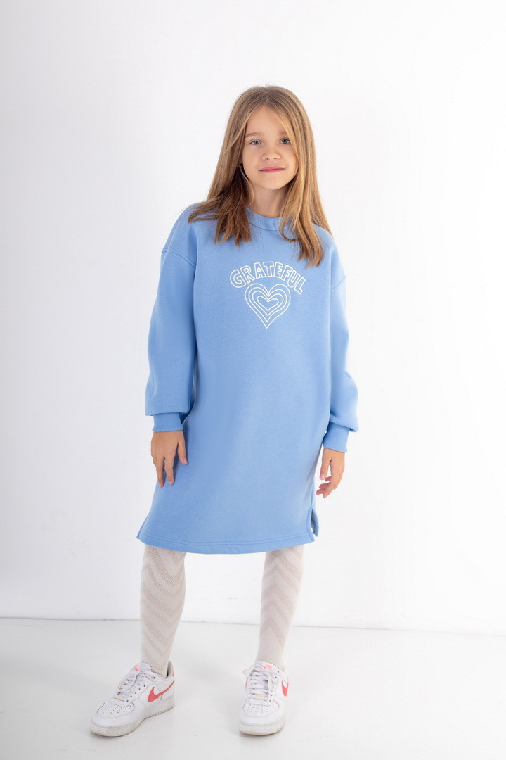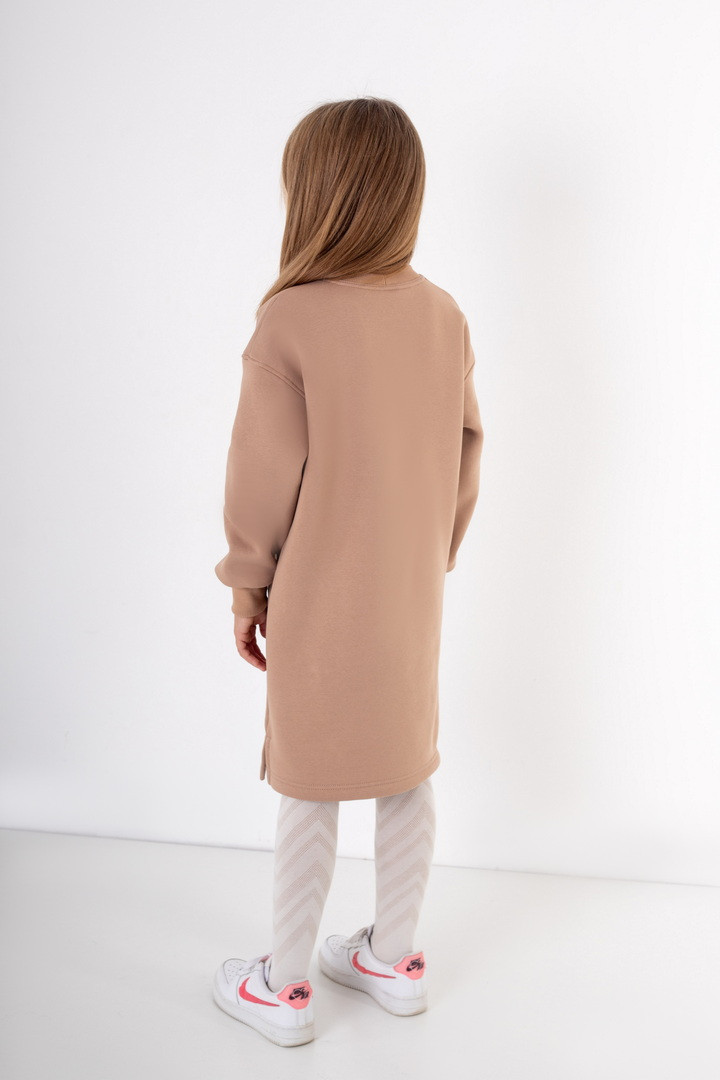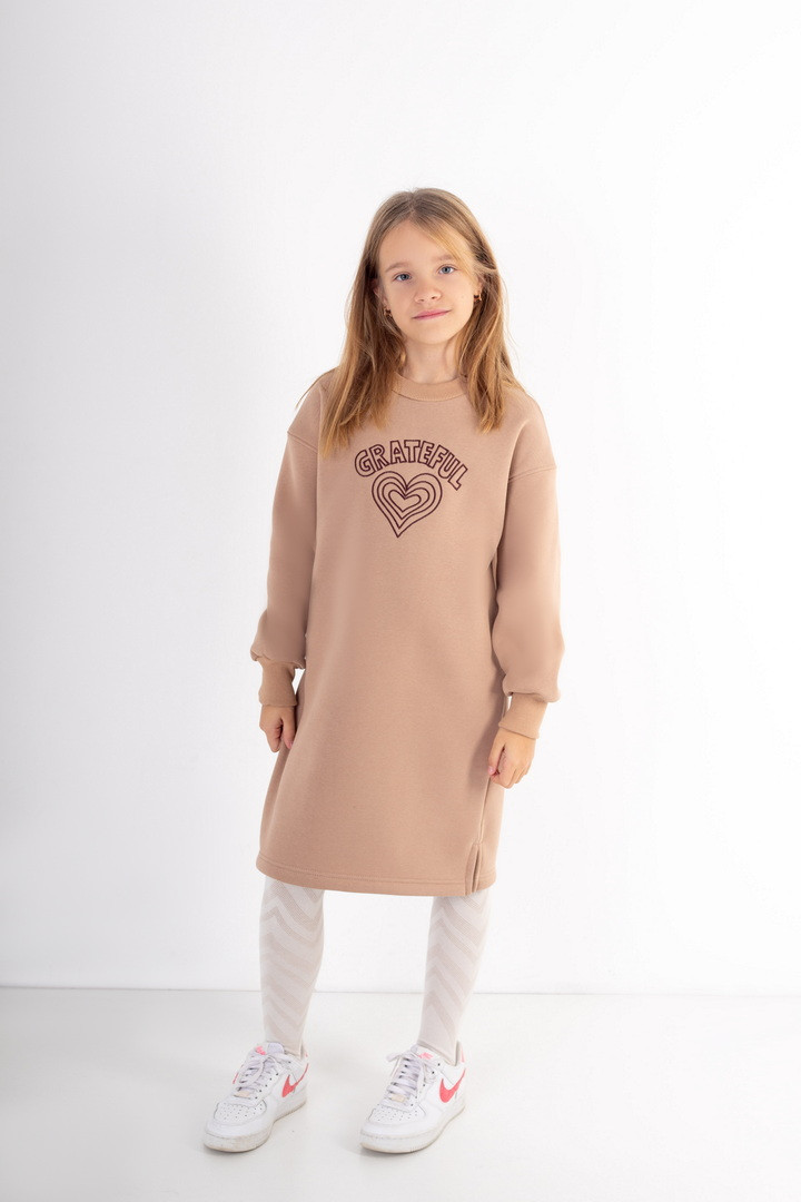 Сукня для дівчинки з теплого полотна "Тринитковий футер з начосом". Сукня вільного крою, з боковими розрізами, округлою горловиною та довгим рукавом. Сукню прикрашено вишивкою. У такій сукні буде зручно в прохолодну пору року. Полотно високої якості, з теплим начосом по вивороті, має хороші теплоізоляційні властивості.