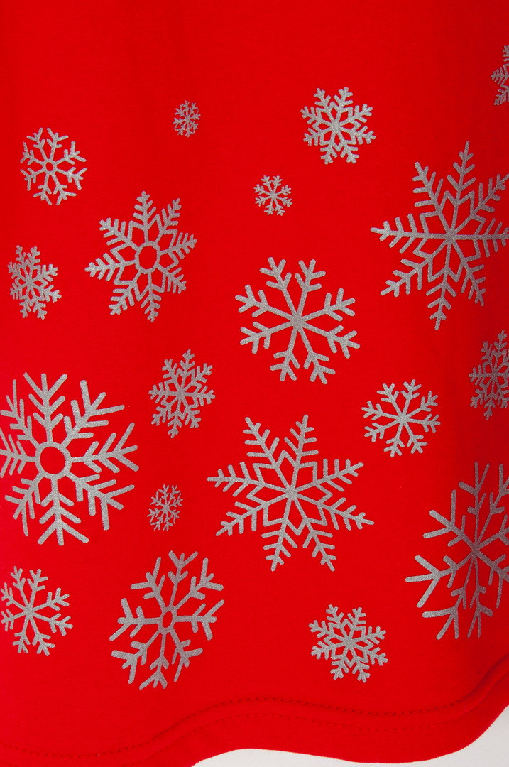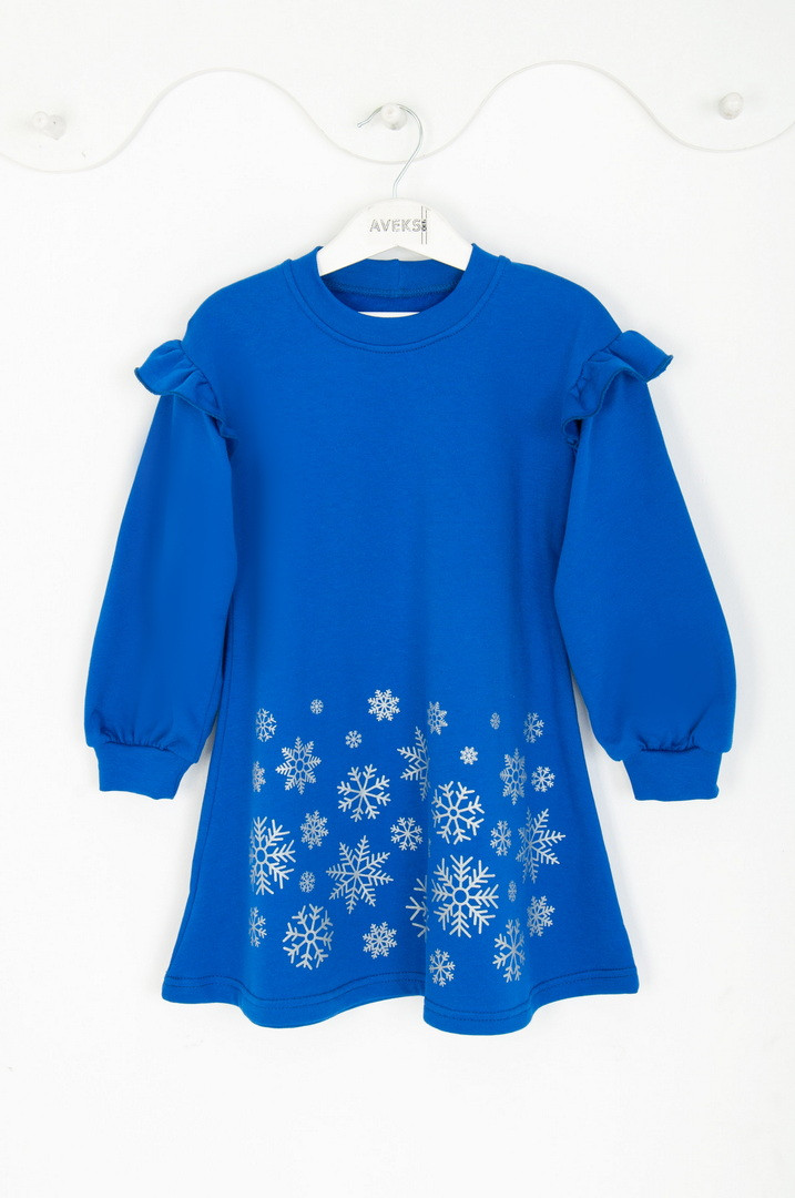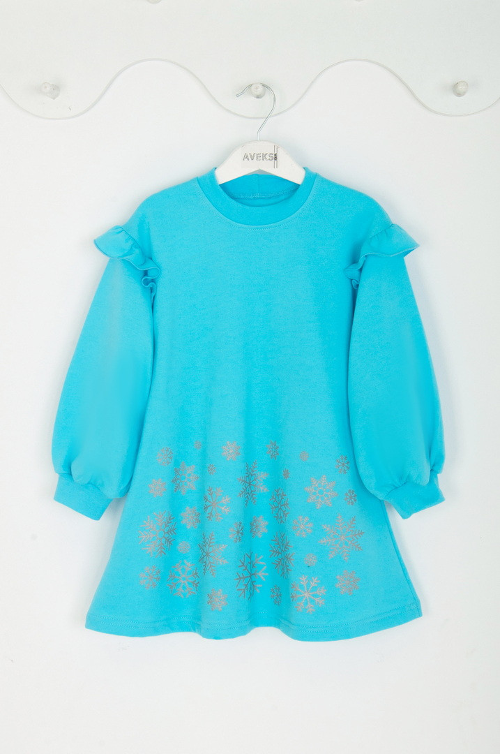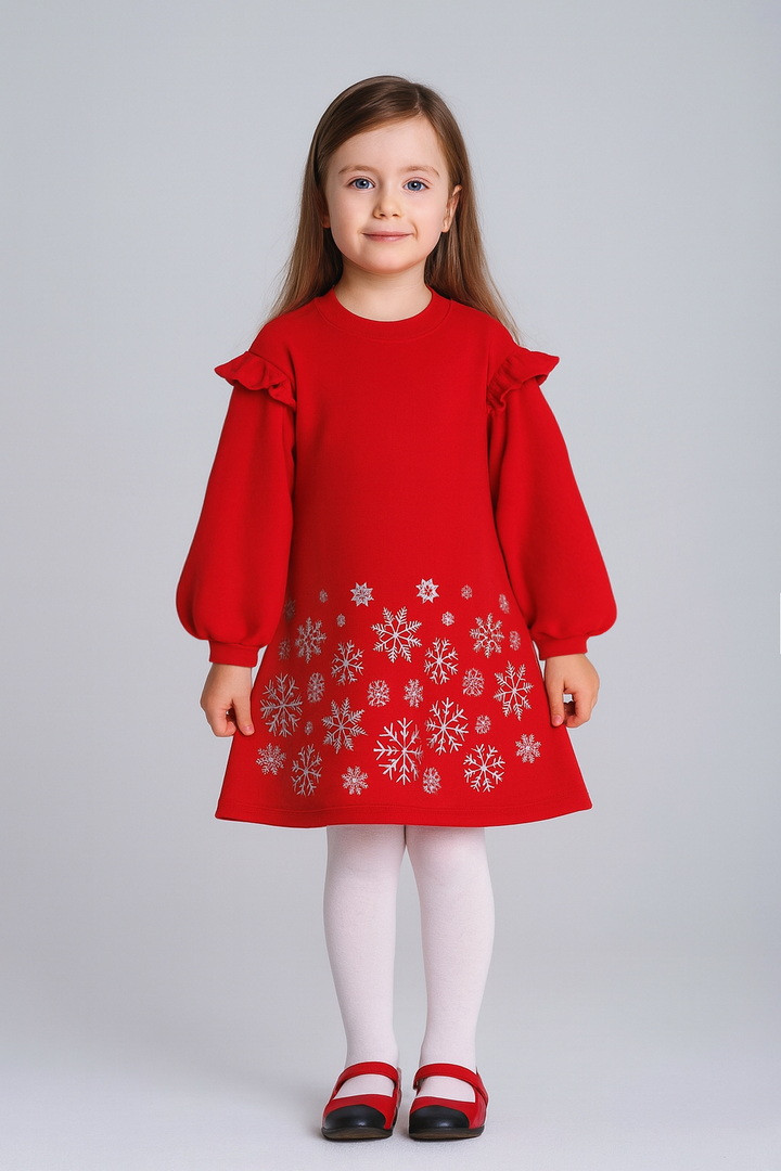 Стильна та комфортна сукня для дівчаток, виготовлена з м’якого футера з начосом — ідеальний вибір для прохолодного сезону. Модель має вільний А-силует, який забезпечує максимальний комфорт під час активних ігор чи святкових заходів. Довгі об’ємні рукава на манжетах та акуратні волани на плечах, додають виробу ніжності та оригінального вигляду. Низ сукні прикрашений красивим принтом зі сніжинками, що створює святковий настрій і робить модель особливо привабливою для зимових свят та фотосесій. Футер із начосом дарує тепло та затишок, при цьому добре тримає форму й залишається приємним до тіла.
