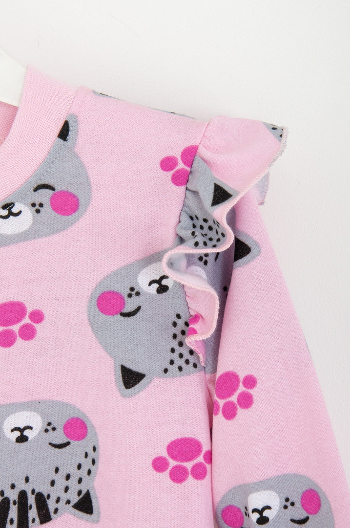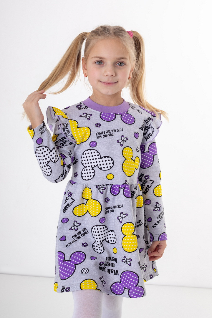 Стильна та комфортна сукня з м’якого набивного начосу — створена спеціально для маленьких модниць. Модель має довгий рукав та приємний до тіла внутрішній начіс, який забезпечує додаткове тепло та комфорт у прохолодну погоду. Верхня частина сукні прикрашена акуратними воланами на плечиках, що додають виробу ніжності та об’ємності. Низ виконаний у вигляді злегка розкльошеної спіднички, тим самим надає гарний вигляд цій сукні. Головна прикраса виробу — яскравий набивний принт, який створює грайливий настрій та робить модель по-справжньому дитячою та святковою. Сукня добре сидить по фігурі, зберігає форму після прання та підходить як для щоденного використання, так і для особливих моментів.