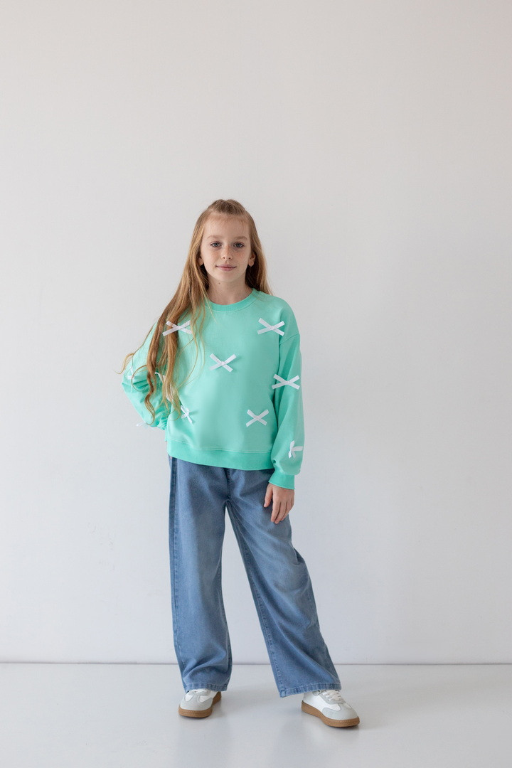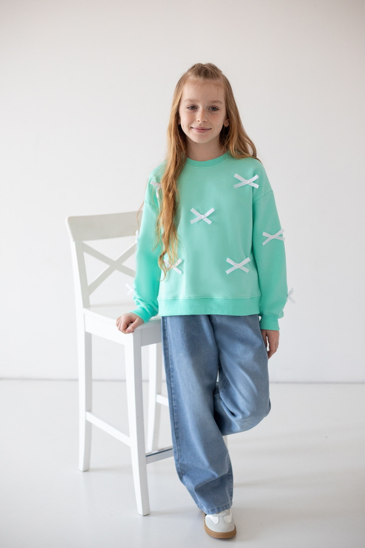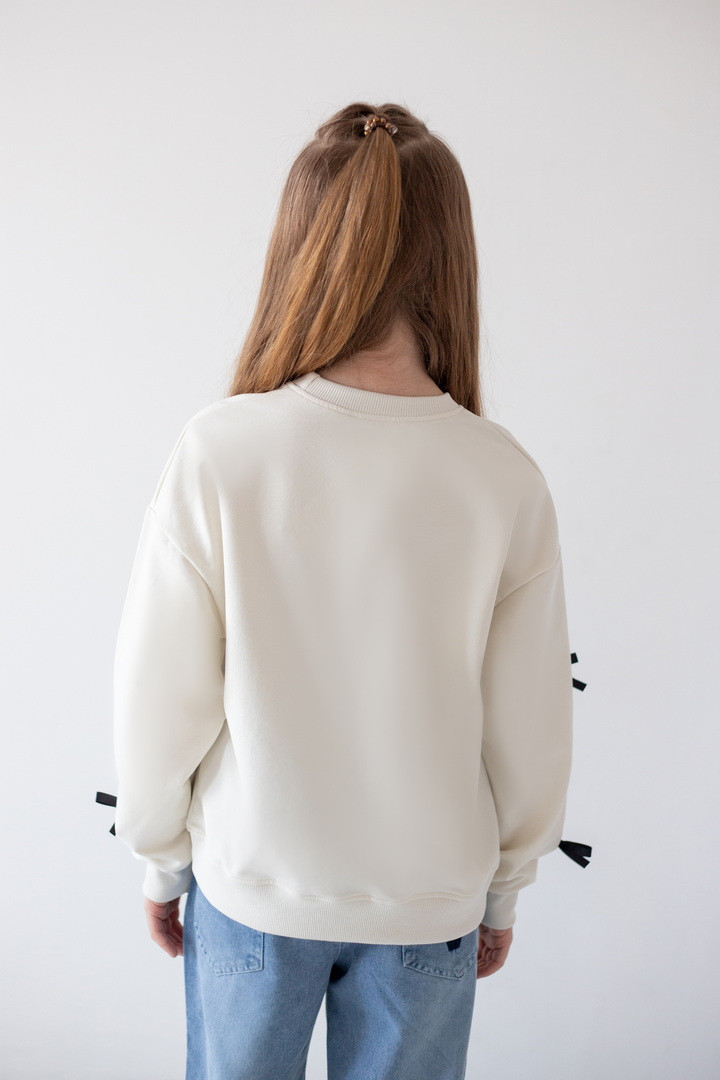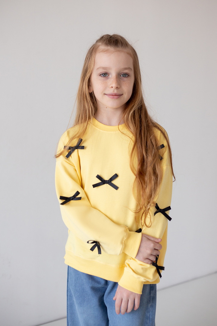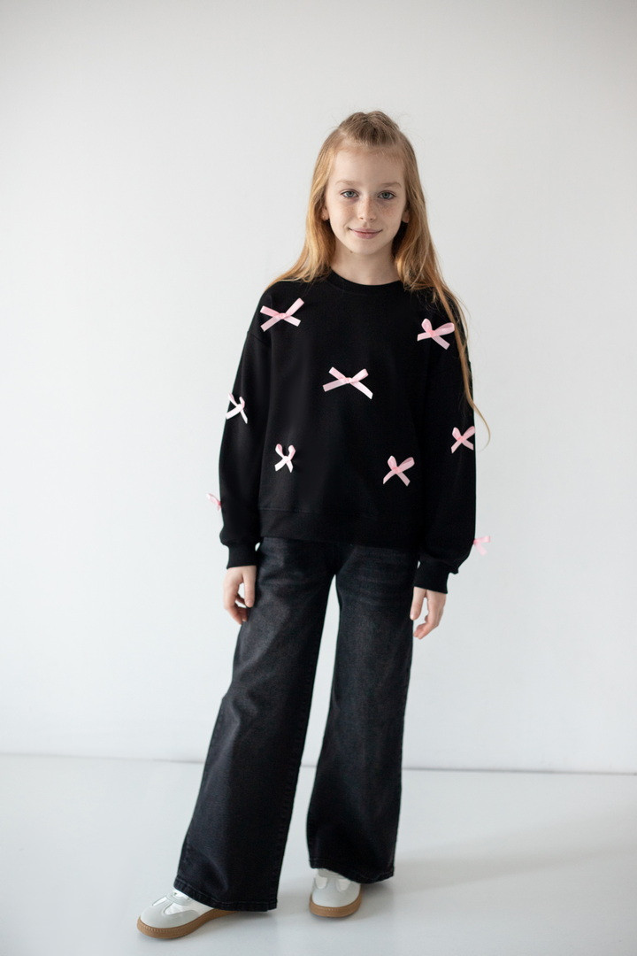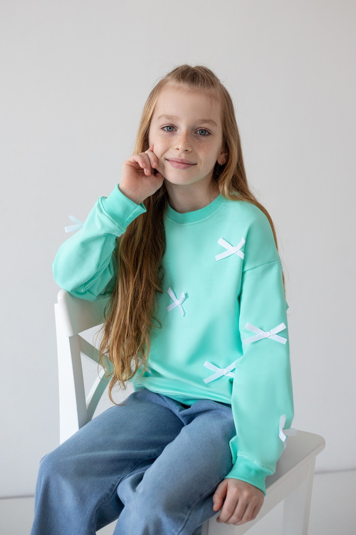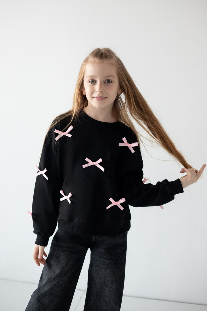 Ніжний, трендовий та неймовірно комфортний — цей світшот створений для дівчат, які вже мають свій характер і власне бачення стилю. Світшот гармонійно поєднується з контрастними декоративними бантиками, що додають образу грайливості, легкості та особливого шарму. Виготовлений із якісного двониткового футера — тканини, яка чудово тримає форму, приємна до тіла та забезпечує комфорт протягом усього дня. Світшот м’який, дихаючий та практичний. Вільний крій дарує свободу, а манжети та нижня резинка акуратно фіксують посадку. Це не просто світшот — це річ, яка підкреслює індивідуальність та додає впевненості кожній дівчинці.