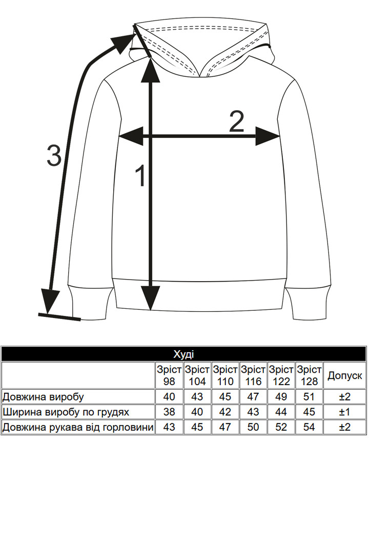 Довжина рукава від горловини | 43 | 45 | 47 | 50 | 52 | 54 | ±2 |