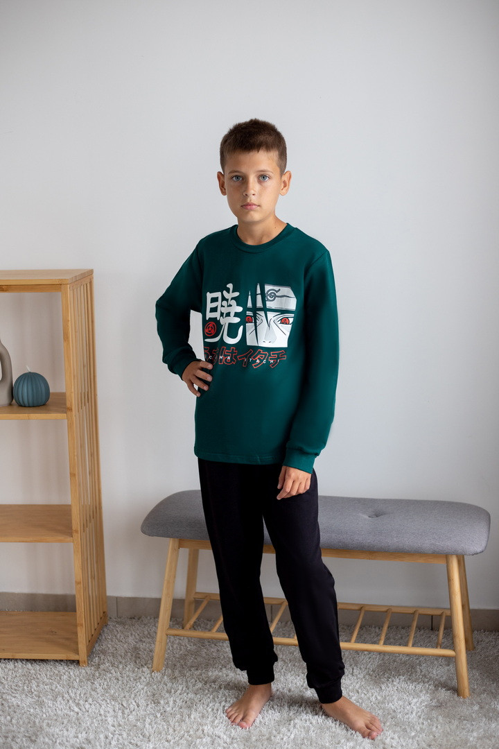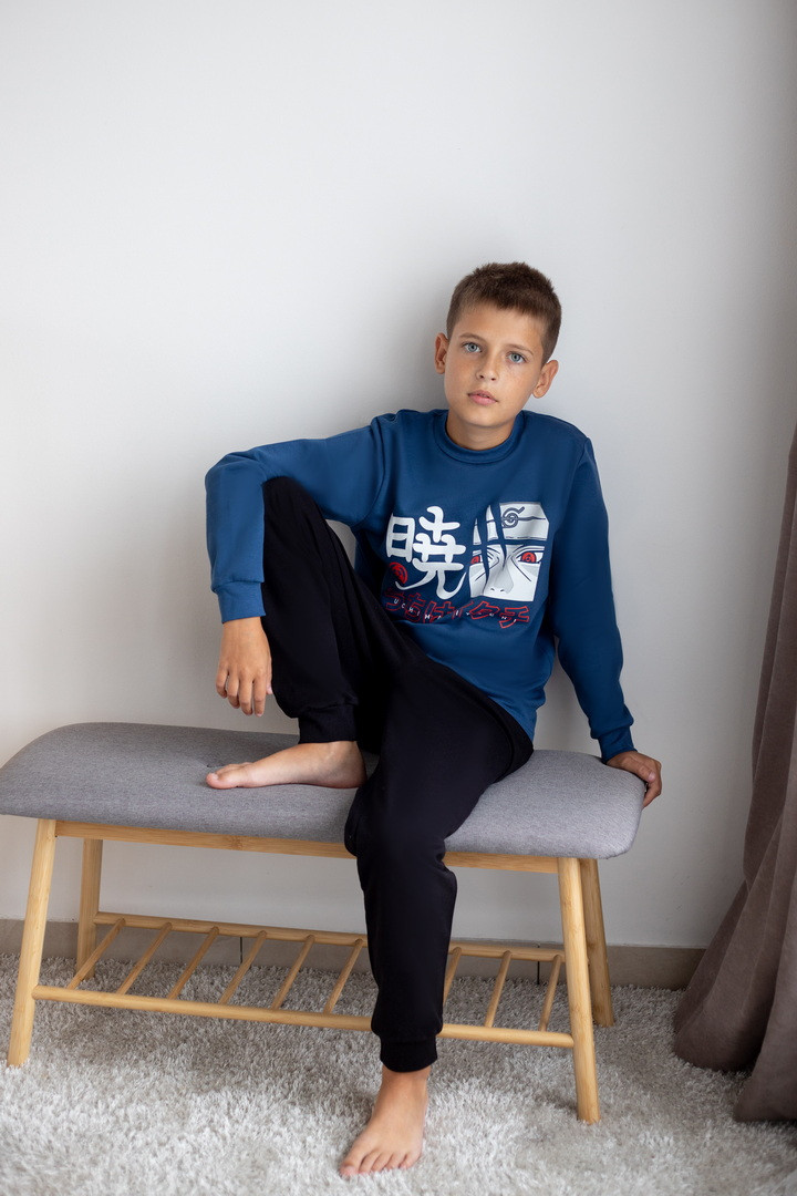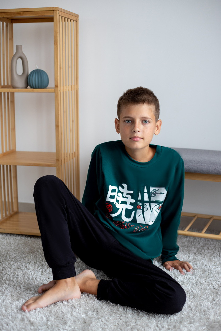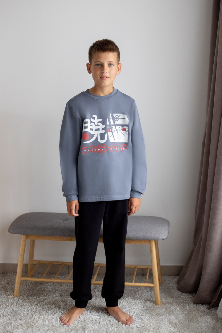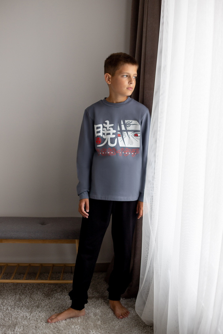 Базова тепла піжама для хлопчиків-підлітків із футера з начосом. Модель складається з кофти з довгими рукавами на манжетах та коміром-стійкою, а також штанів на манжетах. Піжама має як декор - принт, виконаний методом шовкотрафаретного друку. Полотно натуральне за складом може дати усадку після прання. Важливо дотримуватися рекомендацій щодо догляду за виробом.