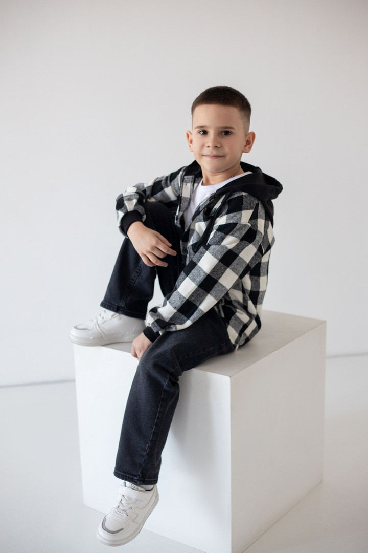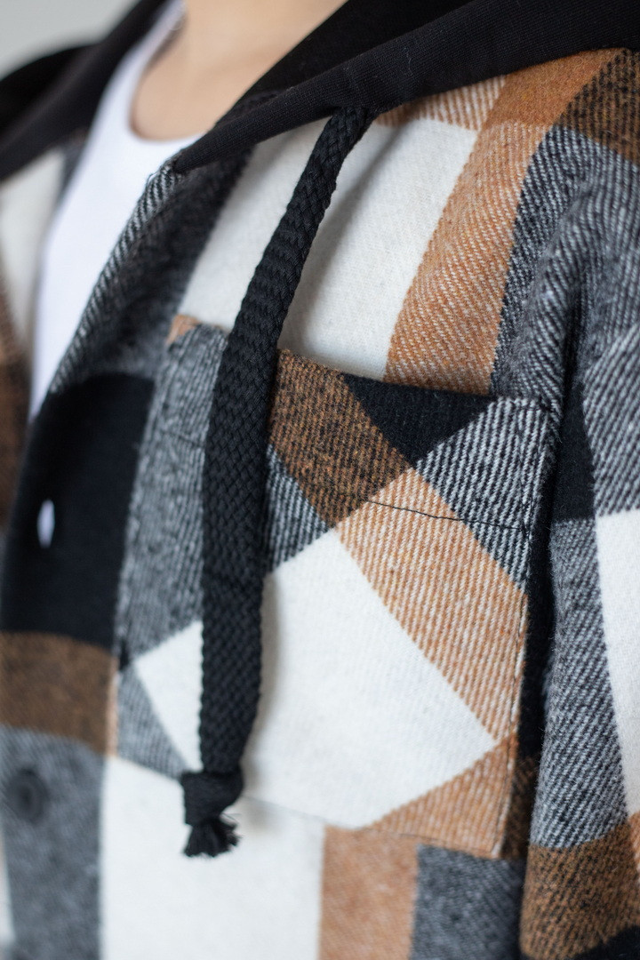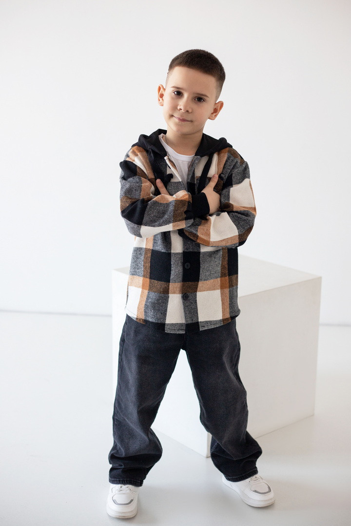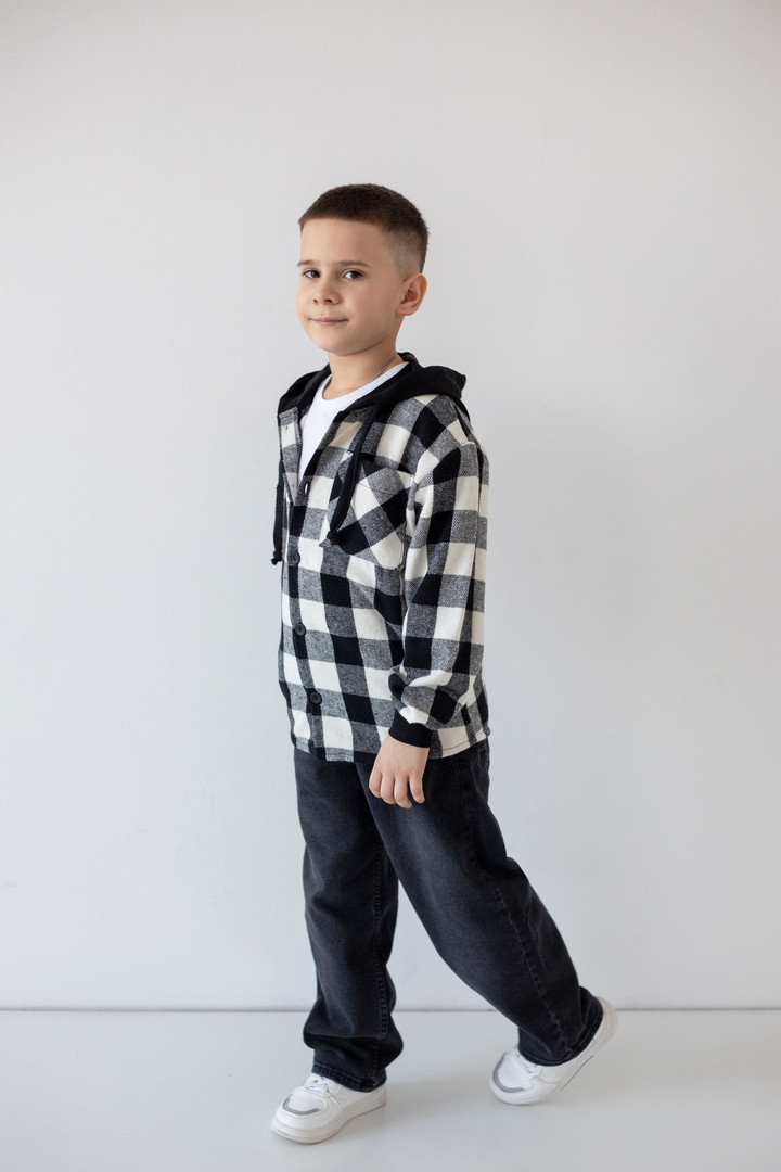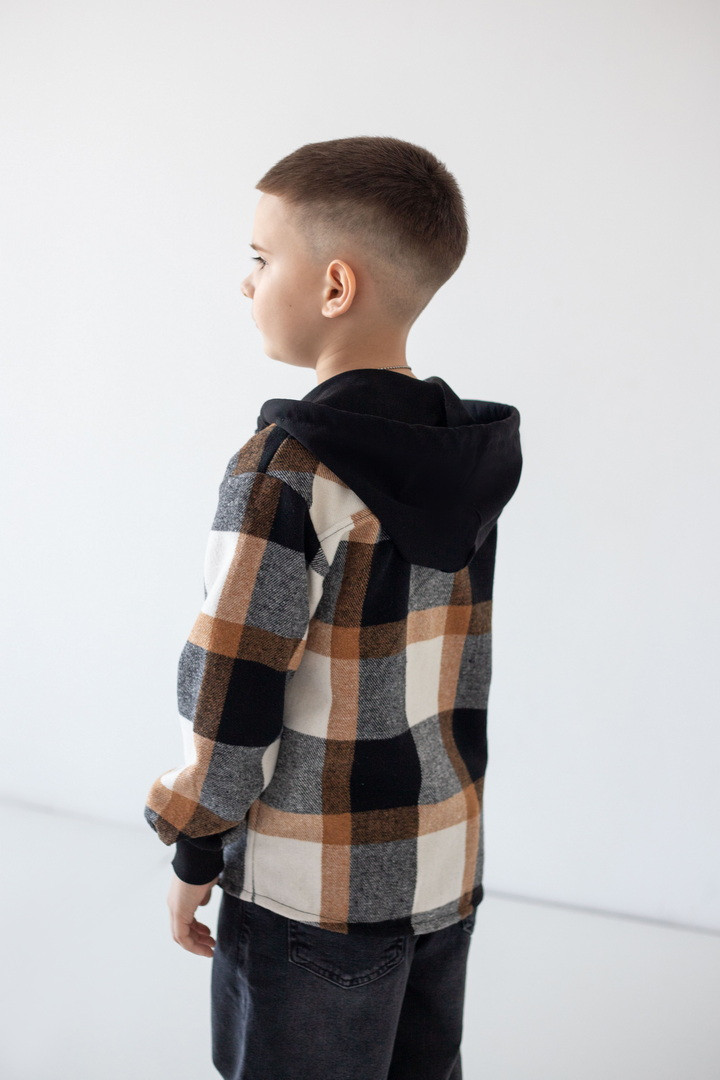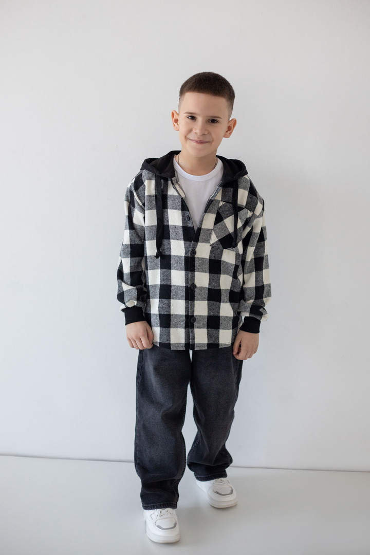 Ця рубашка — ідеальний баланс між теплом, зручністю та стилем. Рубашка створена для активних хлопчиків, які не сидять на місці. Вона поєднує вигляд трендової сорочки та комфорт улюбленої куртки. Виріб виготовлений з м’якої байки — щільної, теплої та приємної на дотик тканини, що чудово утримує тепло й водночас дозволяє шкірі дихати. Картатий візерунок додає образу динаміки та сучасності, а капюшон зі шнурками робить модель практичною для прохолодної погоди. Манжети з еластичної резинки забезпечують комфортну посадку та захищають від вітру, а застібка на ґудзики дозволяє легко одягати й знімати виріб. Це універсальна річ, яка виглядає стильно, носиться довго й дарує тепло щодня.
