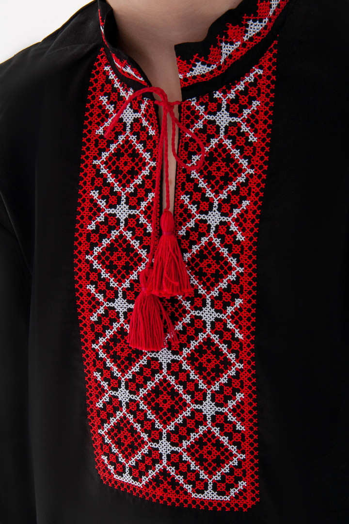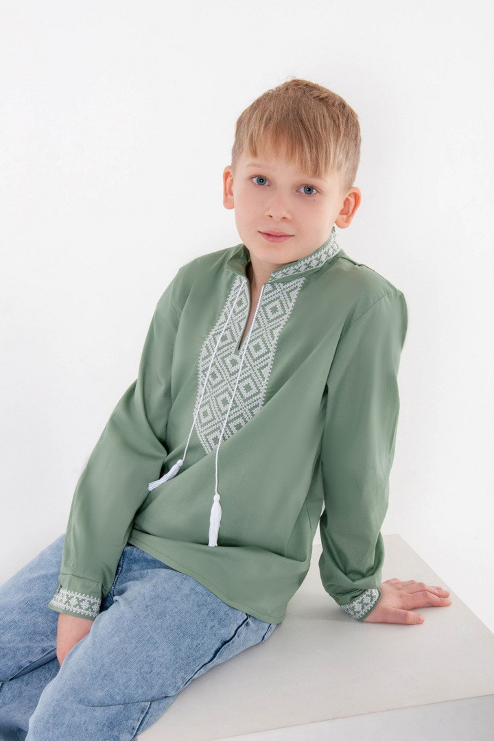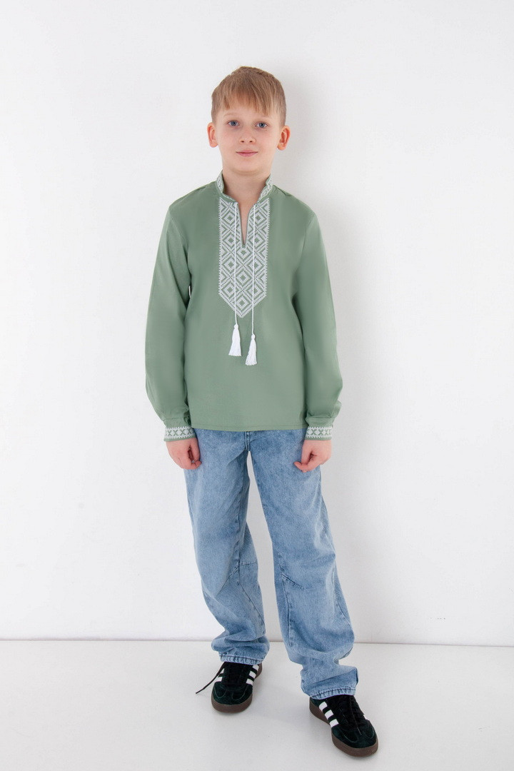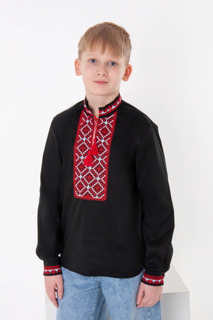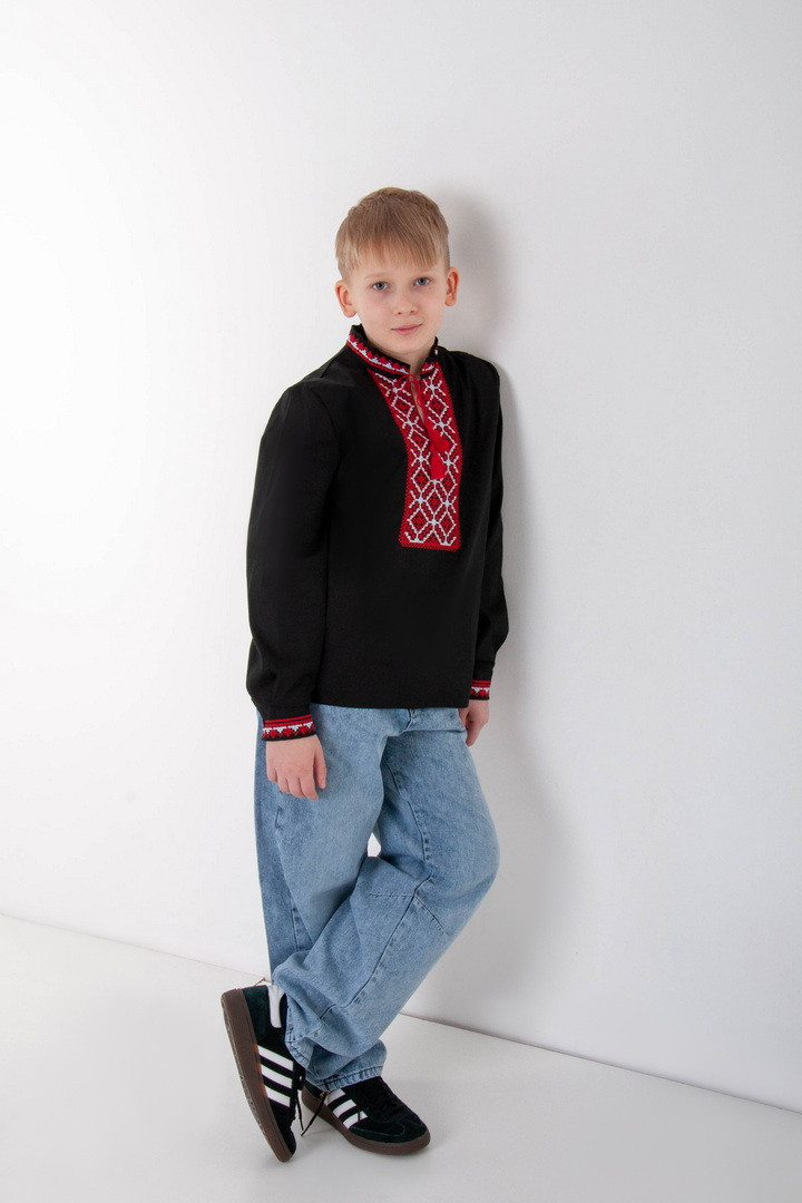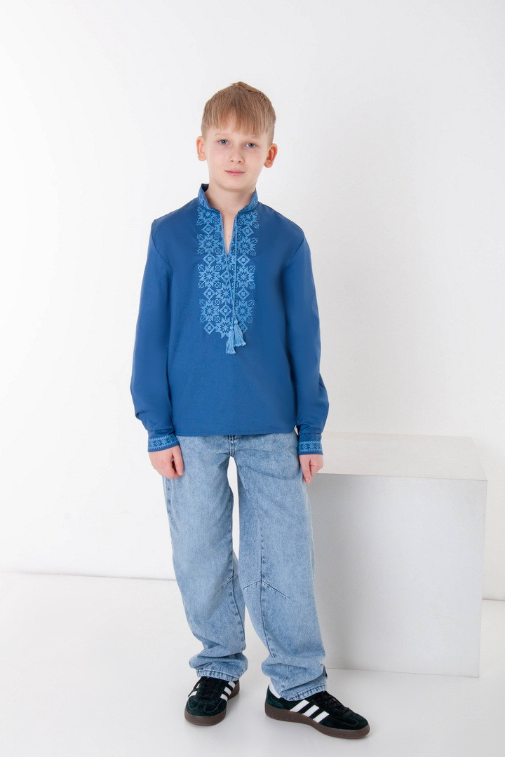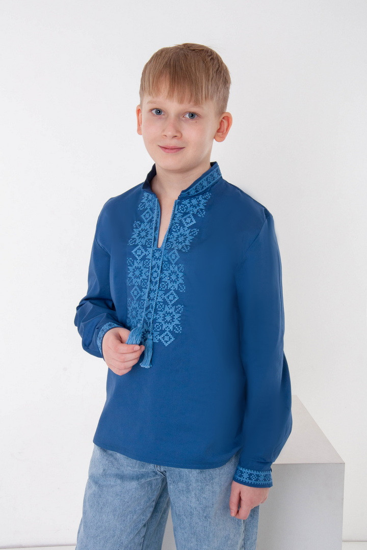 Вишиванка для хлопчиків з довгим рукавом виготовлена з полотна "Полікоттон". Полікоттон – зносостійкий, міцний матеріал, який довго прослужить, не втрачаючи свого первісного вигляду. У цій тканині гігроскопічність та повітропроникність бавовняних волокон доповнена практичним та міцним поліестером. Дана модель прямого крою, має комір-стійку, рукава та перед вишиванки прикрашений вишитим орнаментом.
