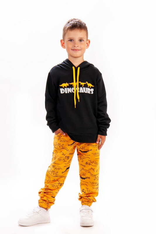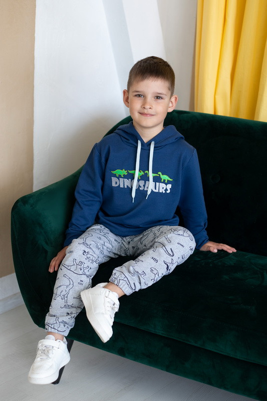 Яскравий спортивний костюм для хлопчиків складається з худі і брюк. Худі вільного крою, з капюшоном, довгими рукавами на манжетах, по низу також манжет, виконаний з однотонного двониткового футера, з вишивкою динозаври. Штани з кишенями, еластичною тасьмою по низу, пришивним поясом з широкою еластичною тасьмою, відстрочкою і шнурком, виконані з принтованого двониткового футера з малюнком динозаври. Полотно досить щільне, хорошої якості - відмінний варіант для осені, підходить для прогулянок, занять спортом, активного відпочинку. Костюм представлений в декількох комбінаціях на будь-який смак. Полотно може давати усадку після прання.