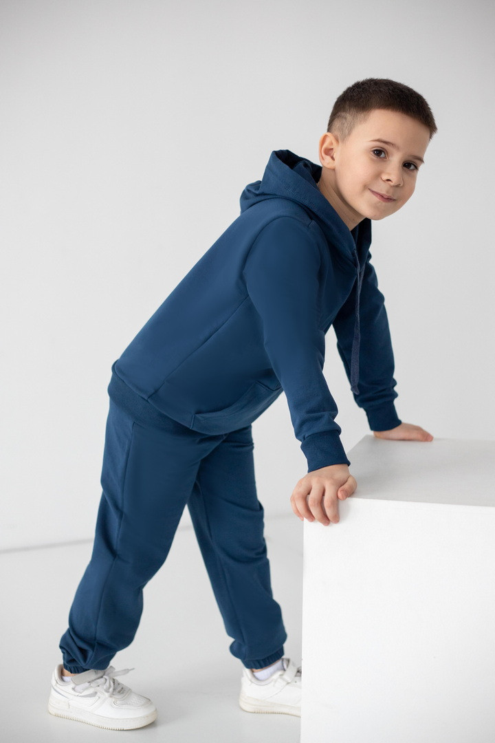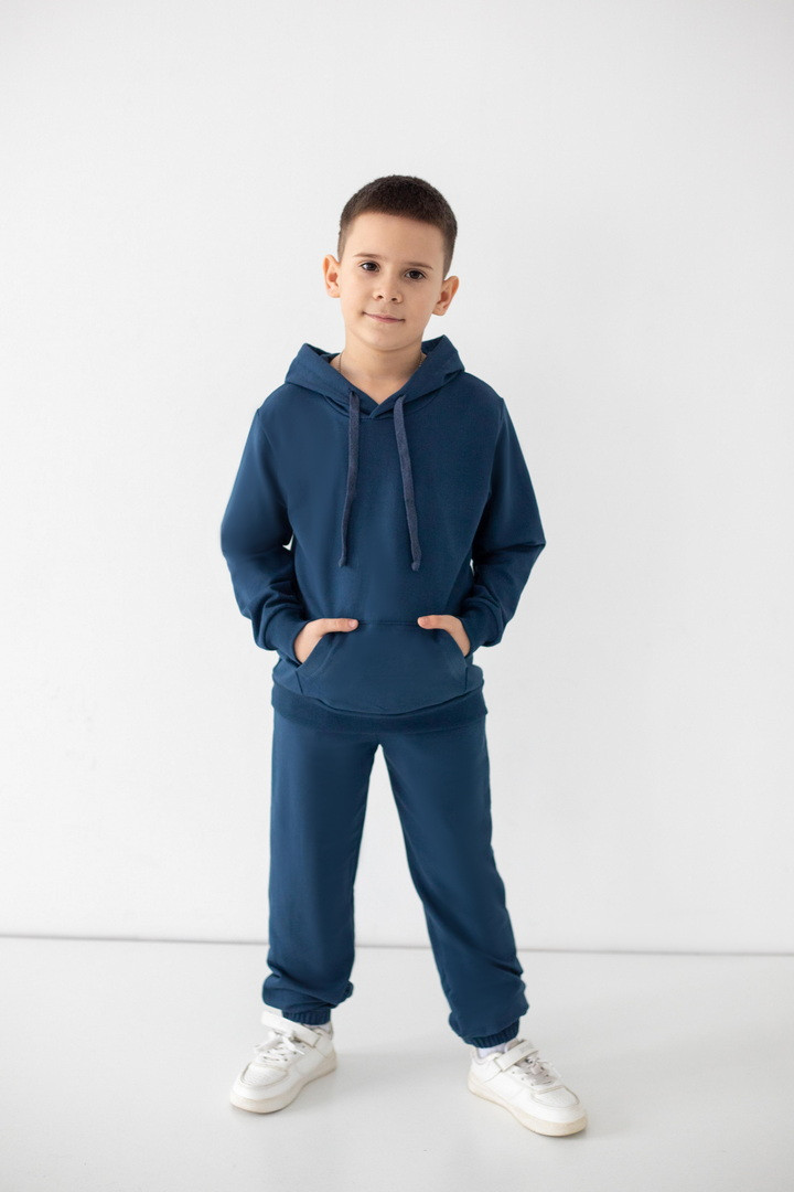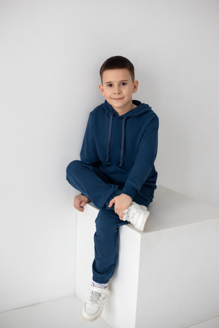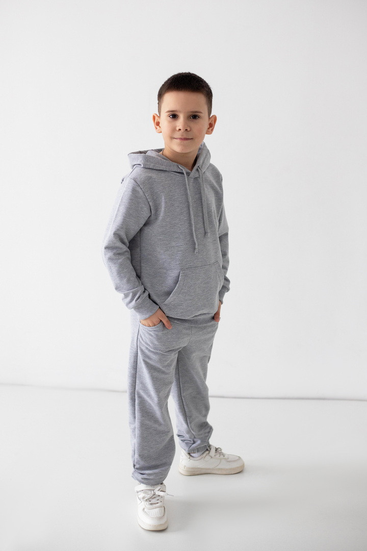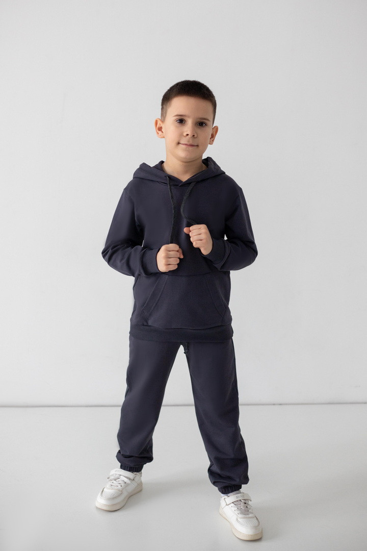 Цей костюм із двониткового футера створений для руху, драйву та щоденних відкриттів. Худі з капюшоном має продуманий крій: вільний силует дарує свободу, але водночас виглядає акуратно та зібрано. Кишеня-кенгуру — зручний акцент, який додає характеру та практичності. М’які манжети забезпечують комфортну посадку без тиску та перекручування. Штани ідеально балансують між зручністю та стилем: еластичний пояс із регулюванням, дозволяє підігнати посадку саме під вашу дитину, а манжети формують охайний, трендовий силует. Нічого зайвого — лише комфорт і функціональність. Двонитковий футер приємний до тіла, добре тримає форму та витримує активний ритм життя. Це саме той костюм, у якому хлопчик почувається впевнено, вільно та по-справжньому комфортно.