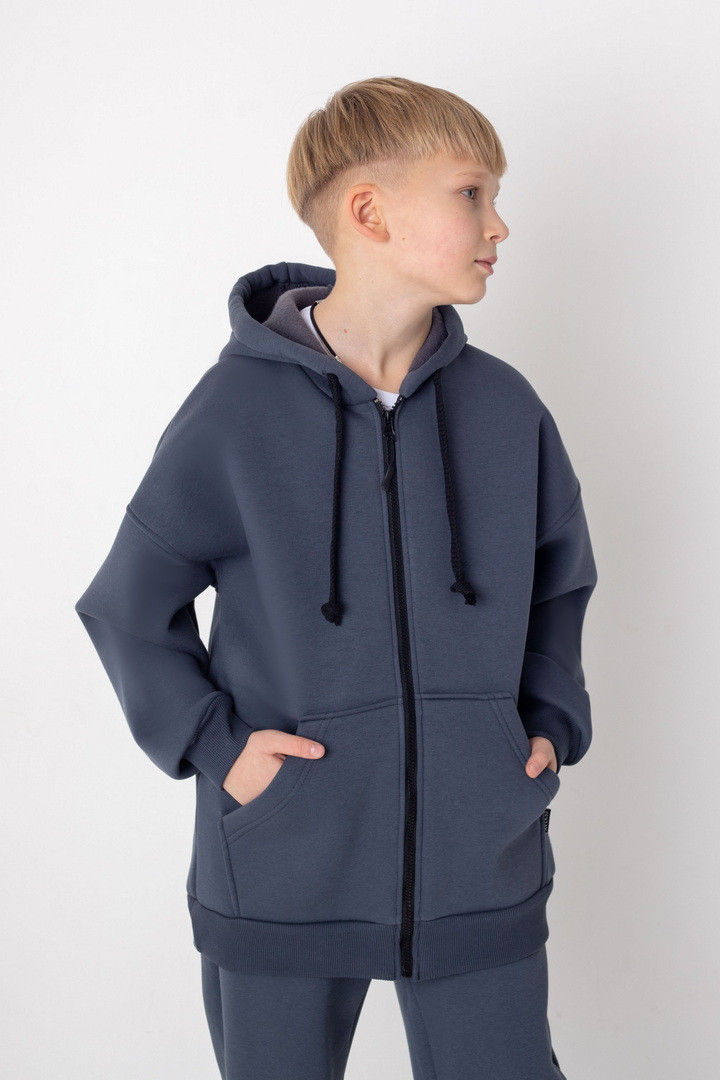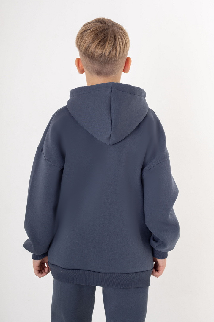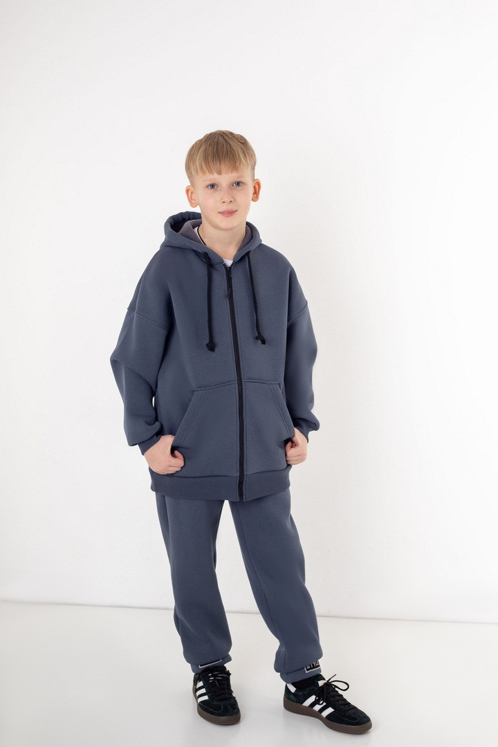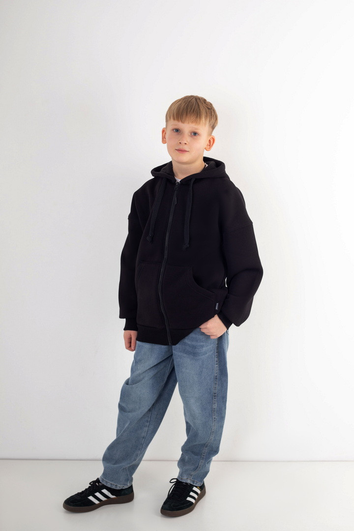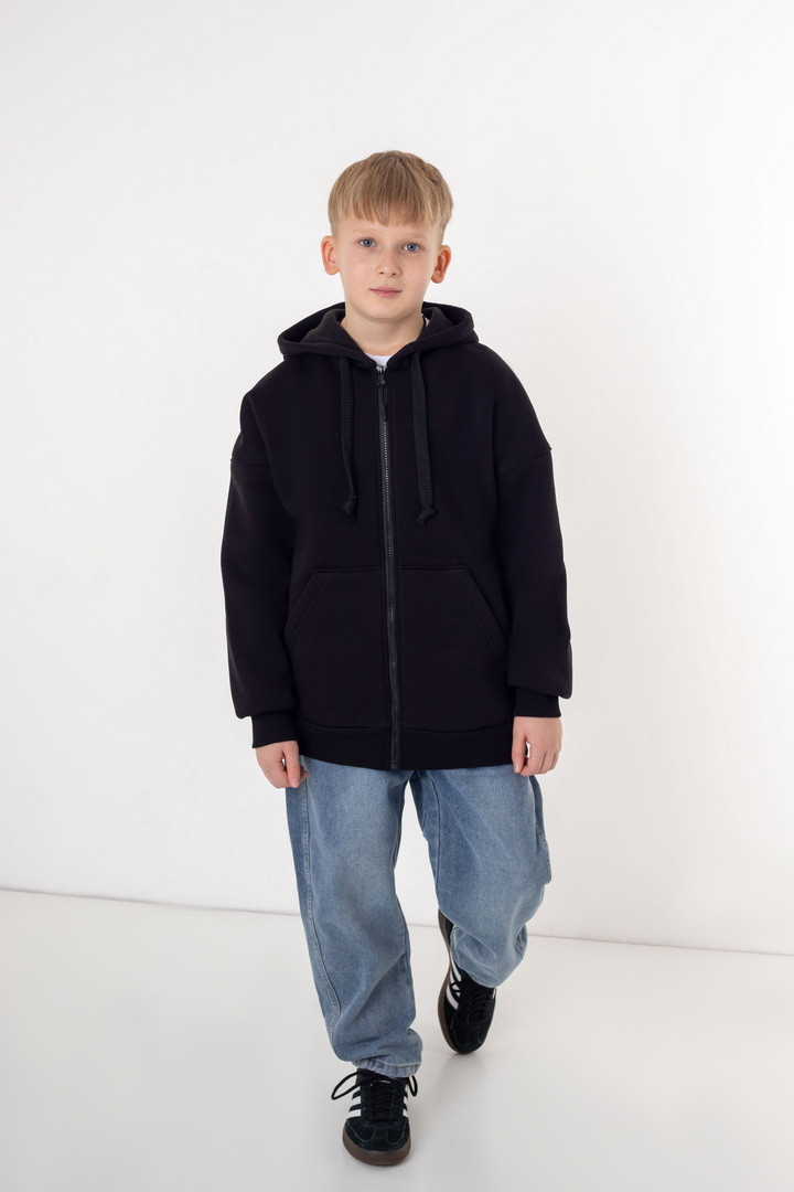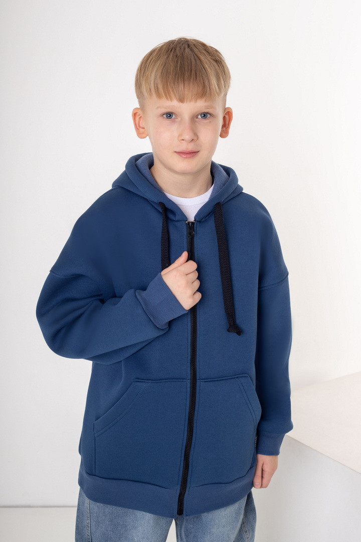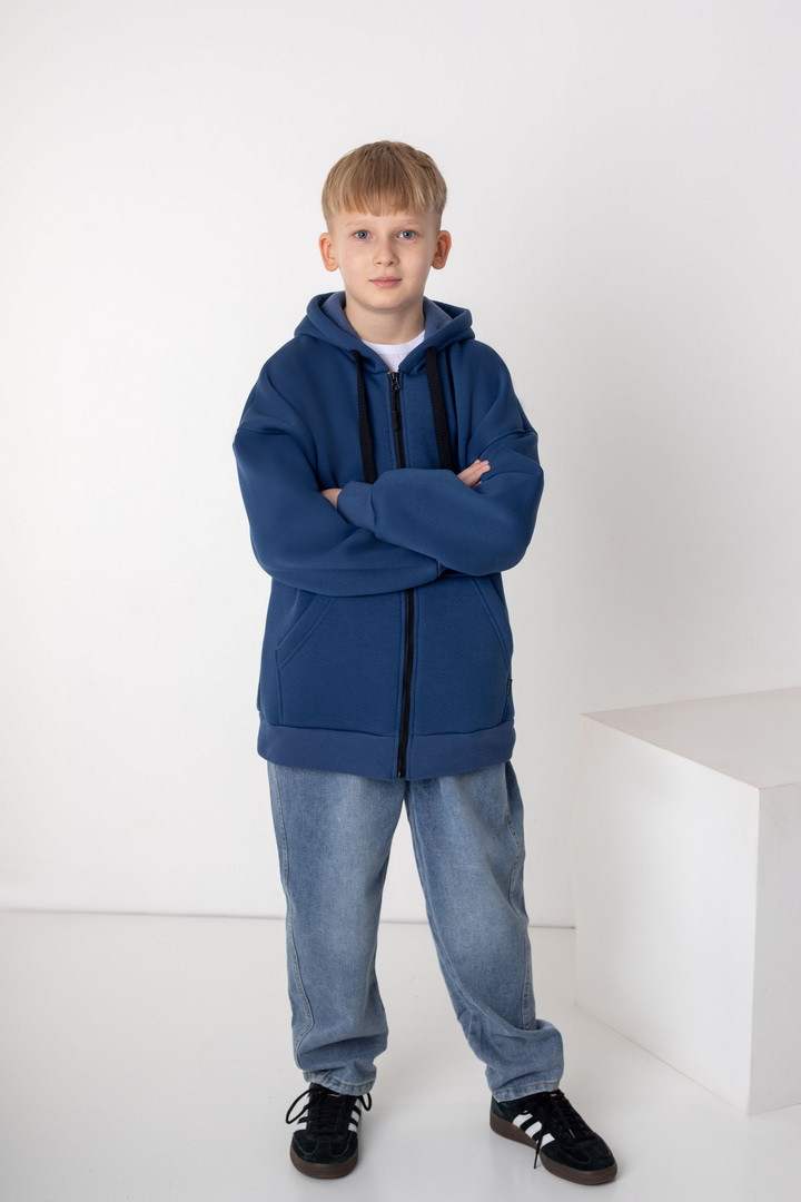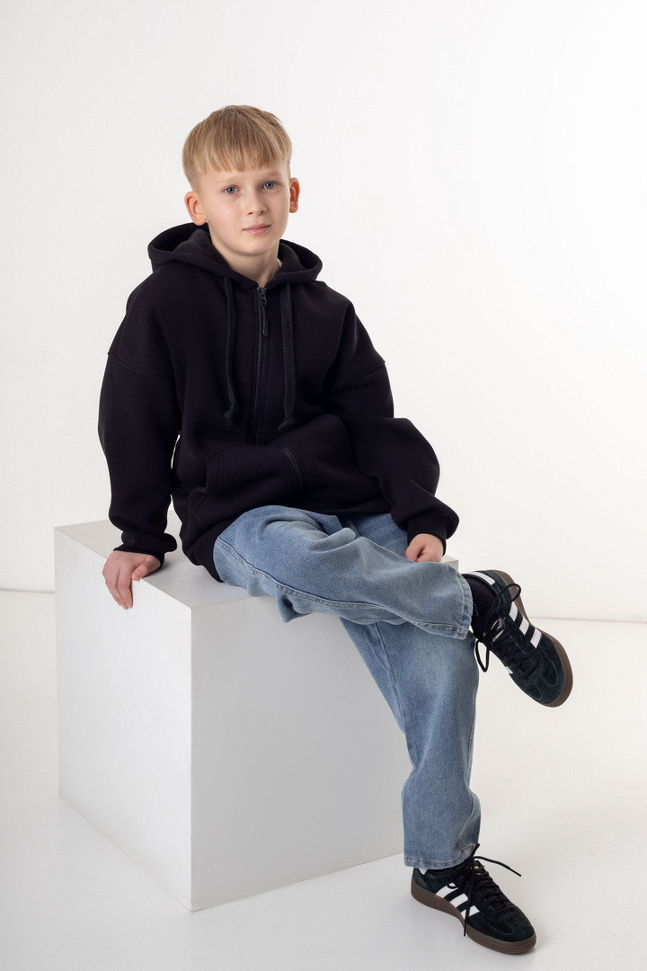 Підліткове зіп-худі з триниткового футера з начосом — це тепла й універсальна модель, створена для щоденного комфорту. Завдяки щільному тришаровому полотну з м’яким начосом зсередини, худі чудово утримує тепло та приємне до тіла, що робить його ідеальним для прохолодної осені та зими. Модель оснащена надійною блискавкою, яка дозволяє застібати виріб та регулювати ступінь утеплення. Капюшон глибокий і добре формований, забезпечує додатковий захист від вітру. Попереду розташована велика кишеня-кенгуру — зручний і практичний елемент, у який можна покласти необхідні дрібниці або зігріти руки. Манжети та низ виробу виконані з трикотажу, що забезпечує ідеальну посадку та зберігає форму навіть після тривалого носіння. Це надійний, стильний та комфортний варіант одягу, який стане улюбленим у гардеробі хлопця.