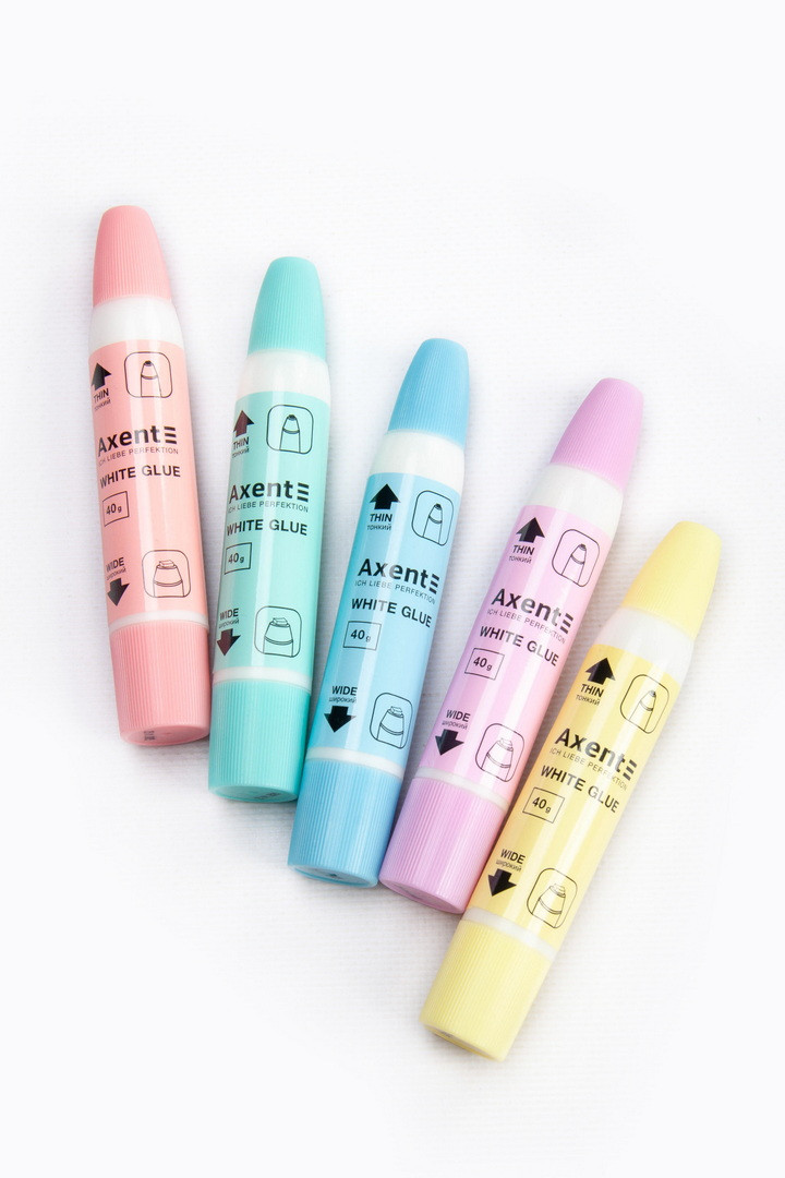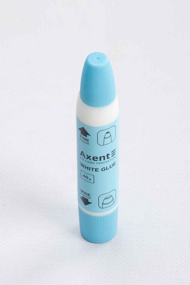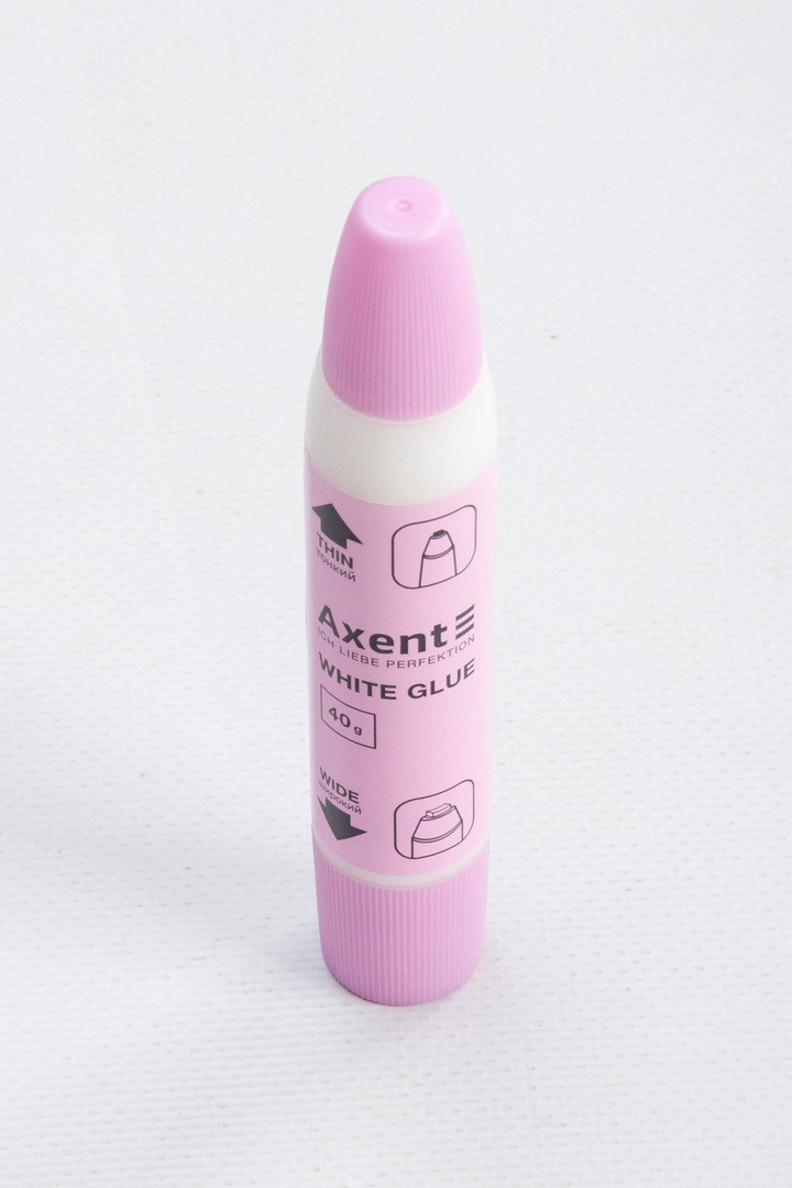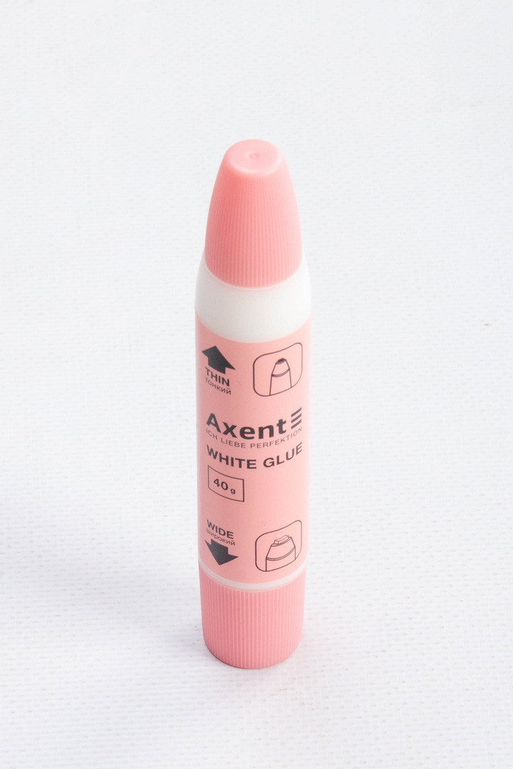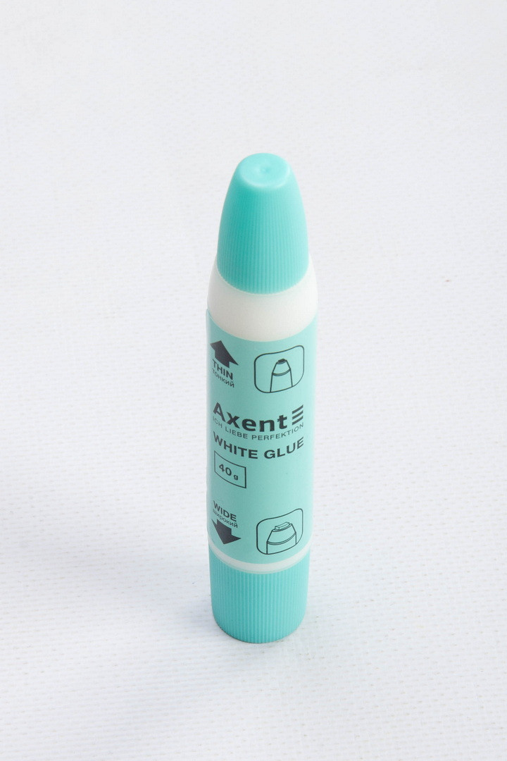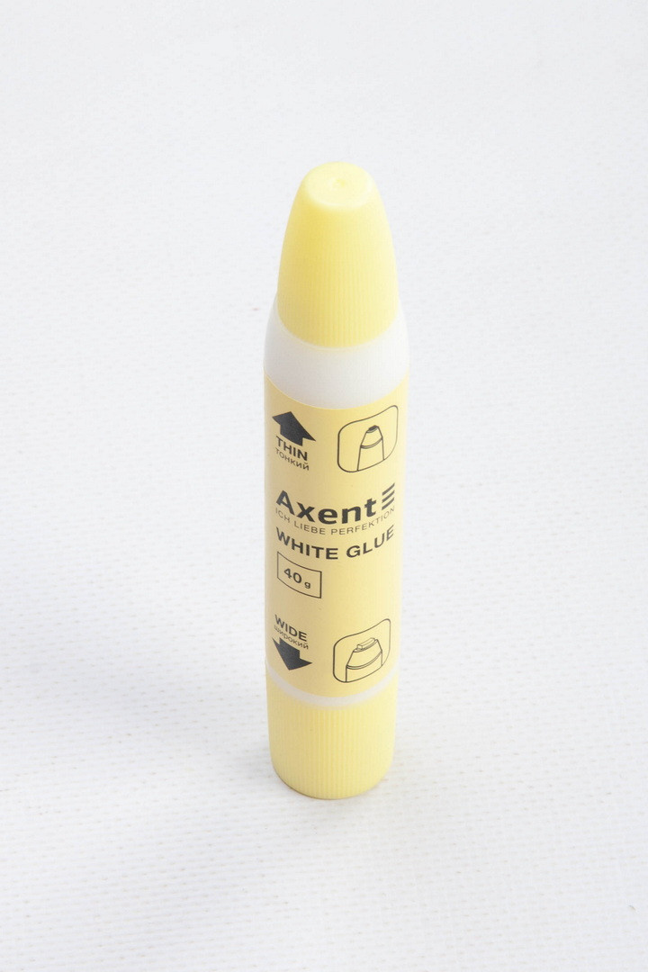 Клей використовується для склеювання паперу, картону, фотографій та тканин. Особливість клею – на корпусі розміщені два аплікатори: тонкий та широкий, завдяки чому можна швидко, акуратно та економно склеювати як дрібні деталі, так і великі за розміром ділянки. Клей швидко сохне, економічний у роботі.