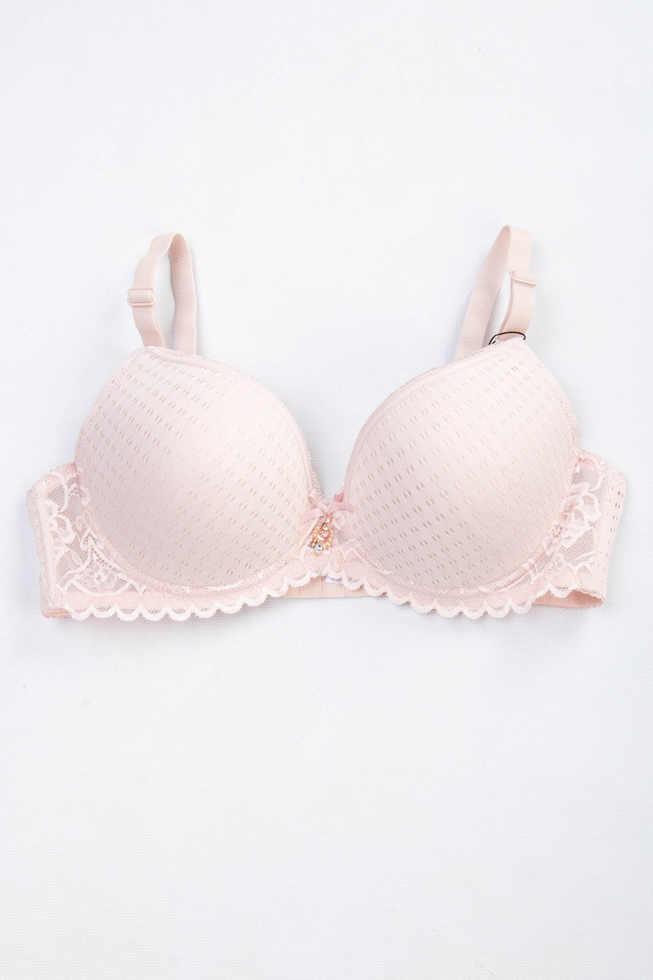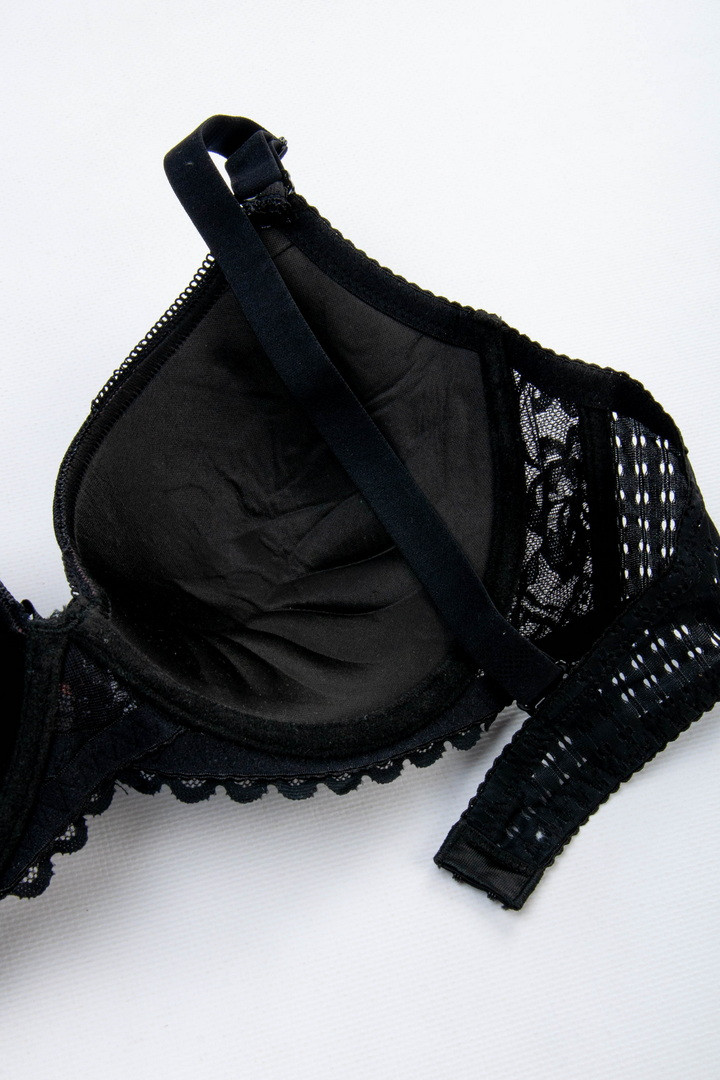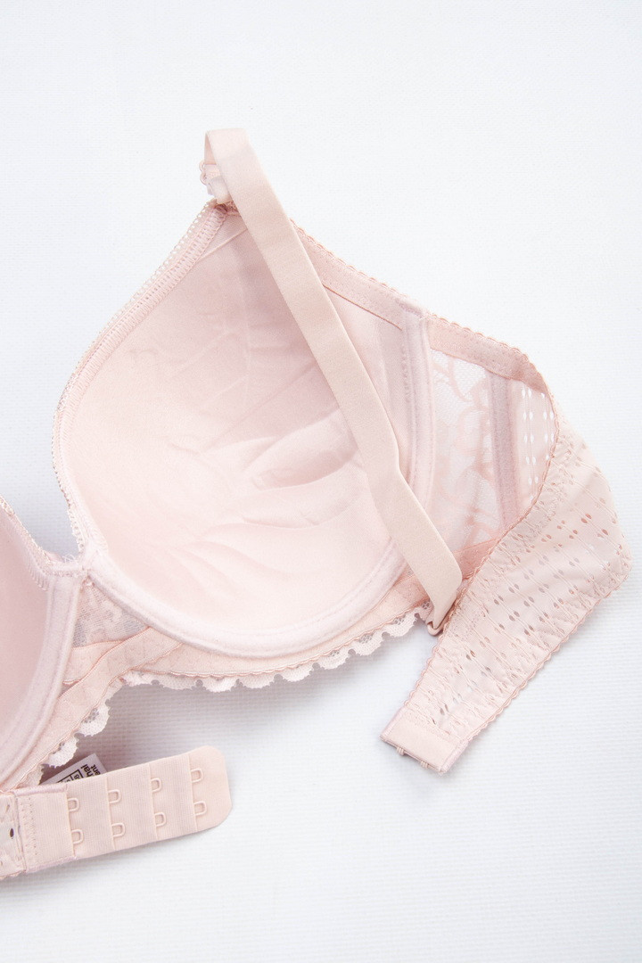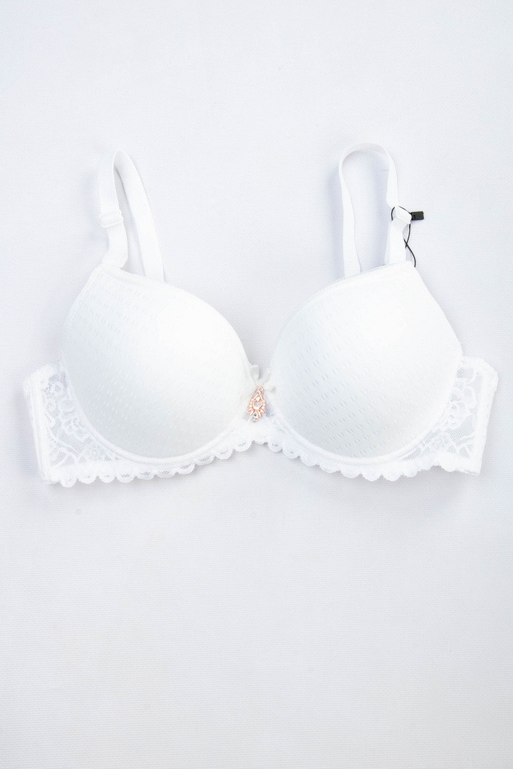 Бюстгальтер із формованими чашками із тонкого поролону та легким поролон-коректором, виконаний на кісточці для надійної підтримки. Пояс у зоні декольте прикрашений витонченим контурним мереживом. Знімні регульовані бретелі та класична застібка на 2 гачки/4 рівня подовження.