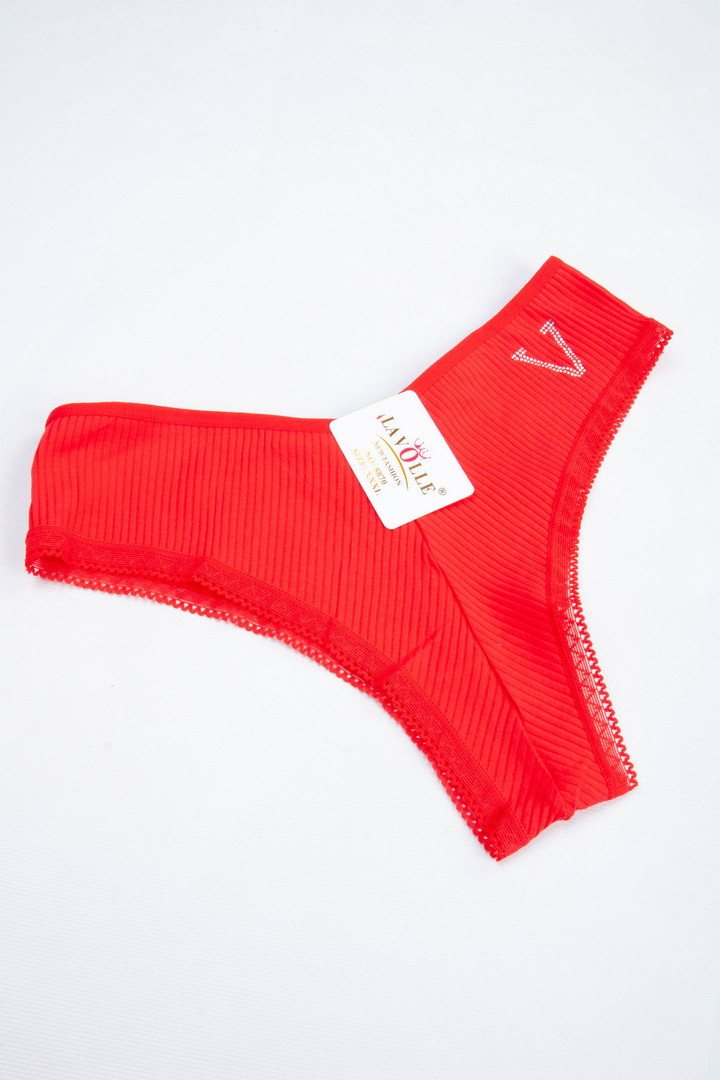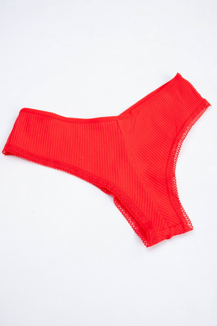 Рифлені труси-тангу з мереживом. Виготовлені з бавовняного матеріалу із фактурними смужками по вертикалі з мереживом по краях. Мають середню посадку талії з високим вирізом на стегнах. Дана модель еластична та приємна на дотик, яка забезпечує комфорт при носінні.