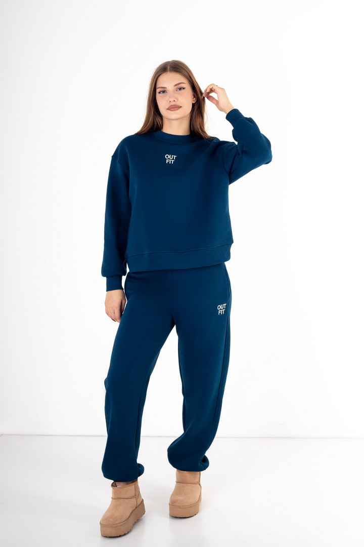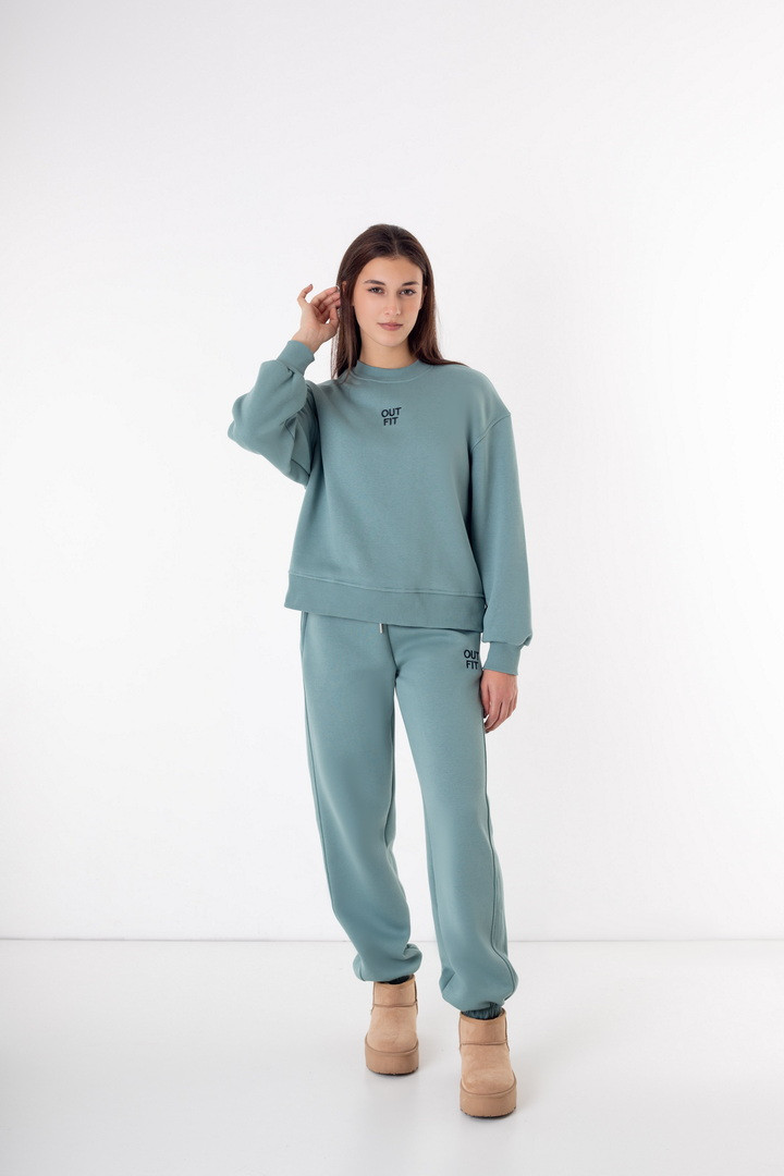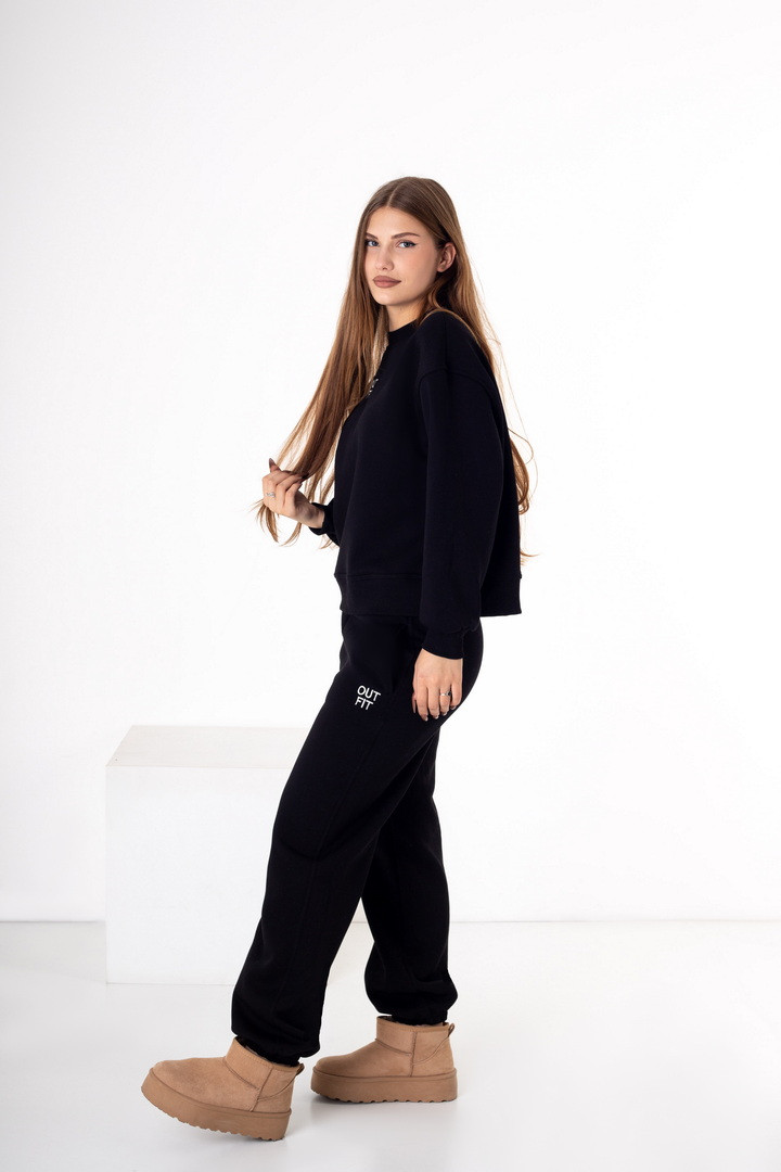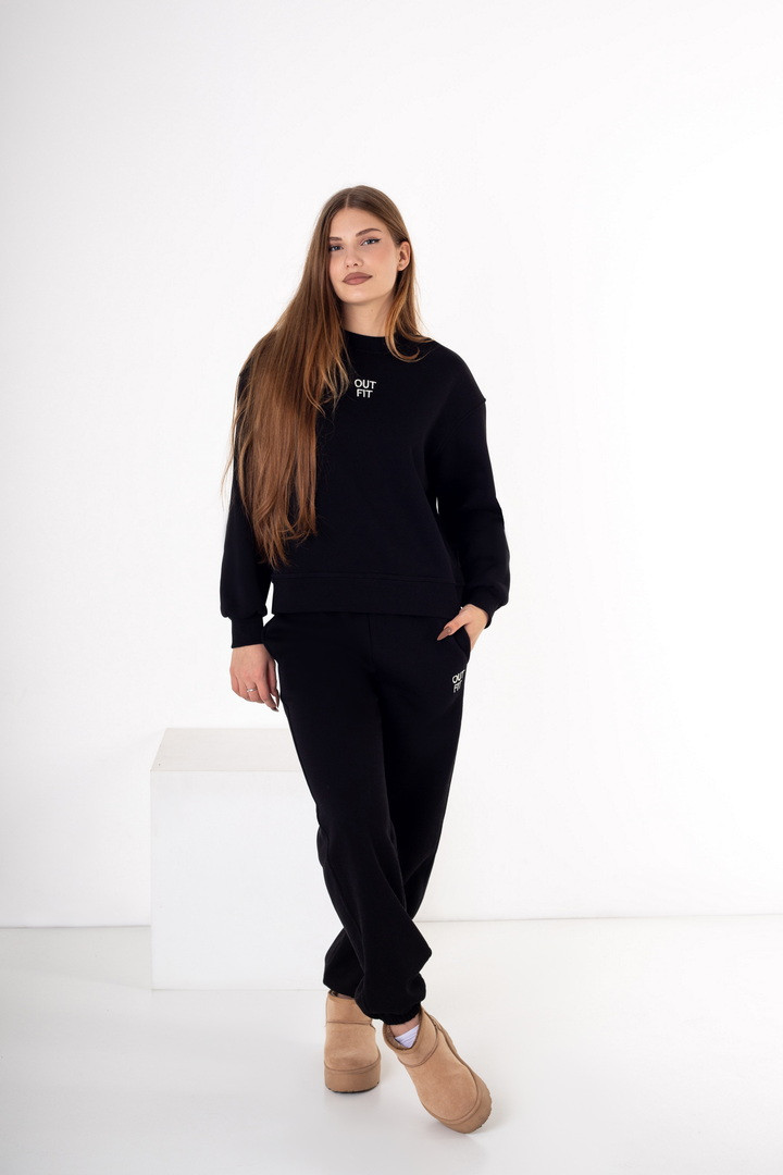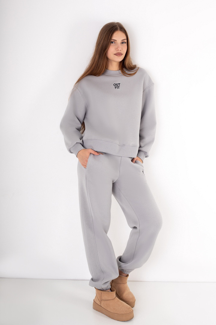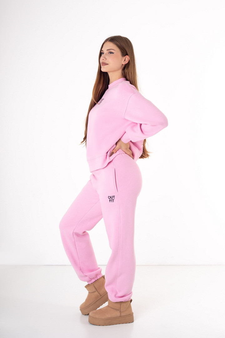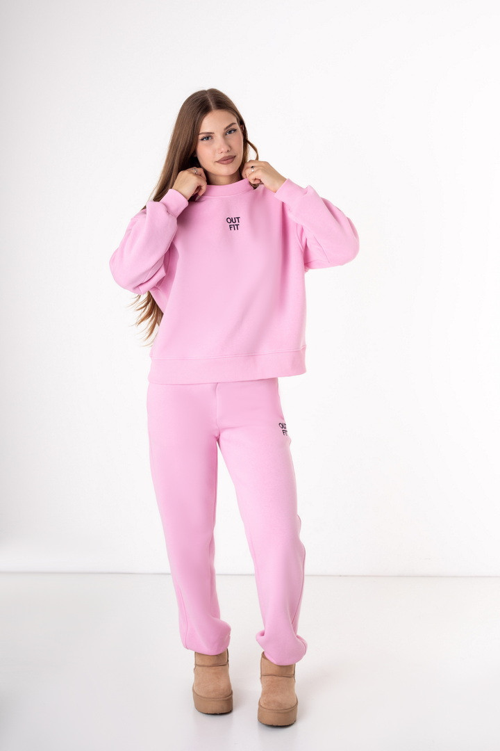 Жіночий костюм з футера тринитки — стильний і комфортний вибір для повсякденного образу. Костюм складається зі світшота вільного крою та штанів із манжетами. Світшот має спущену лінію плеча, круглу горловину та невелику вишивку на грудях. Штани оснащені зручним поясом на резинці та кишенями з боків, що додають практичності. М’яка, приємна на дотик тканина забезпечує тепло і комфорт у прохолодну пору року. Ідеально підходить для прогулянок, відпочинку або стильного casual-луку.