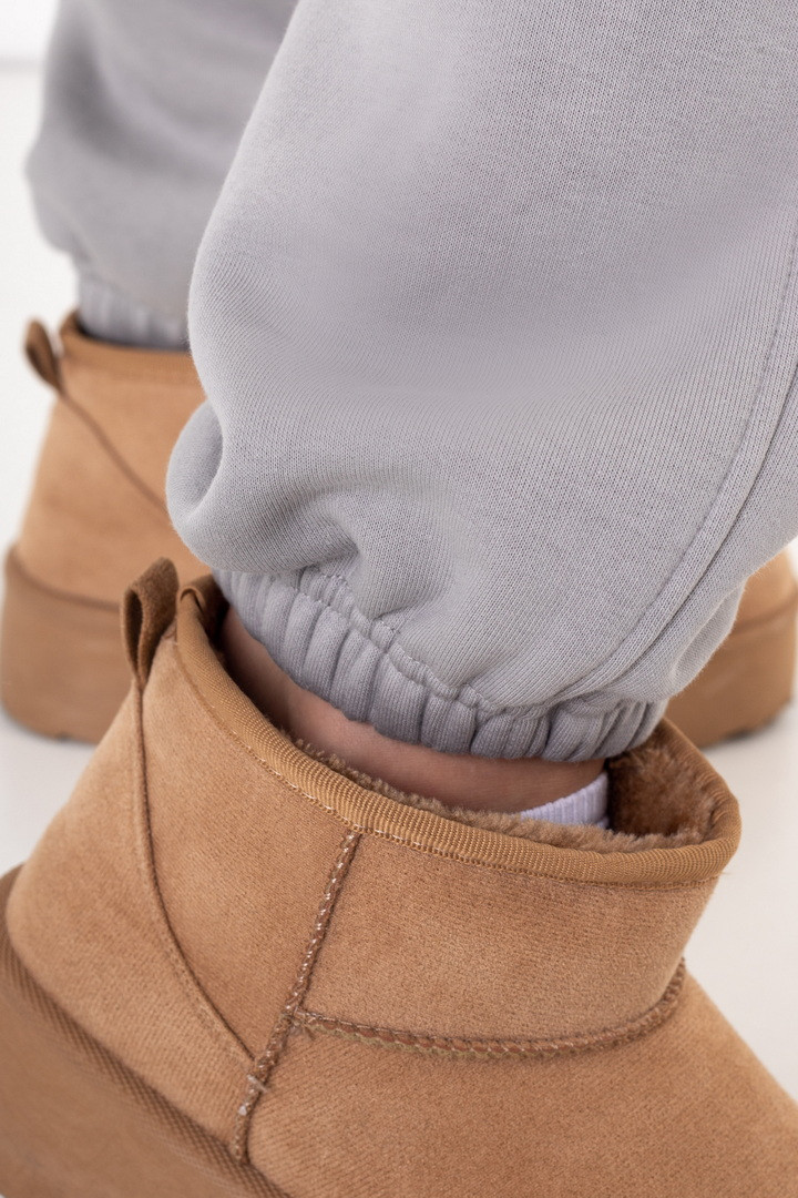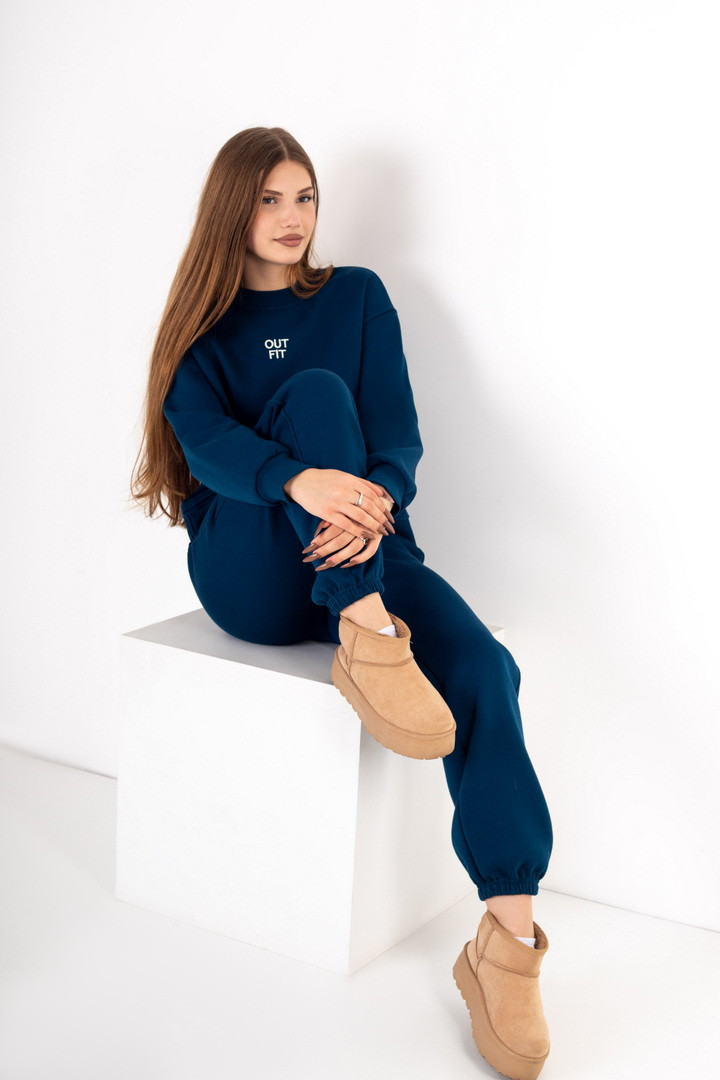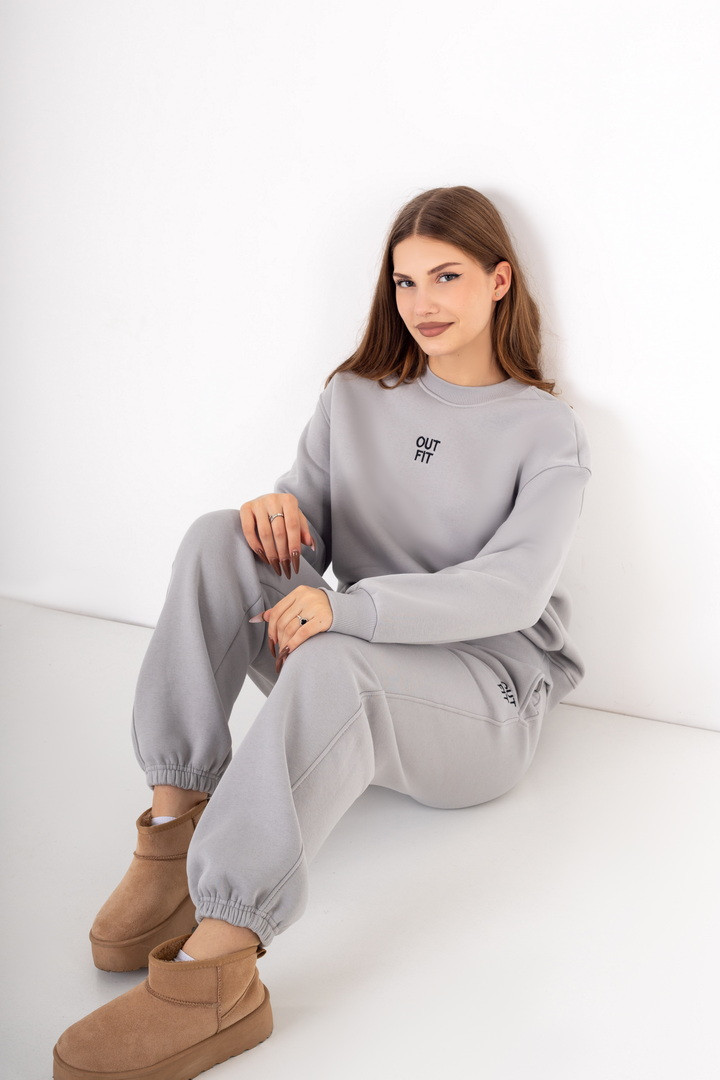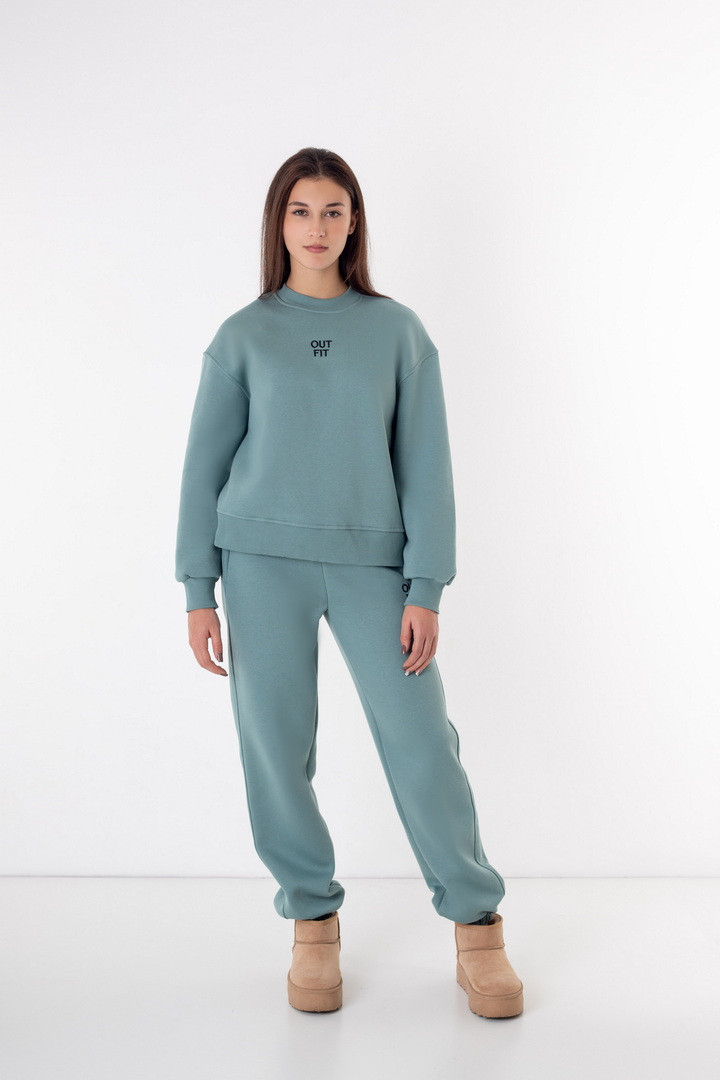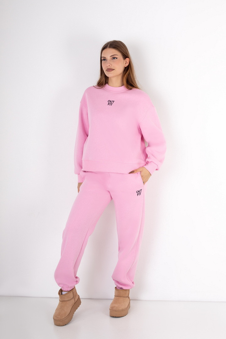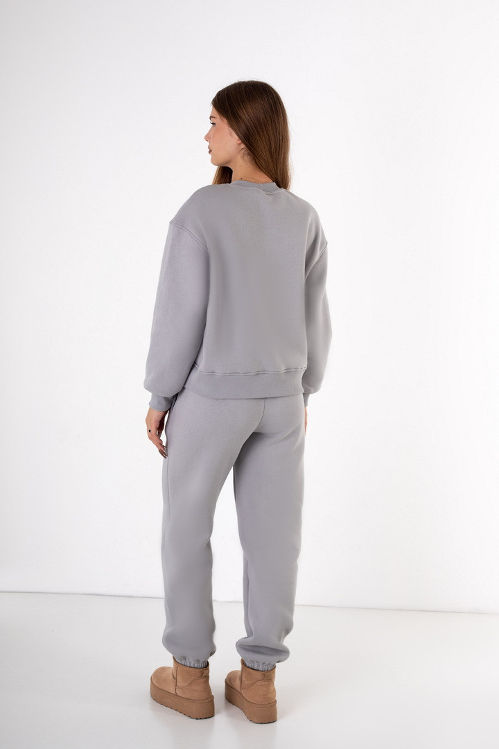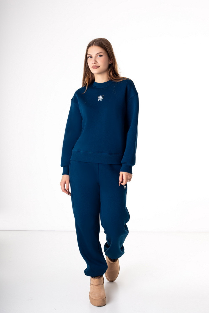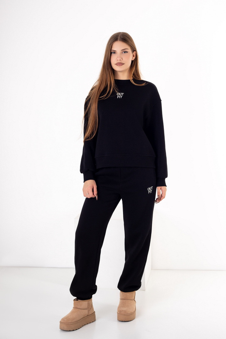 Жіночий костюм з футера тринитки — стильний і комфортний вибір для повсякденного образу. Костюм складається зі світшота вільного крою та штанів із манжетами. Світшот має спущену лінію плеча, круглу горловину та невелику вишивку на грудях. Штани оснащені зручним поясом на резинці та кишенями з боків, що додають практичності. М’яка, приємна на дотик тканина забезпечує тепло і комфорт у прохолодну пору року. Ідеально підходить для прогулянок, відпочинку або стильного casual-луку.