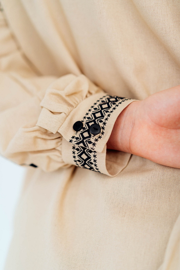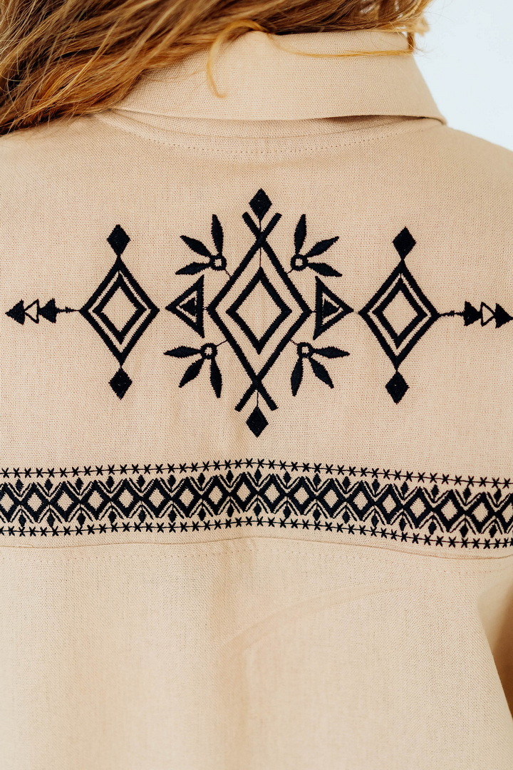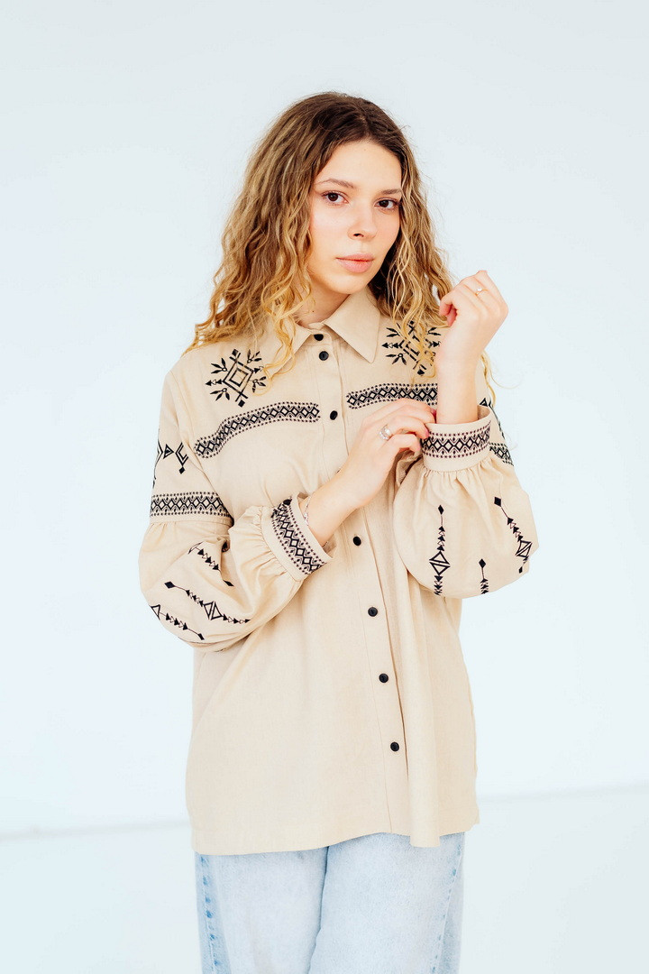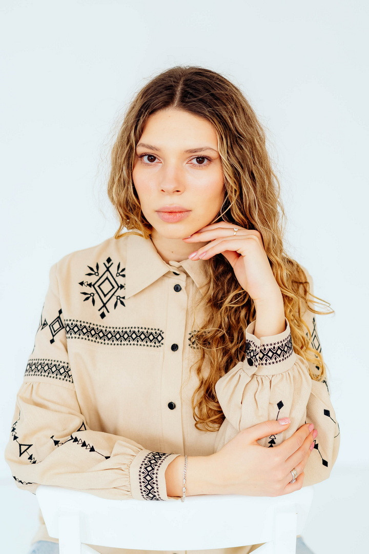 Вишукана жіноча сорочка, в якій поєднуються сучасна естетика, стриманий мінімалізм та глибока символіка української культури. Це не просто одяг — це історія, закладена у візерунках. Геометричний орнамент створений на основі символів Трипільської культури — однієї з найдавніших цивілізацій на українських землях. Трипільці сформували унікальну мову знаків, що стала основою для багатьох народних традицій, зокрема писанкарства та вишивки. Делікатна вишивка гармонійно розташована на грудях і рукавах, підкреслюючи витонченість силуету та додаючи образу глибини та характеру. Акуратний комір та продуманий крій роблять сорочку універсальною — вона доречно виглядає не тільки у повсякденних, а й у більш елегантних образах. Лляна тканина дарує відчуття легкості та комфорту, дозволяє шкірі дихати й забезпечує приємні відчуття протягом усього дня. Ця модель — про стиль, зміст і любов до української спадщини в кожній деталі.