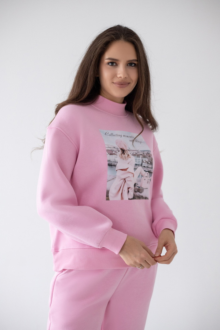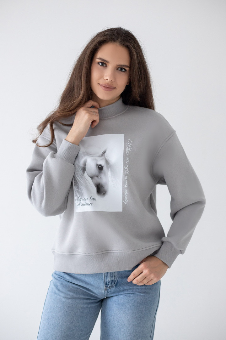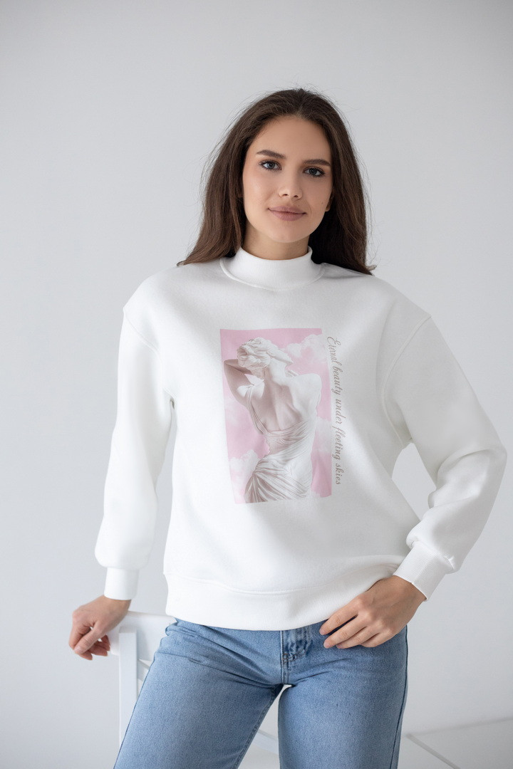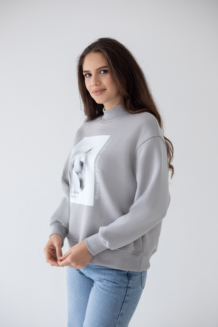 Жіночий світшот із м’якого трикотажу тринитка футер з начосом — стильна та зручна річ, яка поєднує комфорт і сучасний дизайн. Модель має вільний крій, що не сковує рухів і підходить для будь-якої фігури. Комір-стійка, манжети та нижня частина виробу виконані на еластичній резинці, завдяки чому світшот добре тримає форму. На передній частині розміщений яскравий принт, який надає виробу індивідуальності та створює настрій.