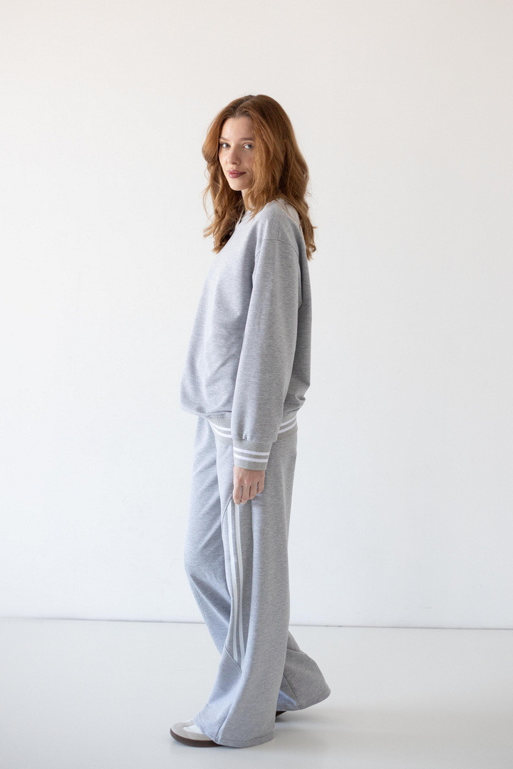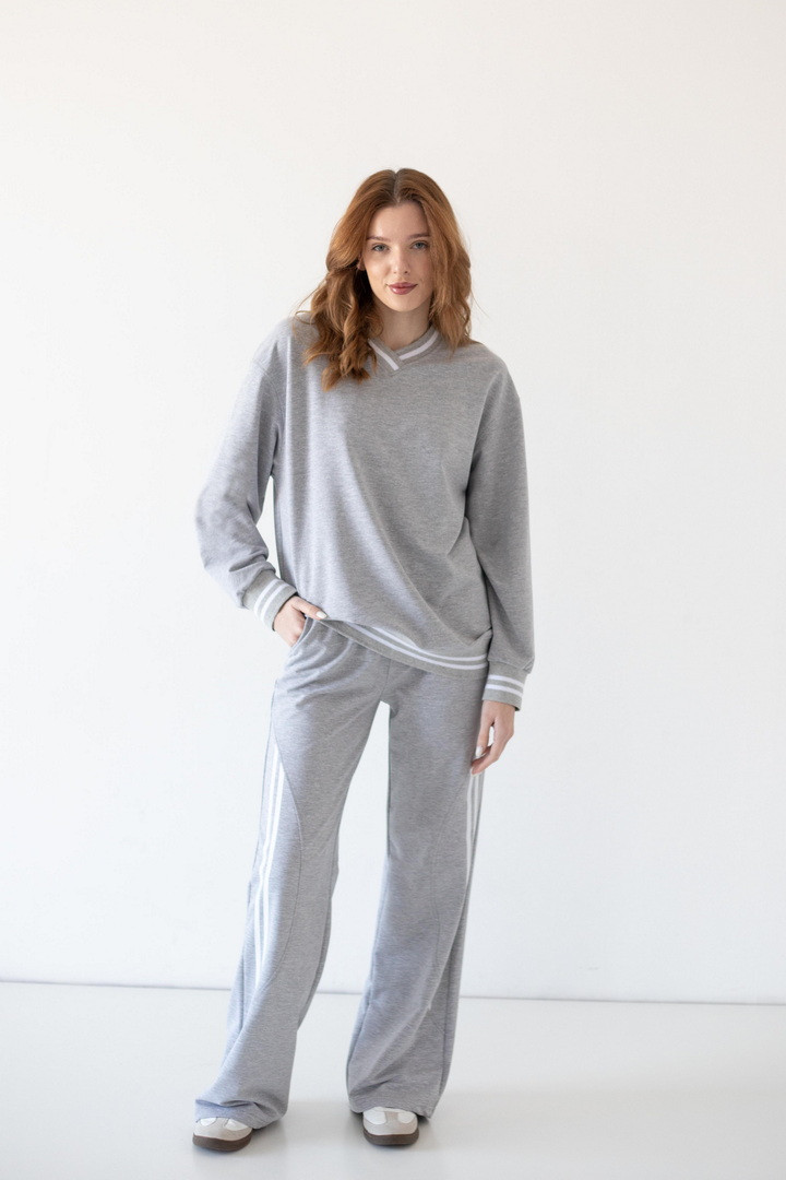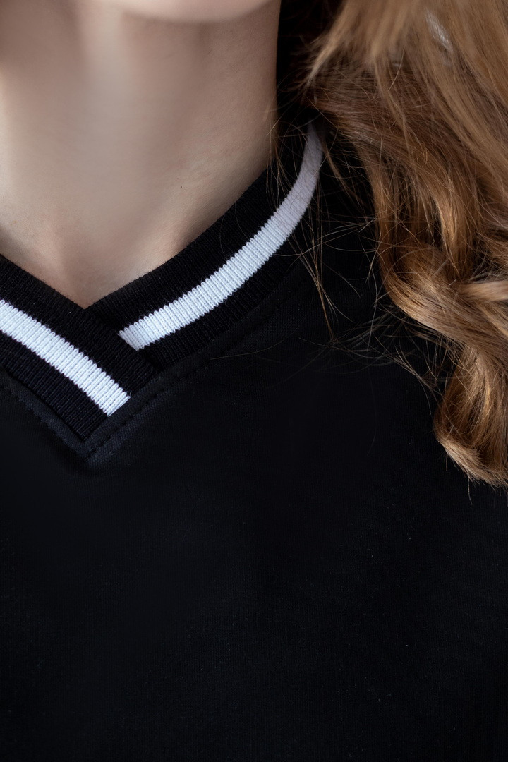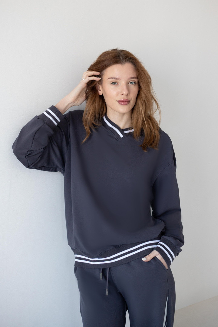 Стильний жіночий світшот із двониткового футера — це річ, яка легко стане улюбленою частиною гардероба. Він створений для тих, хто цінує сучасний вигляд та комфорт. М’яка, приємна на дотик тканина, делікатно огортає тіло, даруючи відчуття затишку та легкості. Двонитковий футер відзначається міцністю та гарною еластичністю. У такому світшоті комфортно протягом усього дня — від ранкових справ до вечірніх прогулянок. Продуманий крій забезпечує гарну посадку, виглядає акуратно та водночас створює модний розслаблений силует. Лінія плеча м’яко спущена, що додає образу легкості та невимушеності. Особливу увагу привертає горловина — стильний V-подібний виріз із трикотажною еластичною вставкою. Контрастні смужки на комірі додають спортивного шику та роблять модель більш виразною. Рукава з манжетами на резинці, які декоровані контрастними смугами, гармонійно перегукуються з оформленням горловини. Це більше, ніж просто одяг — це річ, яка дарує впевненість, підкреслює індивідуальність і робить кожен день трохи комфортнішим.