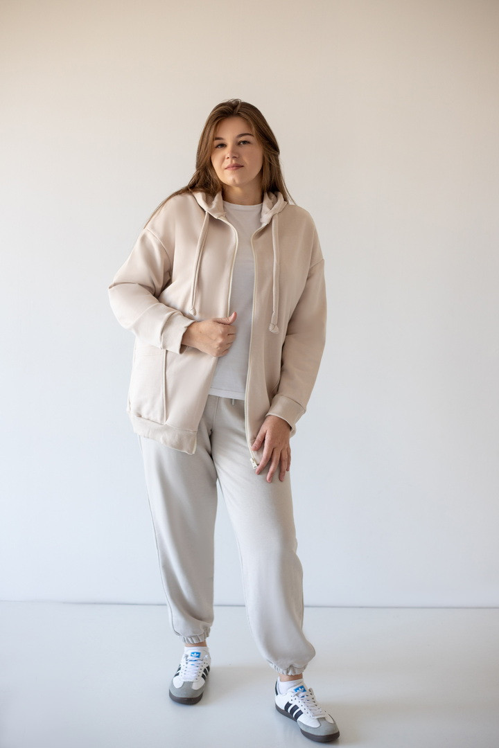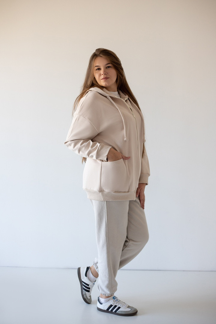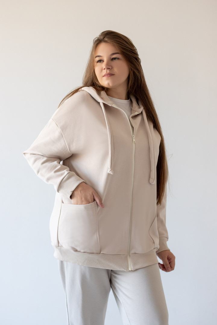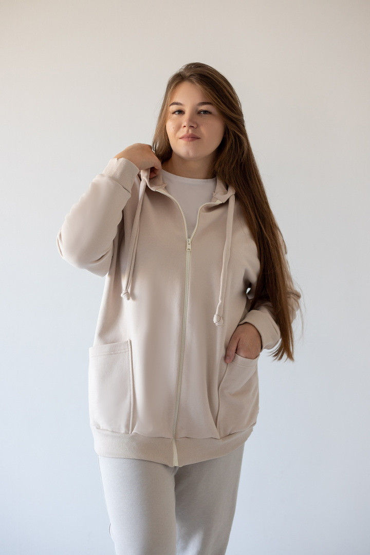 Базова жіноча толстовка на блискавці з полотна "Тринитка петля" з довгими рукавами на манжетах, капюшоном зі шнуром, а також кишенями-кенгуру. Модель досить універсальна, комбінується зі спортивними штанами, джинсами, шортами. Підходить для щоденного носіння навесні, восени, прохолодним літом, для вечірніх прогулянок - "must have" в гардеробі кожної жінки.
