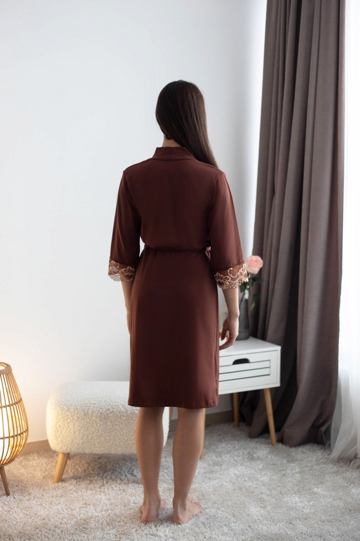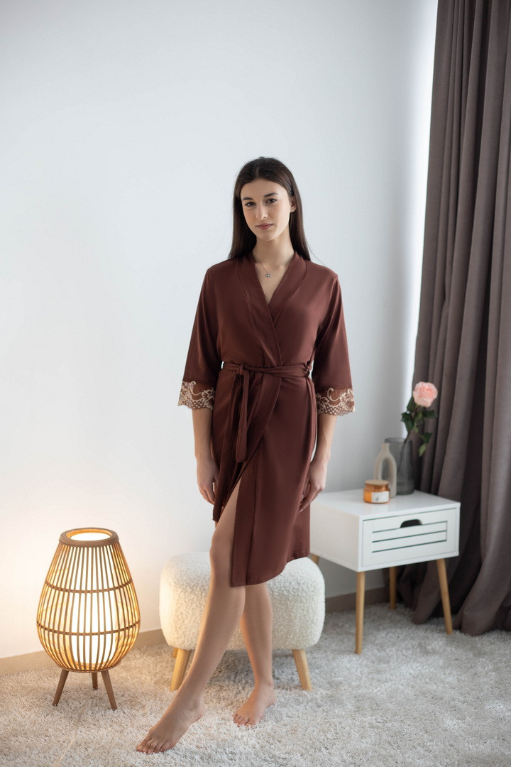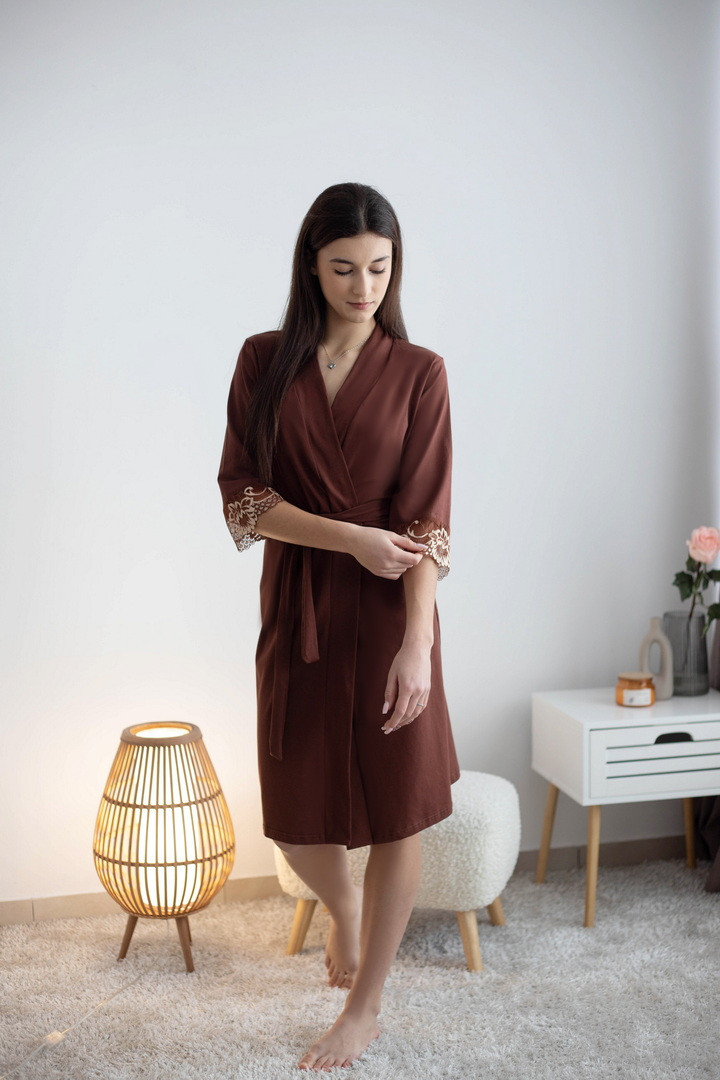 Жіночий пеньюар створений для моментів, коли хочеться виглядати бездоганно навіть вдома. Легкий, м’який і неймовірно комфортний, він красиво лягає по фігурі, підкреслюючи жіночність. Завдяки стрейч-куліру пеньє, тканина ніжно обіймає тіло, даруючи відчуття затишку з першого дотику. Ефектний крій додає образу витонченості та дозволяє легко регулювати посадку. Пояс на талії формує гарний силует і підкреслює лінії фігури. А розкішні мереживні манжети на рукавах створюють той самий “вау-ефект”, який перетворює звичайний домашній одяг на стильний елемент жіночого гардеробу. Цей пеньюар ідеально підійде як для щоденного комфорту, так і для особливих вечорів — коли хочеться бути ніжною, впевненою та неймовірно красивою.