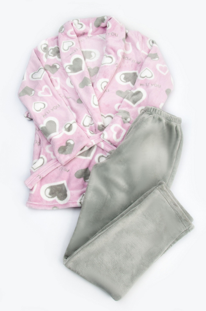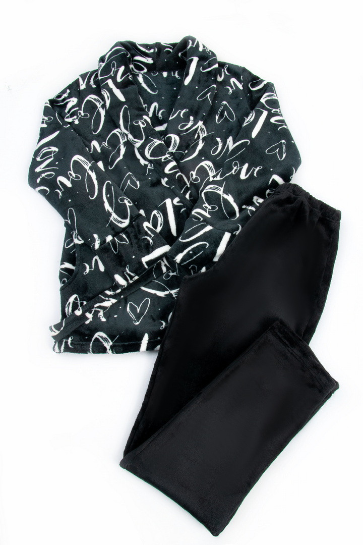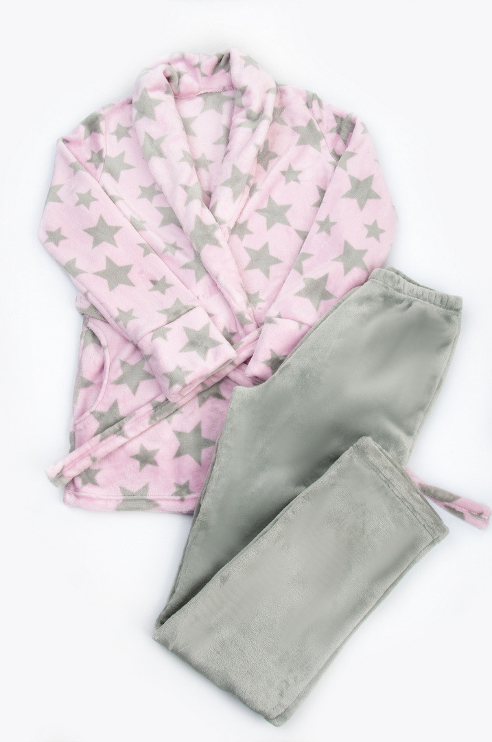 Теплий, зручний комплект із комбінованого велсофту ідеально підходить для жінок. Комплект складається з укороченого халата з коміром-шалькою, кишень і поясу, а також прямих широких штанів на еластичній резинці по талії. Халат виконаний із принтованого полотна, штани – однотонні контрастні. Велсофт дуже практичний у використанні, має відмінні теплоізоляційні властивості, стійкий до деформації, не дає усадки після прання, не линяє, м'який ворс не скочується і не затирається. При правильному догляді виріб із цього полотна радуватиме свою володарку не один сезон.