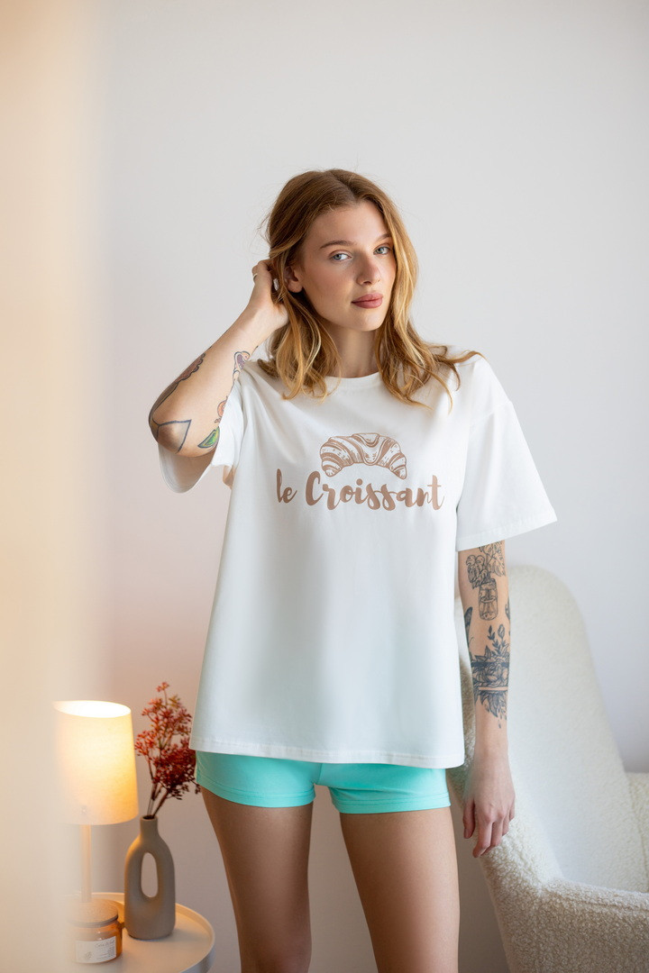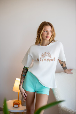 Комплект виконаний зі стрейч-куліра пеньє. Полотно високої якості, м'яке, приємне до тіла, натуральне за складом. Комплект складається із футболки та шортів. Футболка з однотонного полотна, із округлою горловиною, по переду нанесений накат. Шорти з однотонного полотна.