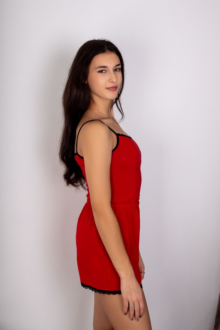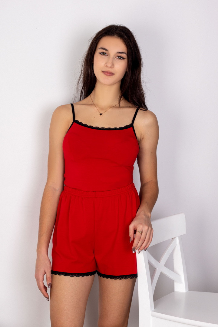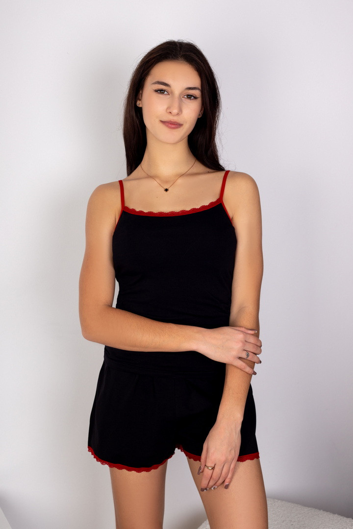 Жіночий домашній комплект "стрейч-кулір", що складається з майки на тонких бретельках та шортів, створений для максимального комфорту та легкості. Майка має зручний приталений крій, м’яко підкреслює силует. Тонкі бретелі забезпечують делікатну посадку та акуратний вигляд. Шорти виконані у вільному, комфортному фасоні, не натирають і не тиснуть, завдяки чому підходять для сну, відпочинку вдома або спокійних вечірніх рутин. Тканина приємна на дотик, дихає та добре тримає форму, даруючи відчуття легкості протягом усього дня. Комплект універсальний, стильний та практичний — ідеальний варіант для дому.